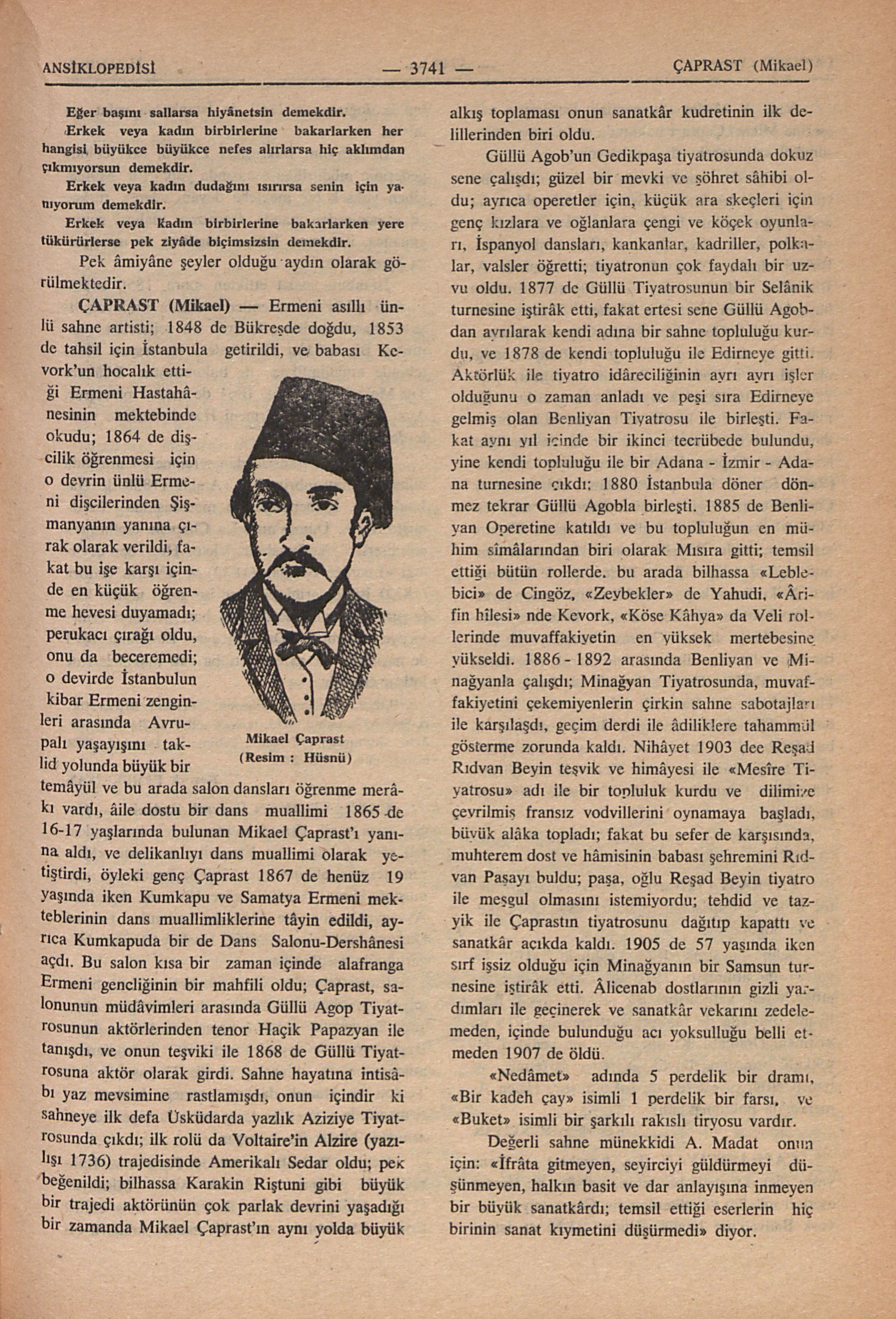 Ermeni asıllı ünlü sahne artisti; 1848 de Bükreşde doğdu, 1853 de tahsil için İstanbula getirilirdi, ve babası Kevork’un hocalık ettiği Ermeni Hastahânesinin mektebinde okudu, 1864 de dişcilik öğrenmesi için o devrin ünlü Ermeni dişcilerinden Şişmanyanın yanına çıkarak olarak verildi, fakat bu işe karşı içinde en küçük öğrenme hevesi duyamadı; perukacı çırağı oldu, onu da beceremedi, o devirde İstanrbulun kibar Ermeni zenginleri arasında Avrupalı yaşayışını taklid yolunda büyük bir temâyül ve bu arada salon dansları öğrenme merâkı vardı, âile dostu bir dans muallimi 1865 de 16-17 yaşlarında bulunan Mikael Çaprast’ı yanına aldı, ve delikanlıyı dans muallimi olarak yetiştirdi, öyleki genç Çaprast 1864 de henüz 19 yaşında iken Kumkapu ve Samatya Ermeni mekteblerinin dans muallimliklerine tâyin edildi, ayrıca Kumkapuda bir de Dans Salonu-Dershânesi açdı. Bu salon kısa bir zaman içinde alafranga Ermeni gencliğinin bir mahfili oldu; Çaprast, salonunun müdâvimleri arasında Güllü Agop Tiyatrosunun aktörlerinden tenor Haçik Papazyan ile tanışdı, ve onun teşviki ile 1868 de Güllü Tiyatrosuna aktör olarak girdi. Sahne hayatına intisâbı yaz mevsimine rastlamışdı, onun içindir ki sahneye ilk defa Üsküdarda yazlık Aziziye Tiyatrosunda çıkdı; ilk rolü de Voltaire’in Alzire (yazılışı 1736) traje...