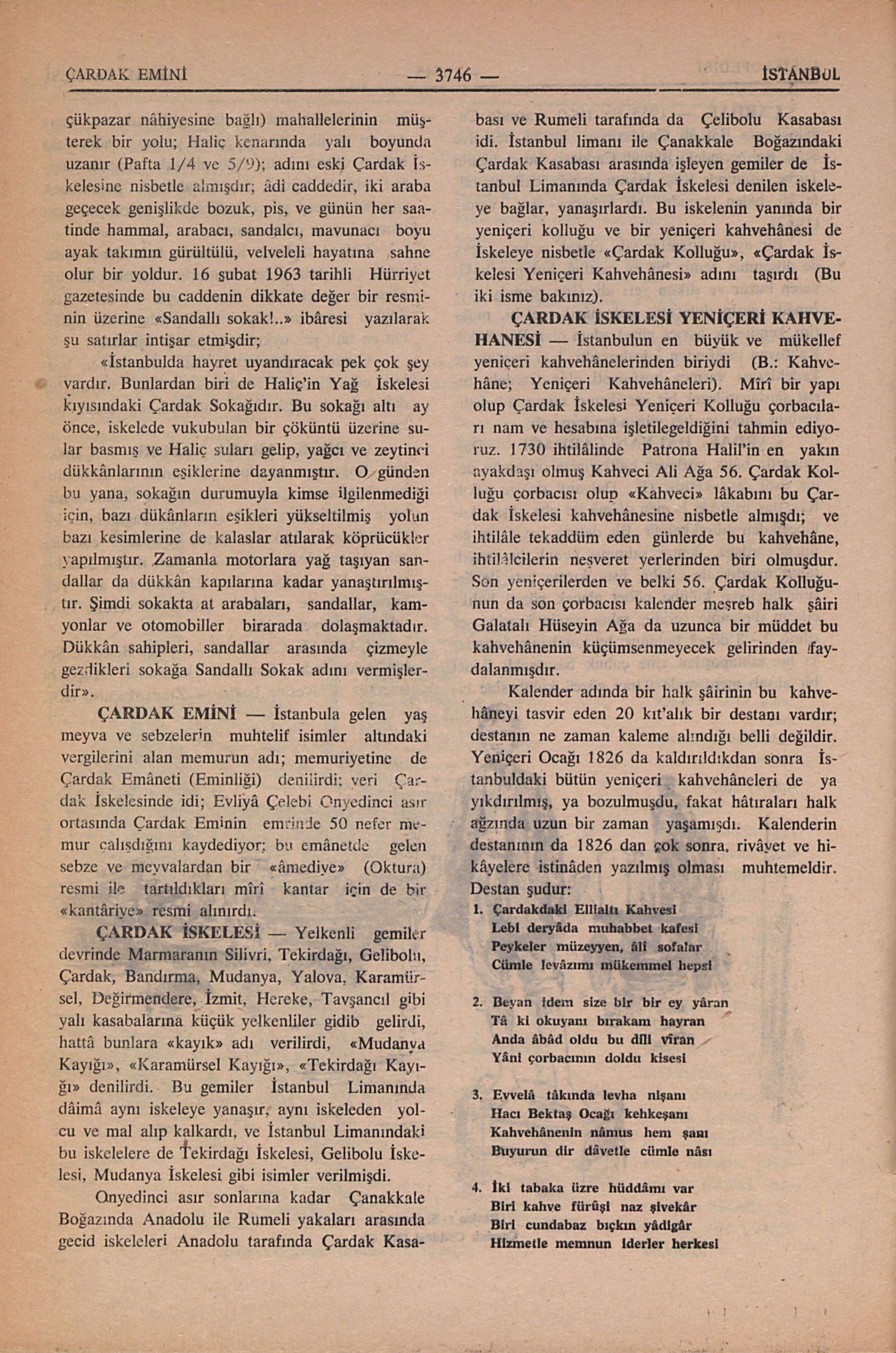 “İstanbulda hayret uyandıracak pek çok şey vardır. Bunlardan biri de Haliç’in Yağ İskelesi kıyısındaki Çardak Sokağıdır. Bu sokağı altı ay önce, iskelede vukubulan bir çöküntü üzerine sular basmış ve Haliç suları gelip, yağcı ve zeytinci dükkânlarının eşiklerine dayanmıştır. O günden bu yana, sokağın durumuyla kimse ilgilenmediği için, bazı dükkânların eşikleri yükseltilmiş yolun bazı kesimlerine de kalaslar atılarak köprücükler yapılmıştır. Zamanla motorlara yağ taşıyan sandallar da dükkân kapılarına kadar yanaştırılmıştır. Şimdi sokakta at arabaları, sandallar, kamyonlar ve otomobiller birarada dolaşmaktadır. Dükkân sahipleri, sandallar arasında çizmeyle gezdikleri sokağa Sandallı Sokak adını vermişlerdir”.