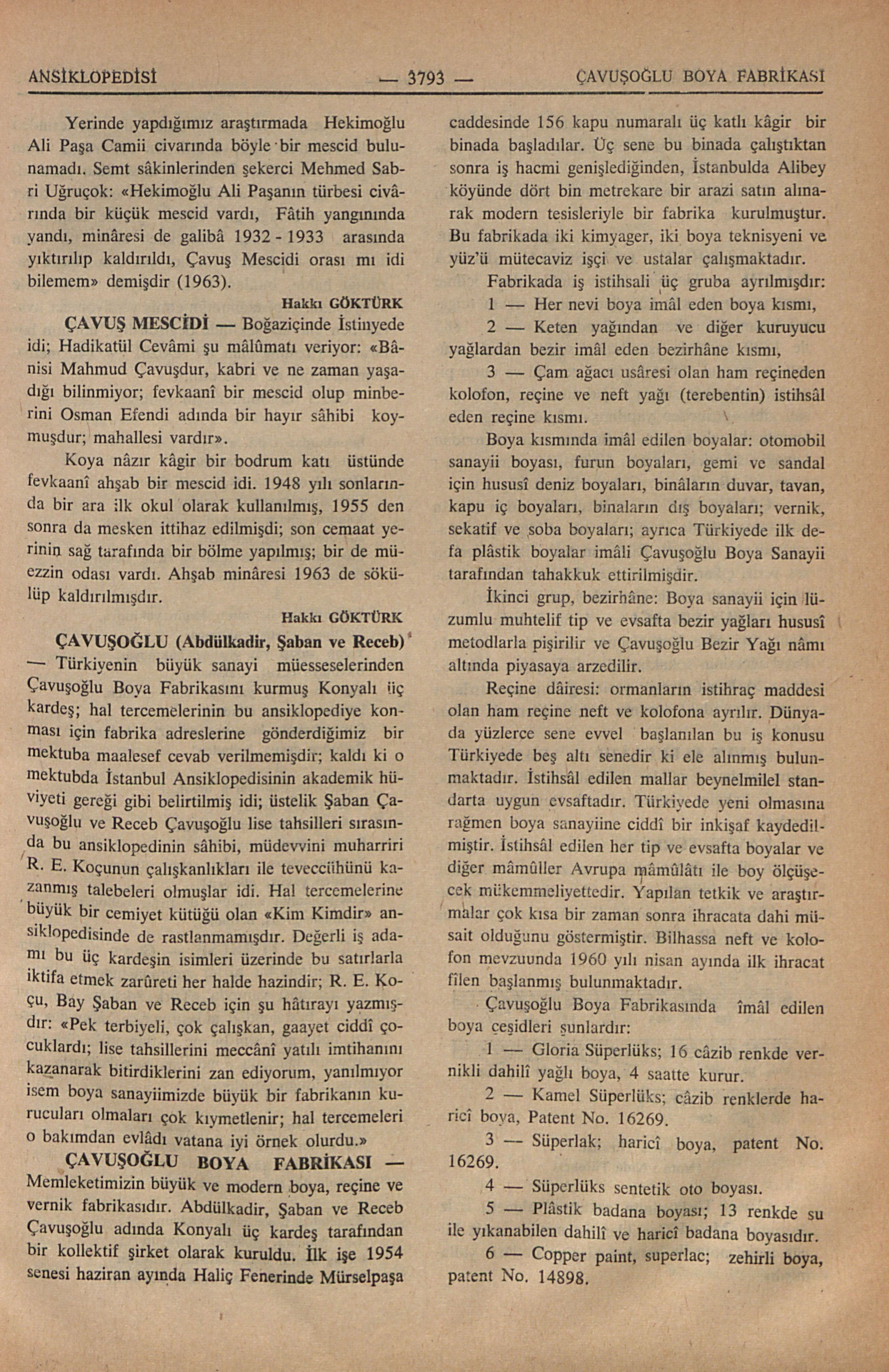 Memleketimizin büyük ve modern boya, reçine ve vernik fabrikasıdır. Abdülkadir, Şaban ve Receb Çavuşoğlu adında Konyalı üç kardeş tarafından bir kollektif şirket olarak kuruldu. İlk işe 1954 senesi haziran ayında Haliç Fenerinde Mürselpaşa caddesinde 156 kapu numaralı üç katlı kâgir bir binada başladılar. Üç sene bu binada çalıştıktan sonra iş hacmi genişlediğinden, İstanbulda Alibey köyünde dört bin metrekare bir arazi satın alınarak modern tesisleriyle bir fabrika kurulmuştur. Bu fabrikada iki kimyager, iki boya teknisyeni ve yüz’ü mütecaviz işçi ve ustalar çalışmaktadır.