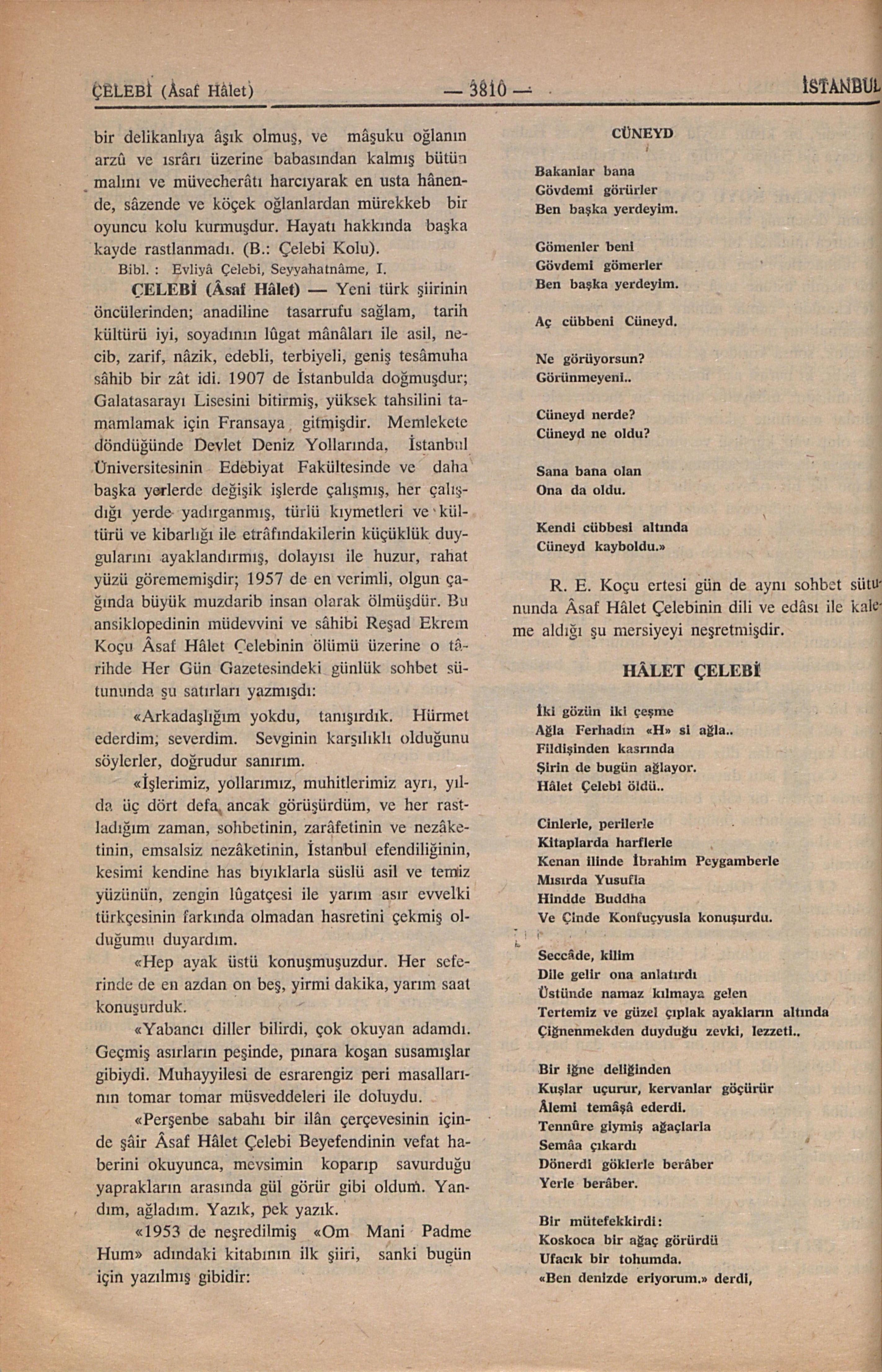 R. E. Koçu ertesi gün de aynı sohbet sütununda Âsaf Hâlet Çelebinin dili ve edâsı ile kaleme aldığı şu mersiyeyi neşretmişdir.