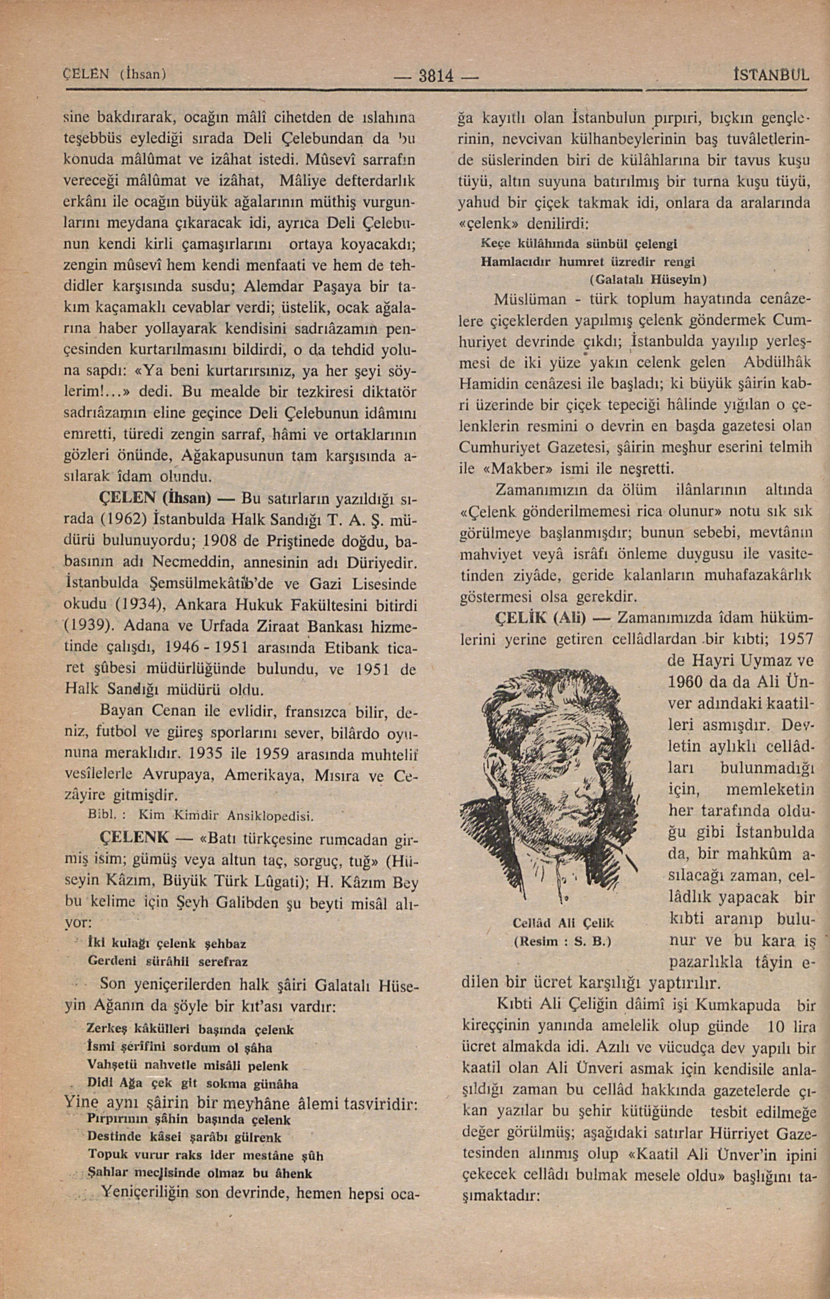 Zamanımızda îdam hükümlerini yerine getiren cellâdlardan bir kıbti; 1957 de Hayri Uymaz ve 1960 da da Ali Ünver adındaki kaatilleri asmışdır. Devletin aylıklı cellâdları bulunmadığı için, memleketin her tarafından olduğu gibi İstanbulda da, bir mahkûm asılacağı zaman, cellâdlık yapacak bir kıbti aranıp bulunur ve bu kara iş pazarlıkla tâyin edilen bir ücret karşılığı yaptırılır.