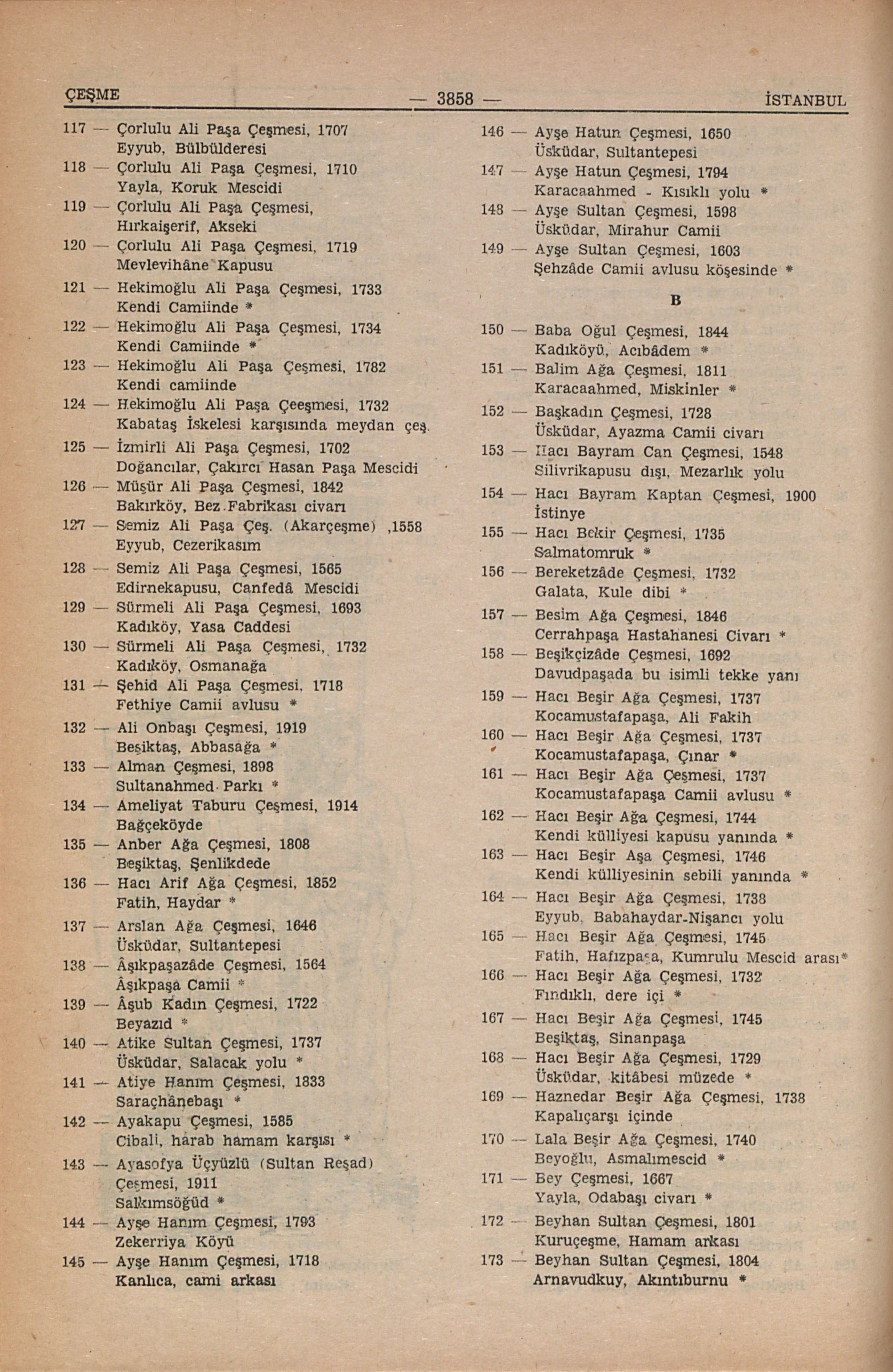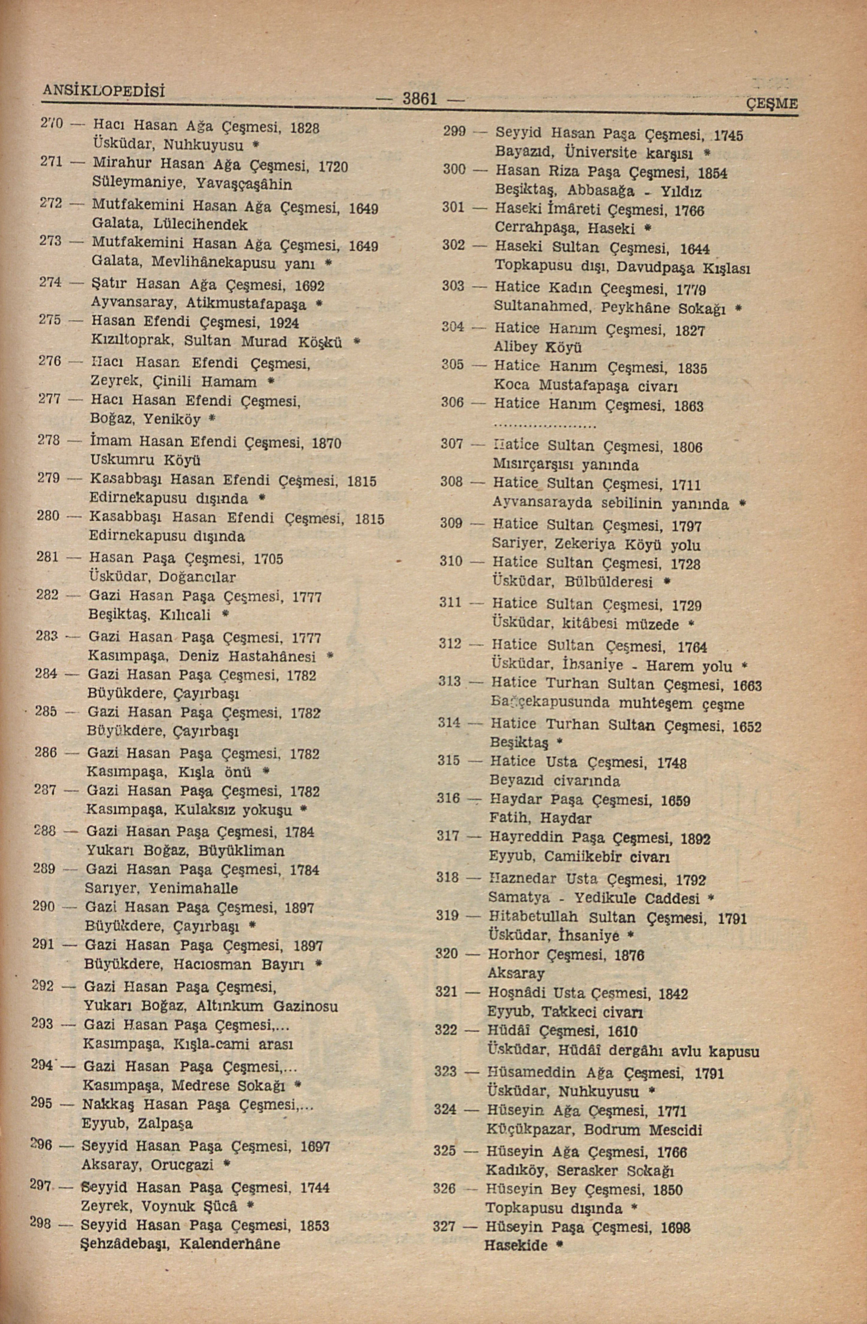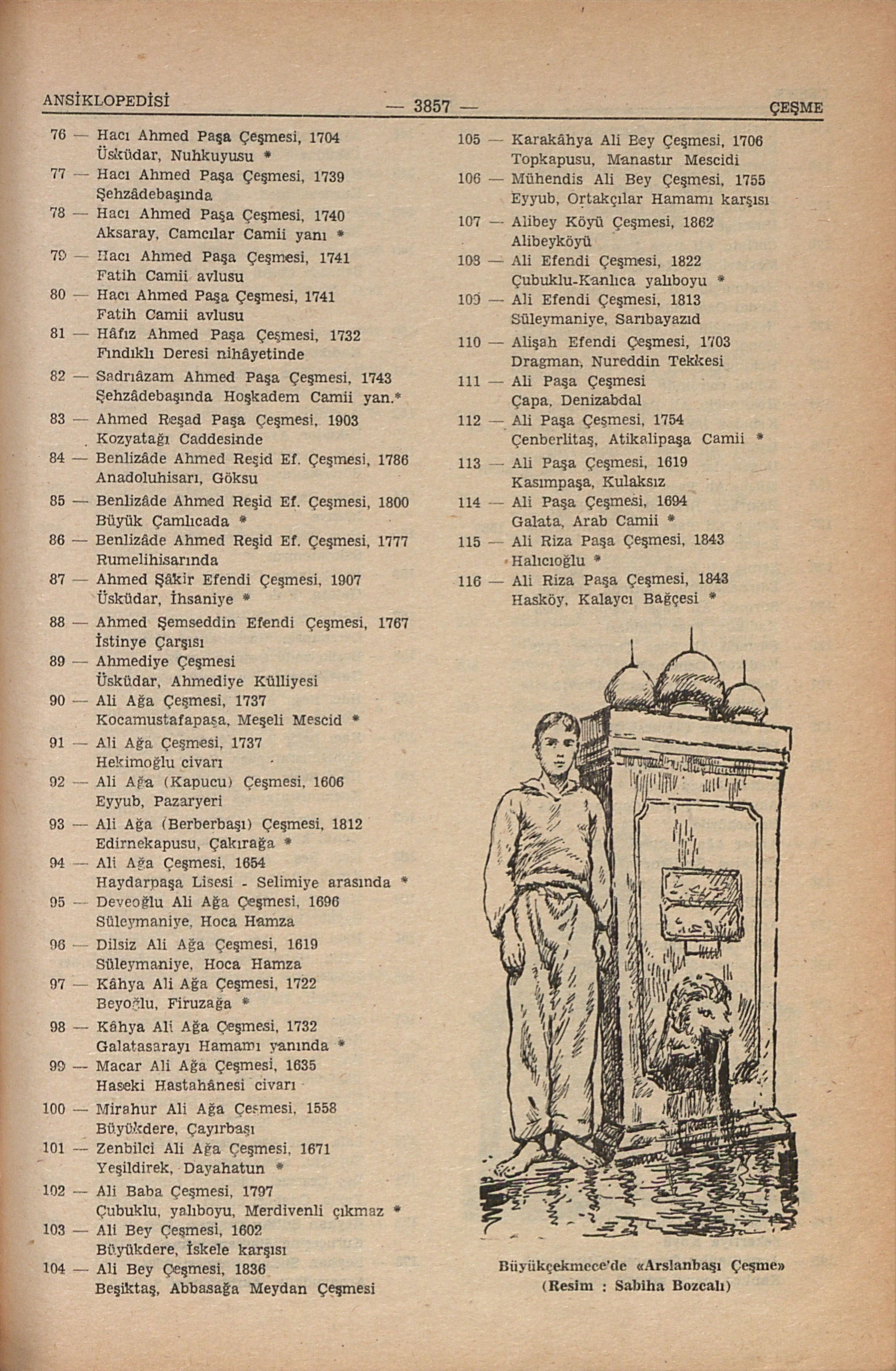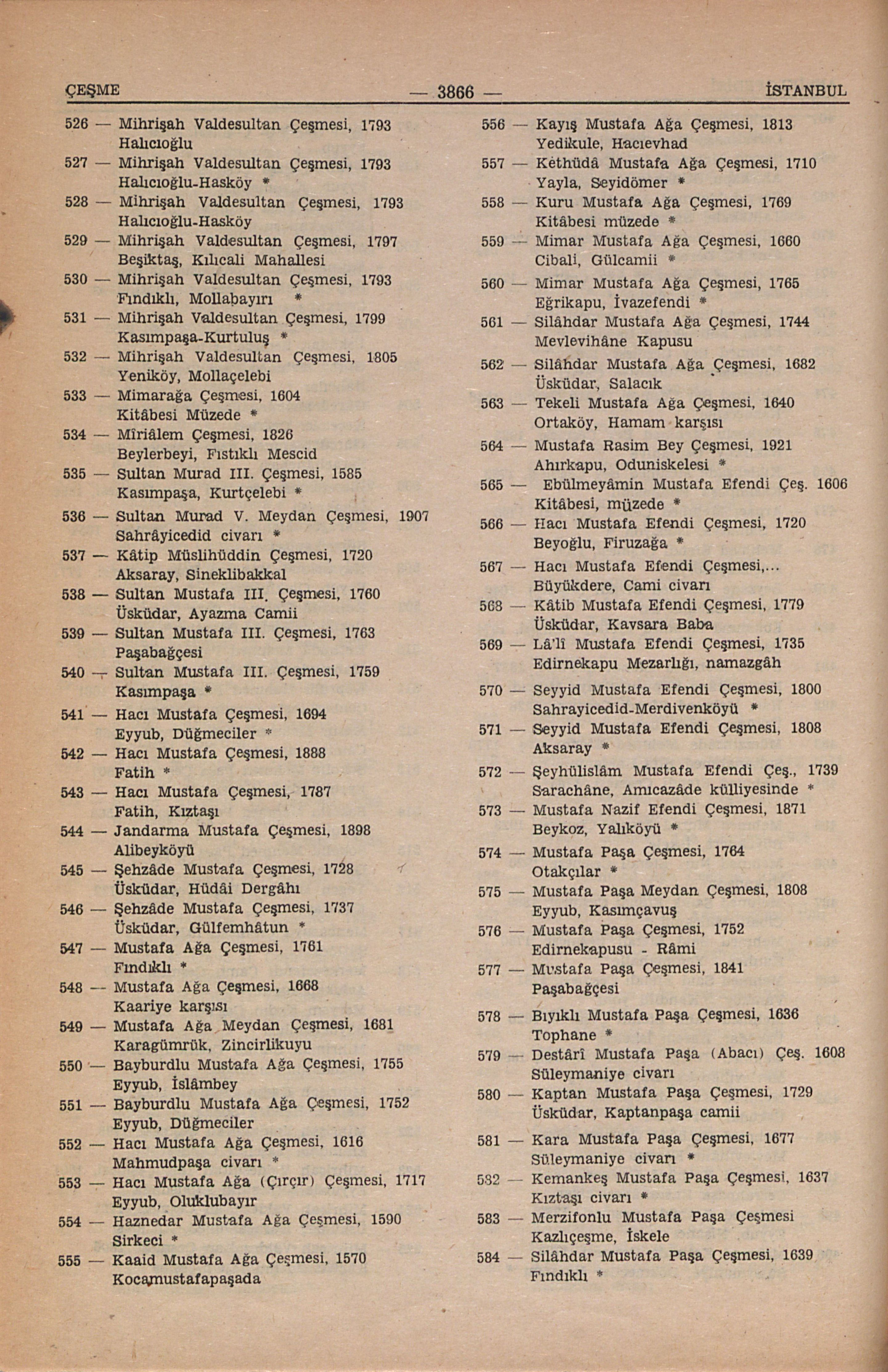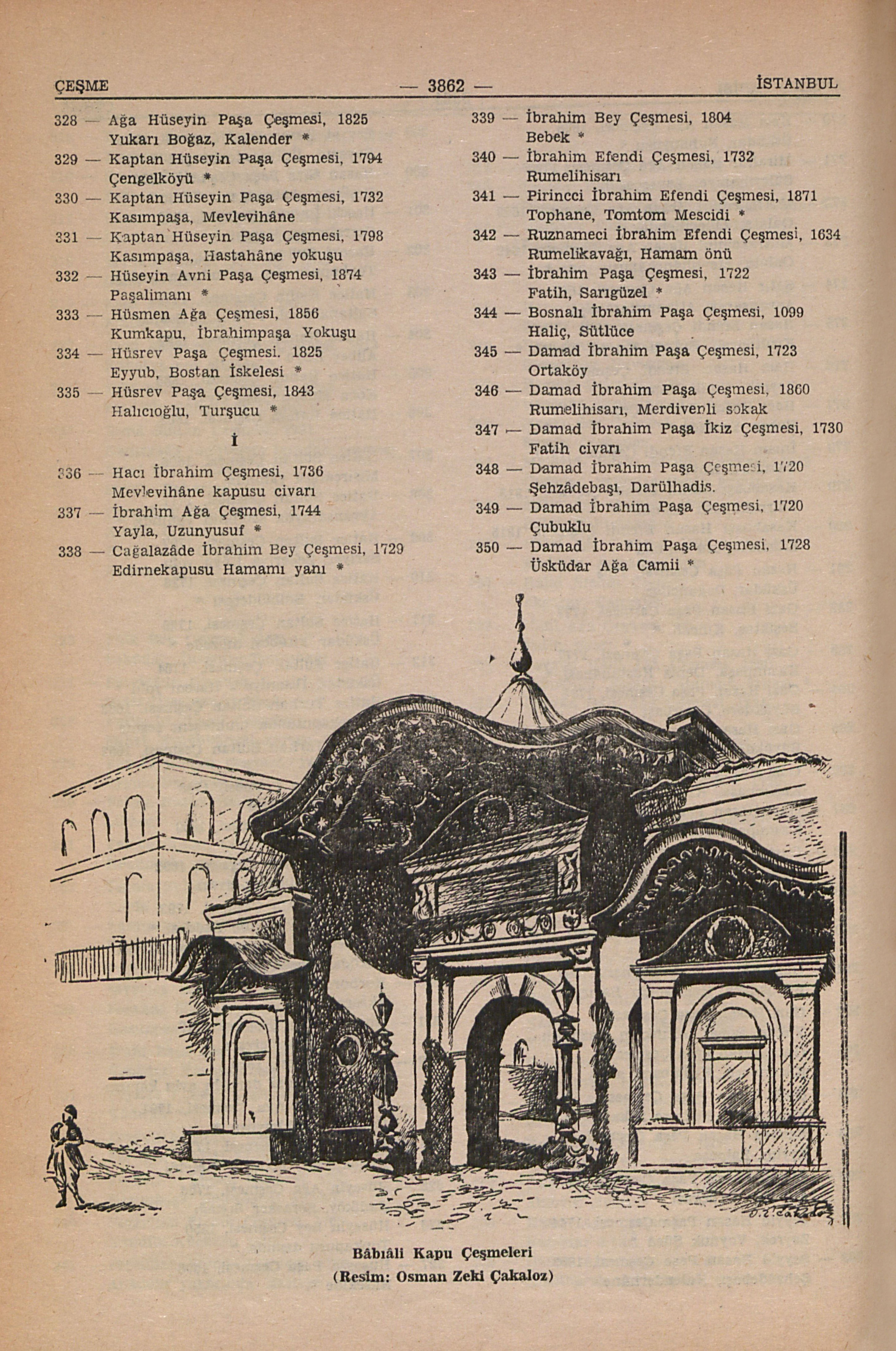 Başda Evliyâ Çelebi, “Hadikatül Cevâmi” müellifi Ayvasaraylı Hüseyin Efendi, “İstanbul ve Boğaziçi” müellifi Mehmed Ziya Bey, “Mir’atı İstanbul” müellifi Mehmed Râif Bey gibi İstanbul üzerine eser bırakmış yazarlarımız büyük şehrin çeşmelerinden de bahsetmişlerdir; fakat İstanbul’un çeşmelerini istiklâl ile bir tedkik konusu olarak ele alan ve bu yolda “İstanbul Çeşmeleri” adı ile iki cild hâlinde ilk eseri ortaya koyan, bu İstanbul Ansiklopedisi’nin de yazı âilesi arasında bulunmuş sayın İbrahim Hilmi Tanışık olmuşdur (B.: Çeşme, “İstanbul Çeşmeleri” Tanışık, İbrahim Hilmi). Muhakkak ki İstanbul içinde ve etrâfında yıllarca dolaşmış bulunan bu değerli müdekkik iki cildlik kitabında, Topkapu Sarayı içindekiler de dahil, 793 çeşme tesbit etmişdir; İ. H. Tanışık’ın görmediği, dolayısile kitabında zikretmediği çeşmeler vardır; müellif İstanbul civârında ancak 7 köy görmüşdür (Sarıgazi, Kâğıdhâne, Alibey, Dudullu, Bulgurlu, Uskumru ve Zekeriya köyleri), İstanbul etrâfında ise iki yüzlü mütecaviz köy bulunmaktadır, kaba bir tahmin ile İstanbul çeşmelerinin sayısı 2000 de fazladır.