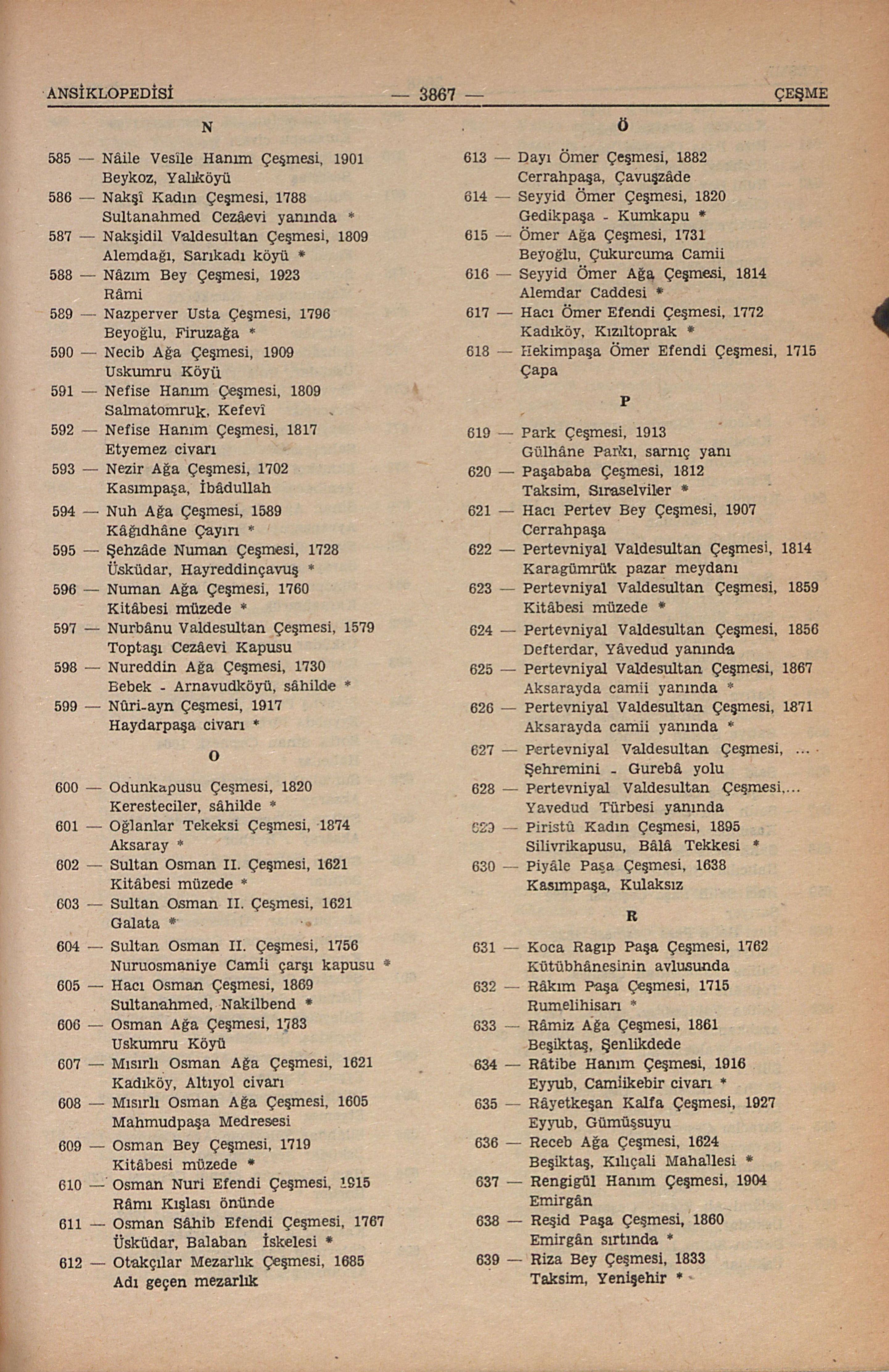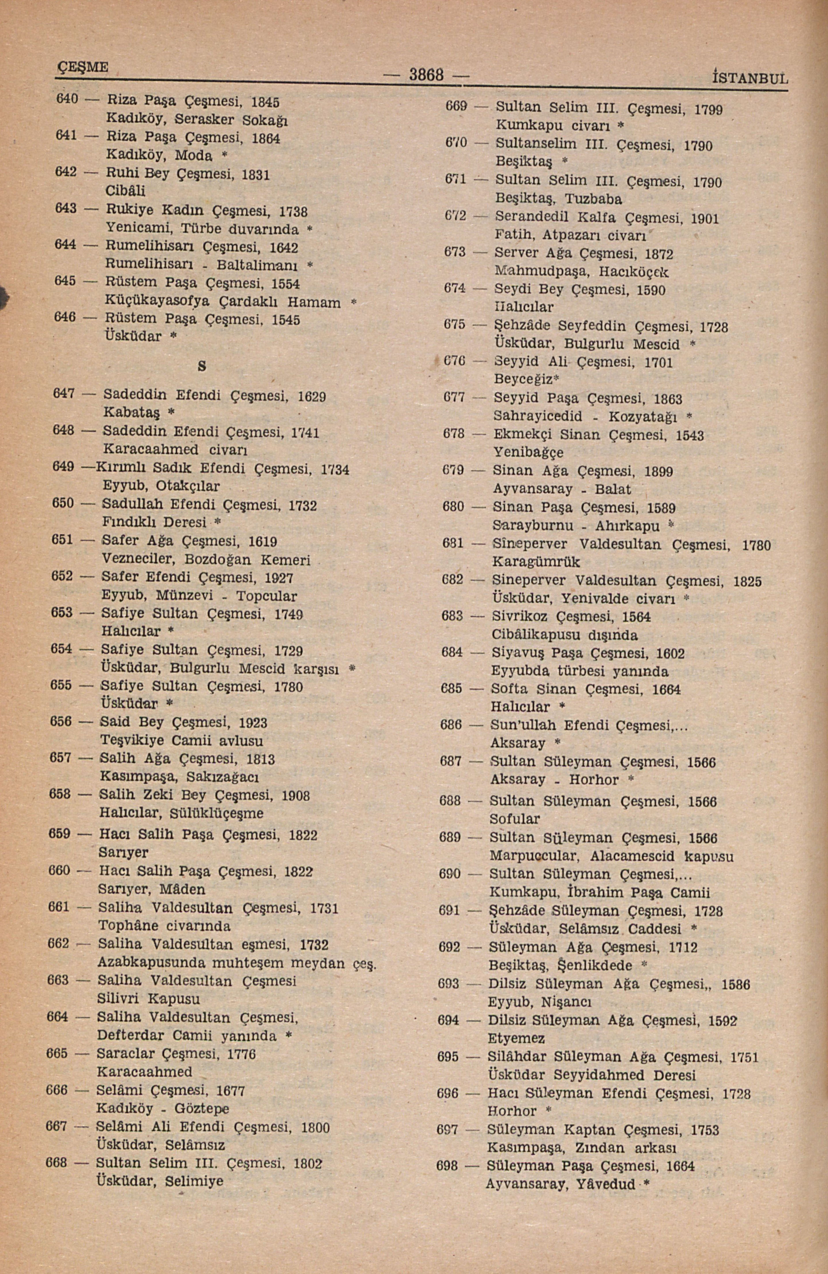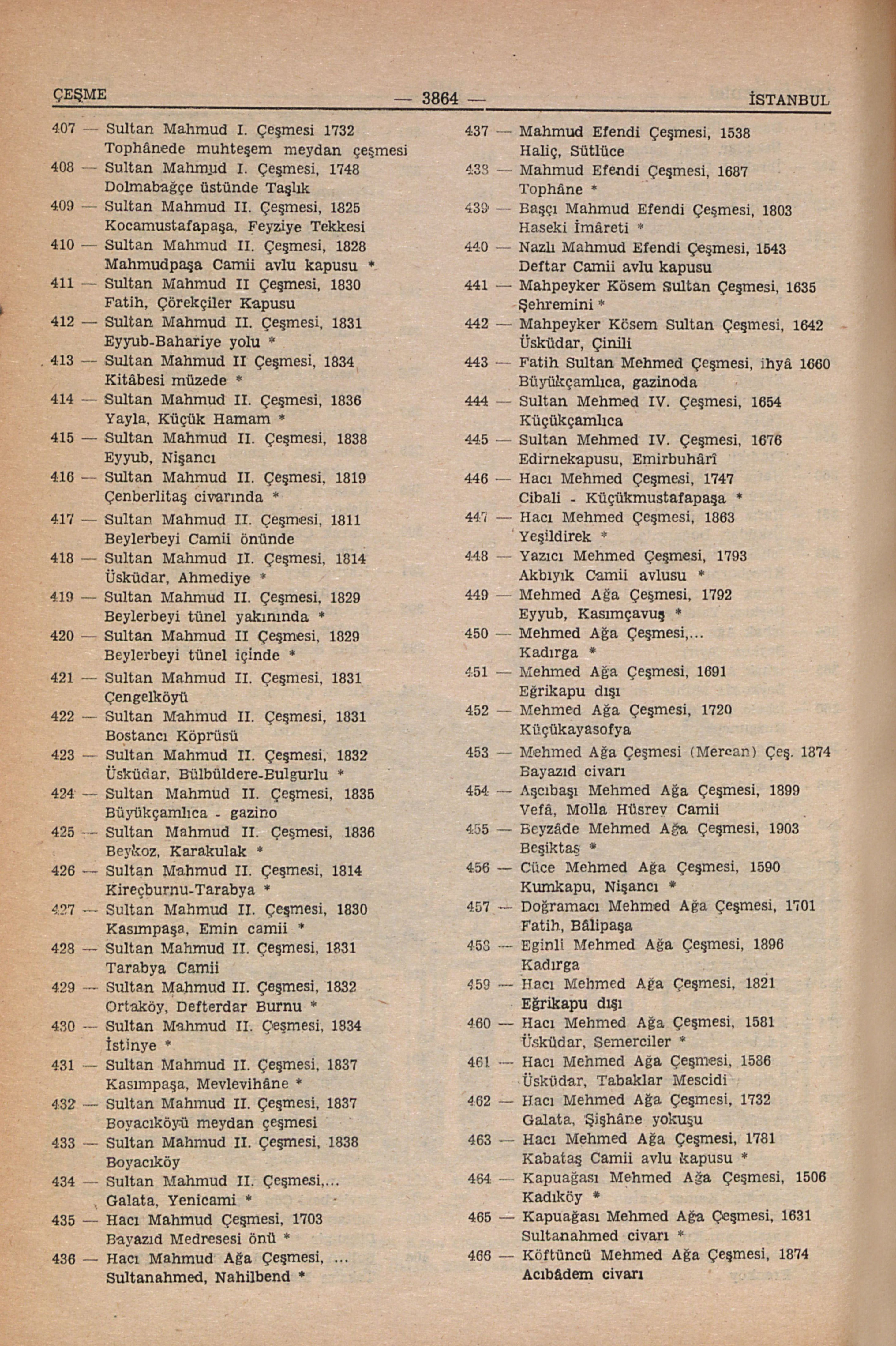 Yine aynı eserden buraya alfabetik bir liste naklediyoruz; 750 çeşmeyi ihtiva eden bu alfabetik listede, her isim için, hayır sâhiblerinin unvanlarına göre ikinci bir tasnif yapıldı; susuz,, muattal, yahud harab veya tamamen yok olmuş çeşmelere de bir “*” işareti konuldu; susuz ve muattal oldukları halde İstanbul’u tezyin eden âbidevî çeşmeler bu işâretten istisnâ edildi; Topkapu Sarayı içindeki çeşmeler de bu listeye alınmadı.