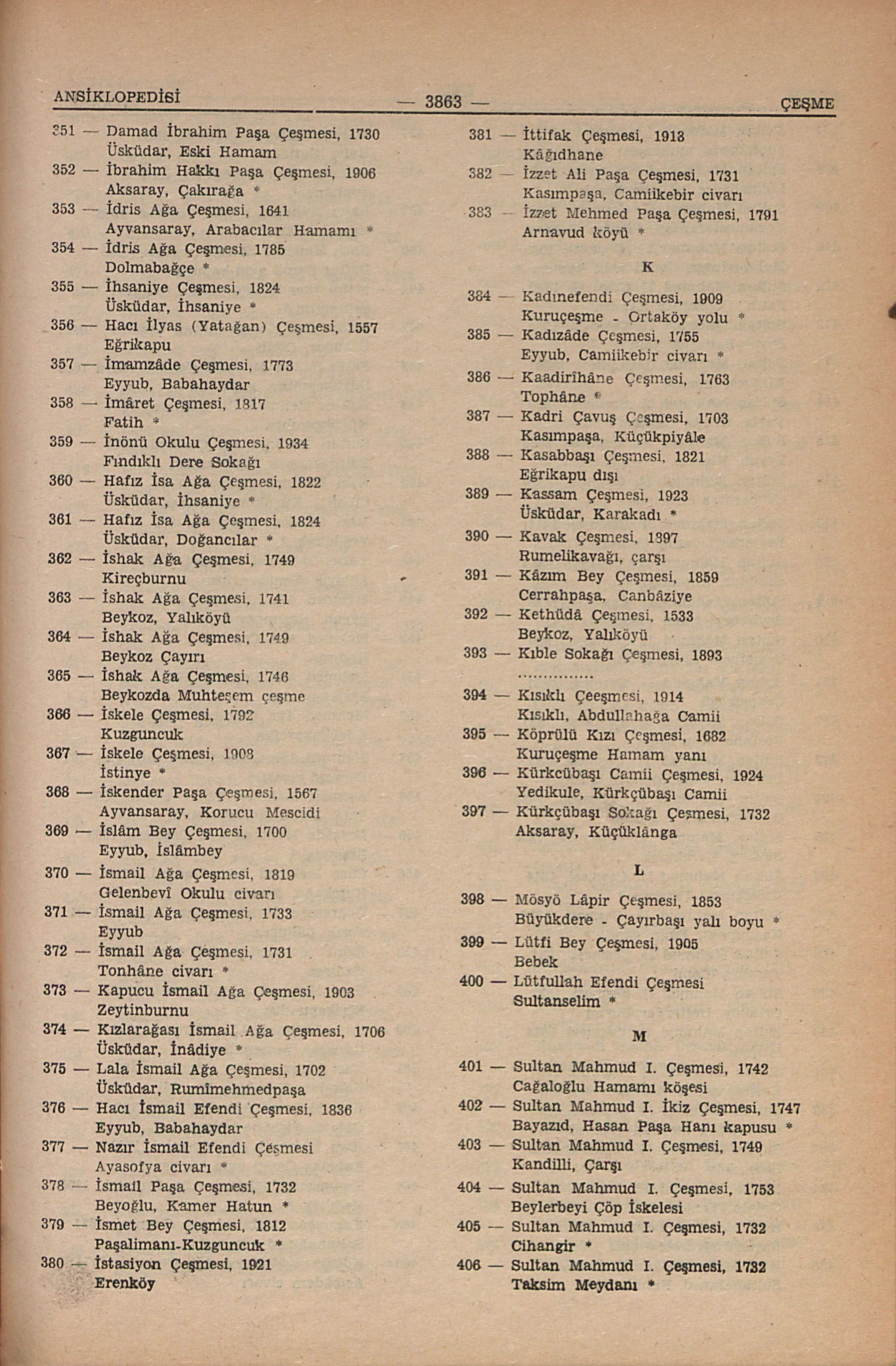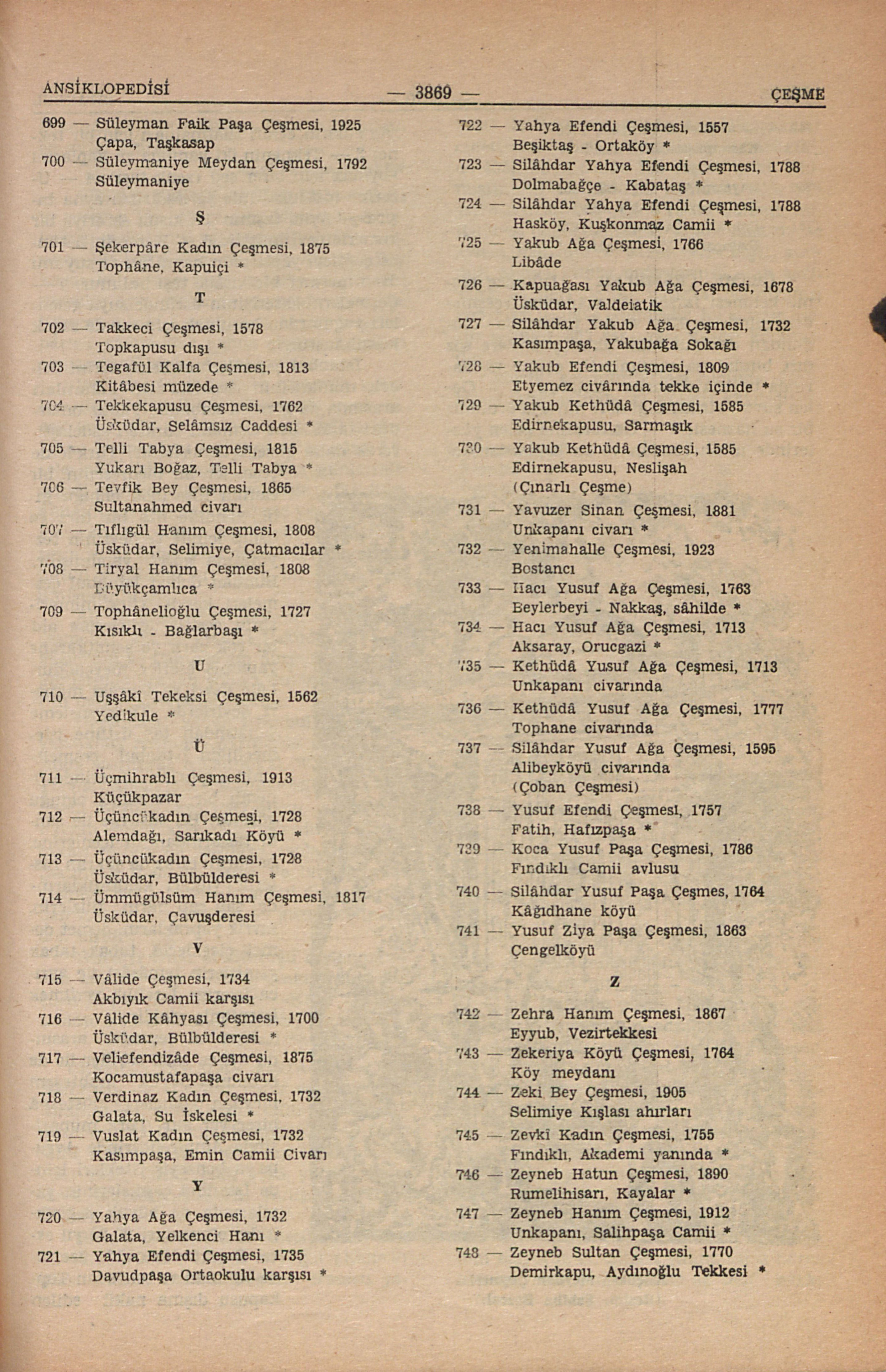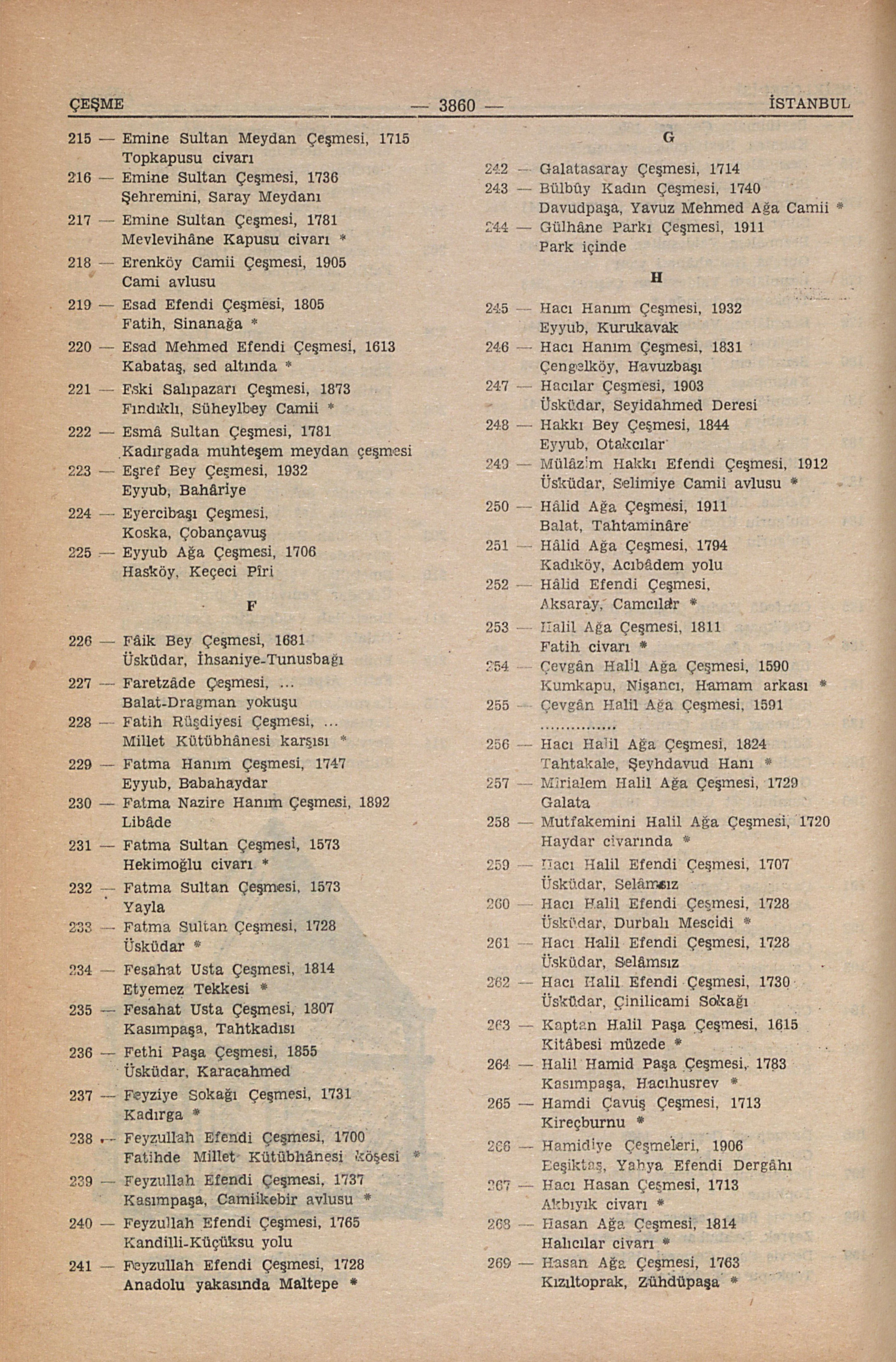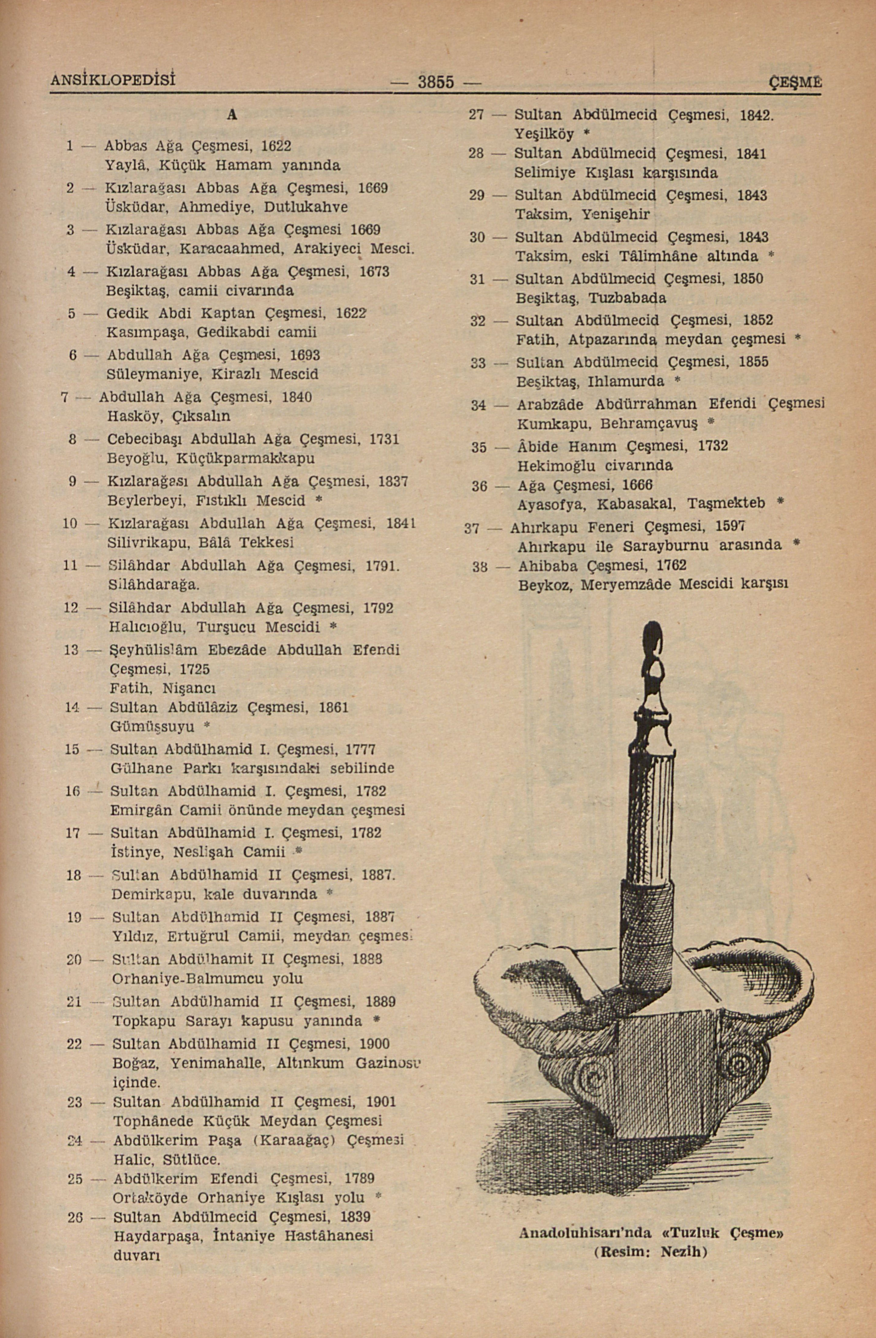 Yine aynı eserden buraya alfabetik bir liste naklediyoruz; 750 çeşmeyi ihtiva eden bu alfabetik listede, her isim için, hayır sâhiblerinin unvanlarına göre ikinci bir tasnif yapıldı; susuz,, muattal, yahud harab veya tamamen yok olmuş çeşmelere de bir “*” işareti konuldu; susuz ve muattal oldukları halde İstanbul’u tezyin eden âbidevî çeşmeler bu işâretten istisnâ edildi; Topkapu Sarayı içindeki çeşmeler de bu listeye alınmadı.