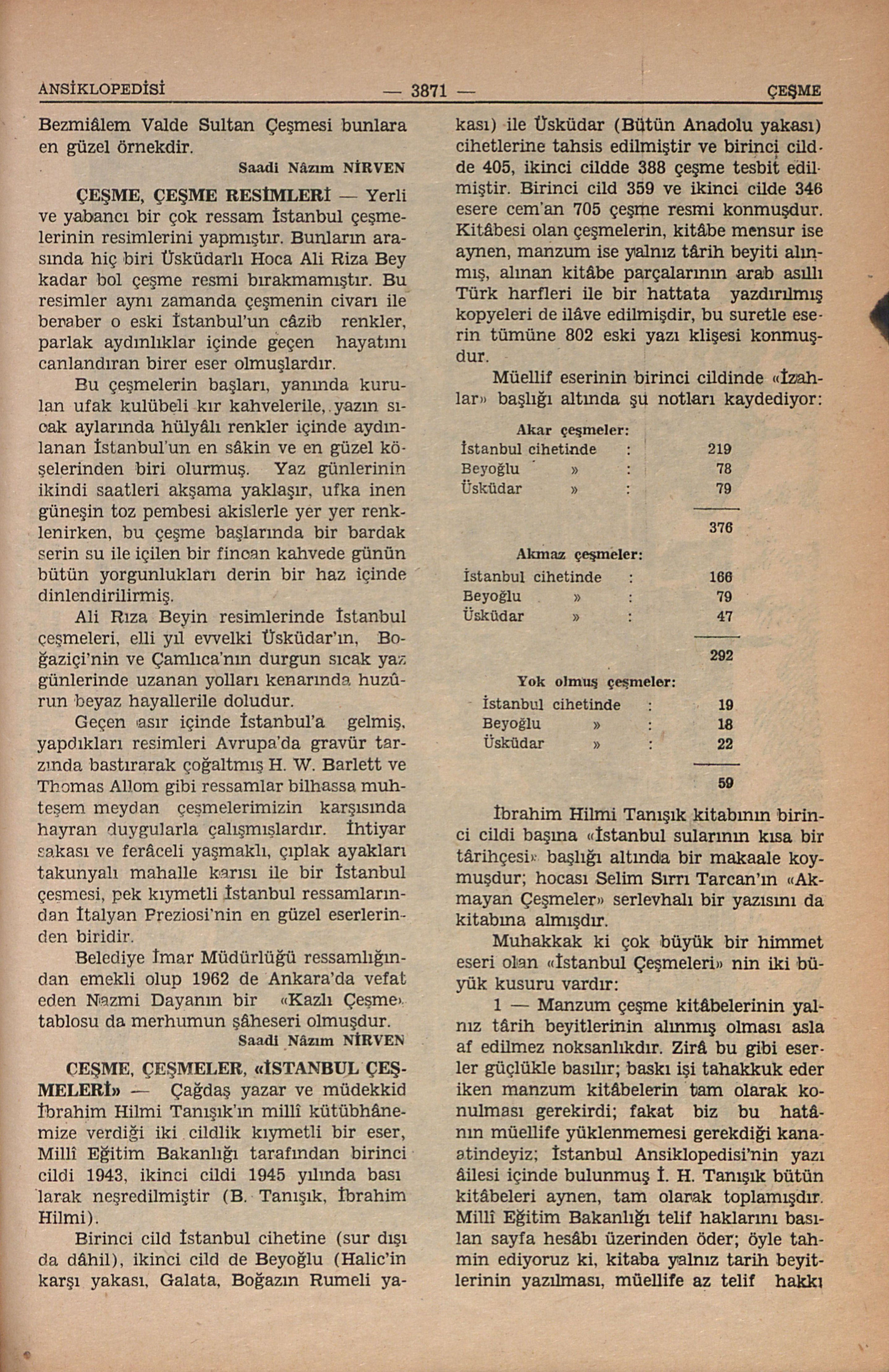 Geçen asır içinde İstanbul’a gelmiş, yapdıkları resimleri Avrupa’da gravür tarzında bastırarak çoğaltmış H. W. Barlett ve Thomas Allom gibi ressamlar bilhassa muhteşem meydan çeşmelerimizin karşısında hayran duygularla çalışmışlardır. İhtiyar sakası ve ferâceli yaşmaklı, çıplak ayakları takunyalı mahalle karısı ile bir İstanbul çeşmesi, pek kıymetli İstanbul ressamlarından İtalyan Preziosi’nin en güzel eserlerinden biridir.