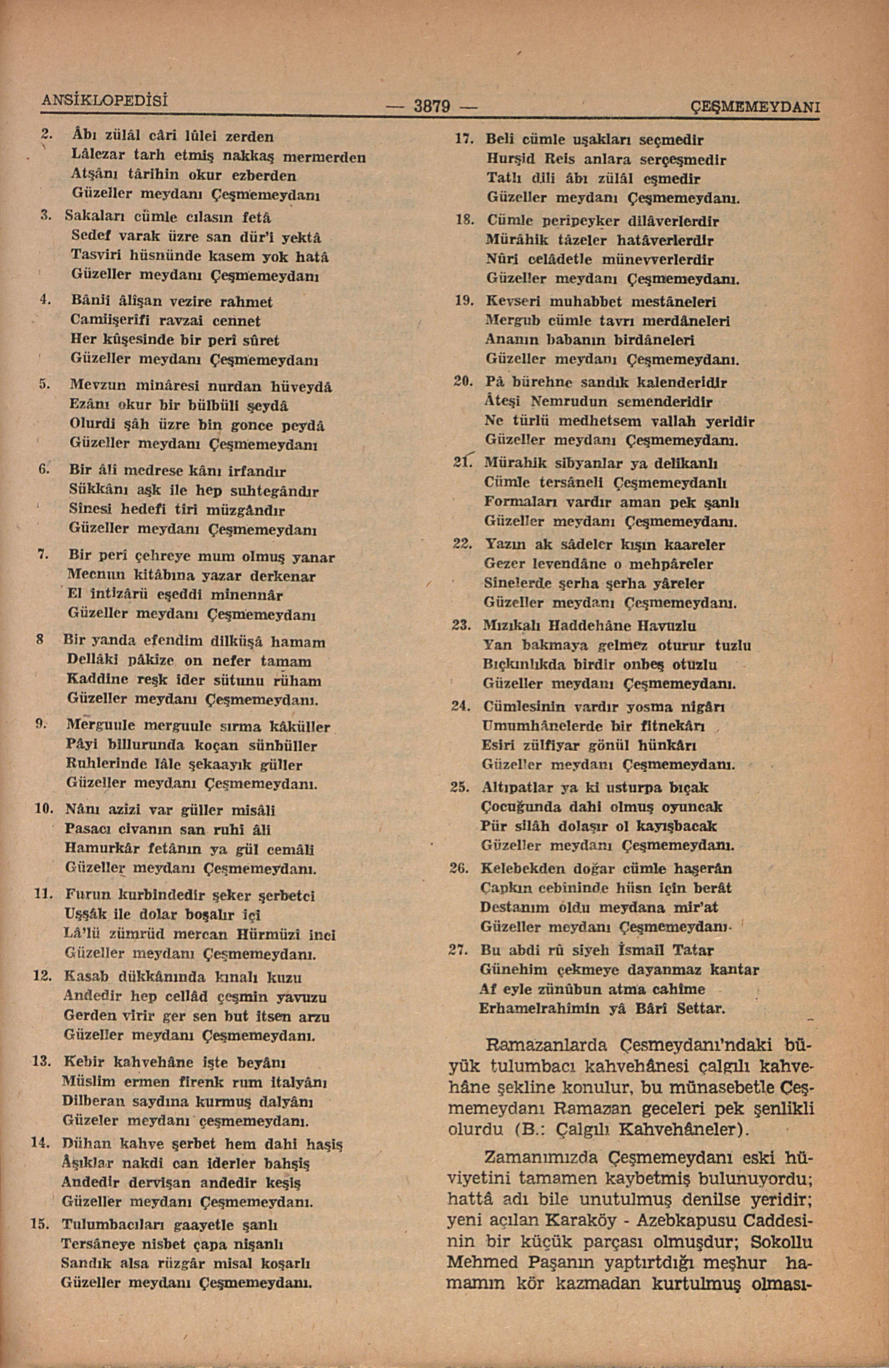 Ramazanlarda Çeşmemeydan’ndaki büyük tulumbacı kahvehânesi çalgılı kahvehâne şekline konulur, bu münasebetle Çeşmemeydanı Ramazan geceleri pek şenlikli olurdu (B.: Çalgılı Kahvehâneler).