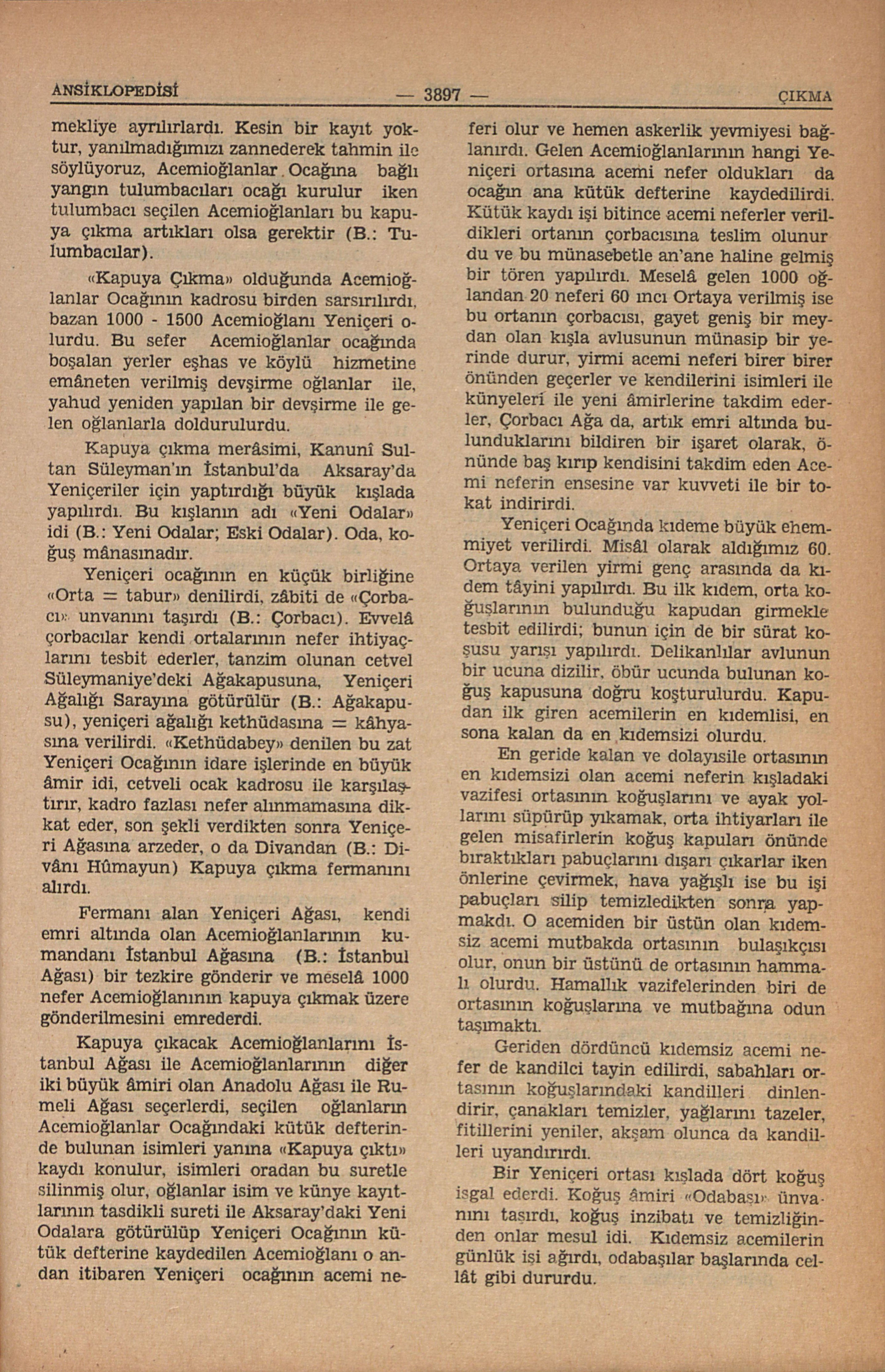 Yeniçeri Asker Ocağı ile Tanzimattan önceki Osmanlı sarayı teşkilâtında kullanılmış bir deyimdir. Acemioğlanlarının Yeniçeri Ocağı kütük defterine kaydedilerek Yeniçeri yapılmasına “Çıkma” yahud “Kapuya çıkma” denilirdi. Acamioğlanlarının kapuya çıkması, Yeniçeri ağasının Divânı Hûmayuna arzettiği ihtiyaç üzerine padişahın bir fermanı ve an’anevî merasim ile olurdu. Biribirine sımsıkı bağlı olan Acemioğlanları ve Yeniçeriler asker ocaklarının kuruluşundan İstanbulun fethine kadar geçen devir içinde bu ocakların an’ane ve merâsimi ile teşkilâtının teefrrûatı hakkında bilgimiz yokdur (B.: Acemioğlanlar; Yeniçeriler). İstanbul’un fethinden sonra büyük bir gelişme olduğu muhakkaktır. Bizim burada anlatacaklarımız, Kanunî Sultan Süleyman devrinden Yeniçeriliğin son günlerine kadar uzanan zamana ait kaynak ve vesikalardan topladıklarımızdır. Her Acemioğlanı Yeniçeri olamazdı. Bâzan aşırı serkeşliğinden Yeniçeriliğe lâyık görülmez, bâzan da akran ve emsâli kapuya çıkarken, yâni Yeniçeri olurken ihtiyaç artığı olarak kalırdı, ikinci bir çıkmaya kadar da yaşı ilerler, Yeniçeri ocağında acemi neferlik yapacak çağı aşardı. Bu gibiler Acemioğlanlar Ocağında kalırlar, Acemioğlanlarının çalıştıkları yerlerde hizmetlerine devam ederler, kendilerine evlenme izni verilir, çoluğa çocuğa karışırlar...