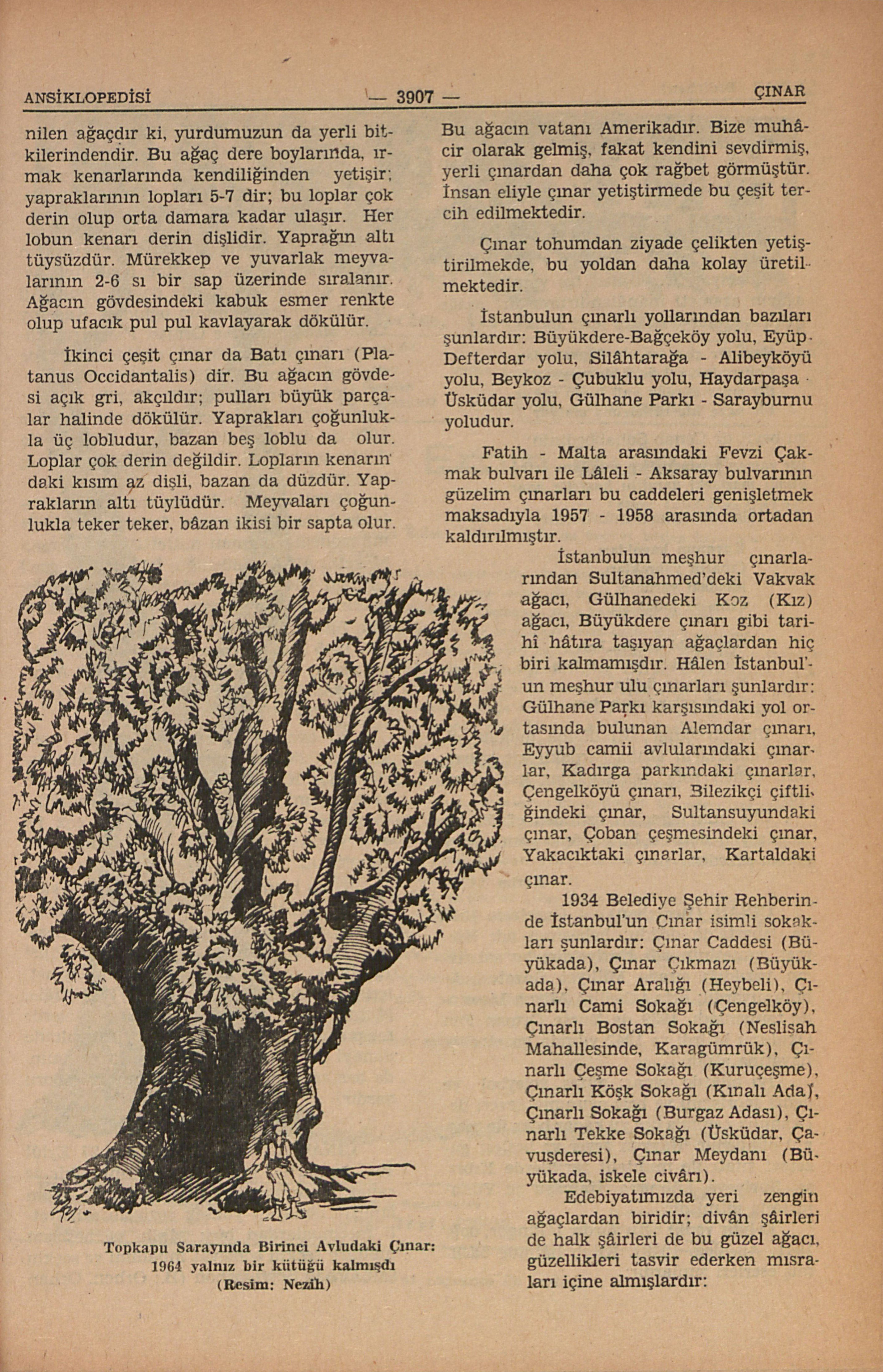 Meşhur, malûm ağaç; İstanbulun meydanlarını, sokaklarını, parklarını süsleyen ağaçların başında çınar gelir; İstanbulun bir bitki ike temsili icab etse, bu ya bir çınar ağacı, yahud bir çınar yaprağı olmalıdır.