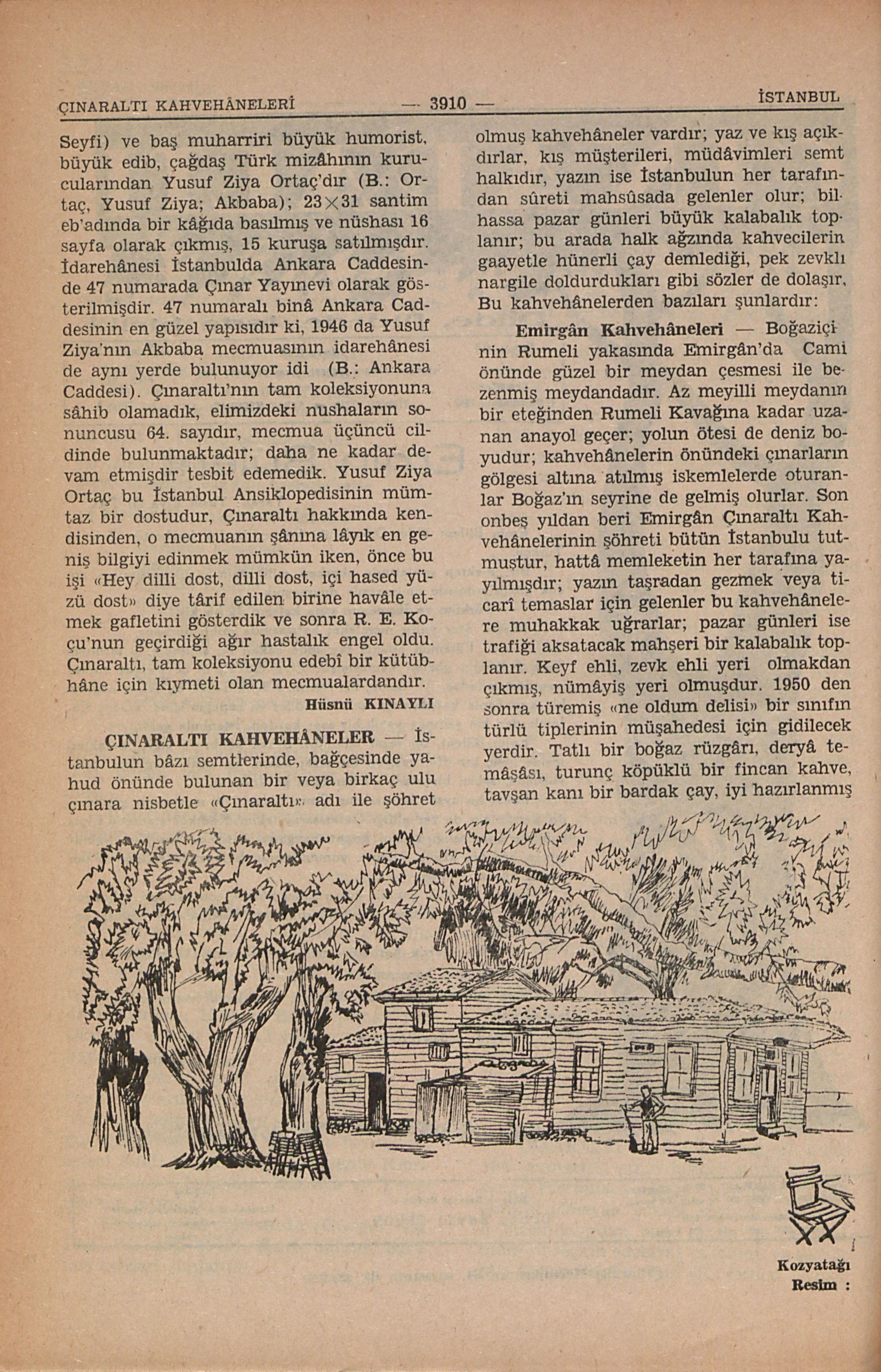 İki nüshası 27 Eylûl 1941 cumartesi günü intişar etmiş fikir ve sanat mecmuası; bizde maalesef uzun ömürlü olmayan yüksek seviyeli, şahsiyetli mecmualardan biri; sâhibi ve neşriyat müdürü seçkin edebiyat muallimi ve seçkin şâir Orhan Seyfi Orhon (B.: Orhon, Orhan Seyfi) ve baş muharri büyük humorist, büyük edib, çağdaş Türk mizâhının kurucularından Yusuf Ziya Ortaç’dır (B.: Ortaç, Yusuf Ziya; Akbaba); 23 X 31 santim eb’adında bir kâğıda basılmış ve nüshası 16 sayfa olarak çıkmış, 15 kuruşa satılmışdır. İdarehânesi İstanbulda Ankara Caddesinde 47 numarada Çınar Yayınevi olarak gösterilmişdir. 47 numaralı binâ Ankara Caddesinin en güzel yapısıdır ki, 1946 da Yusuf Ziya’nın Akbaba mecmuasının idarehânesi de aynı yerde bulunuyor idi (B.: Ankara Caddesi). Çınaraltı’nın tam koleksiyonuna sâhib olamadık, elimizdeki nushaların sonuncusu 64. sayıdır, mecmua üçüncü cildinde bulunmaktadır; daha ne kadar devam etmişdir tesbit edemedik. Yusuf Ziya Ortaç bu İstanbul Ansiklopedisinin mümtaz bir dostudur, Çınaraltı hakkında kendisinden, o mecmuanın şânına lâyık en geniş bilgiyi edinmek mümkün iken, önce bu işi “Hey dilli dost, dilli dost, içi hased yüzü dost” diye târif edilen birine havâle etmek gafletini gösterdik ve sonra R.E. Koçu’nun geçirdiği ağır hastalık engel oldu. Çınaraltı, tam koleks...
