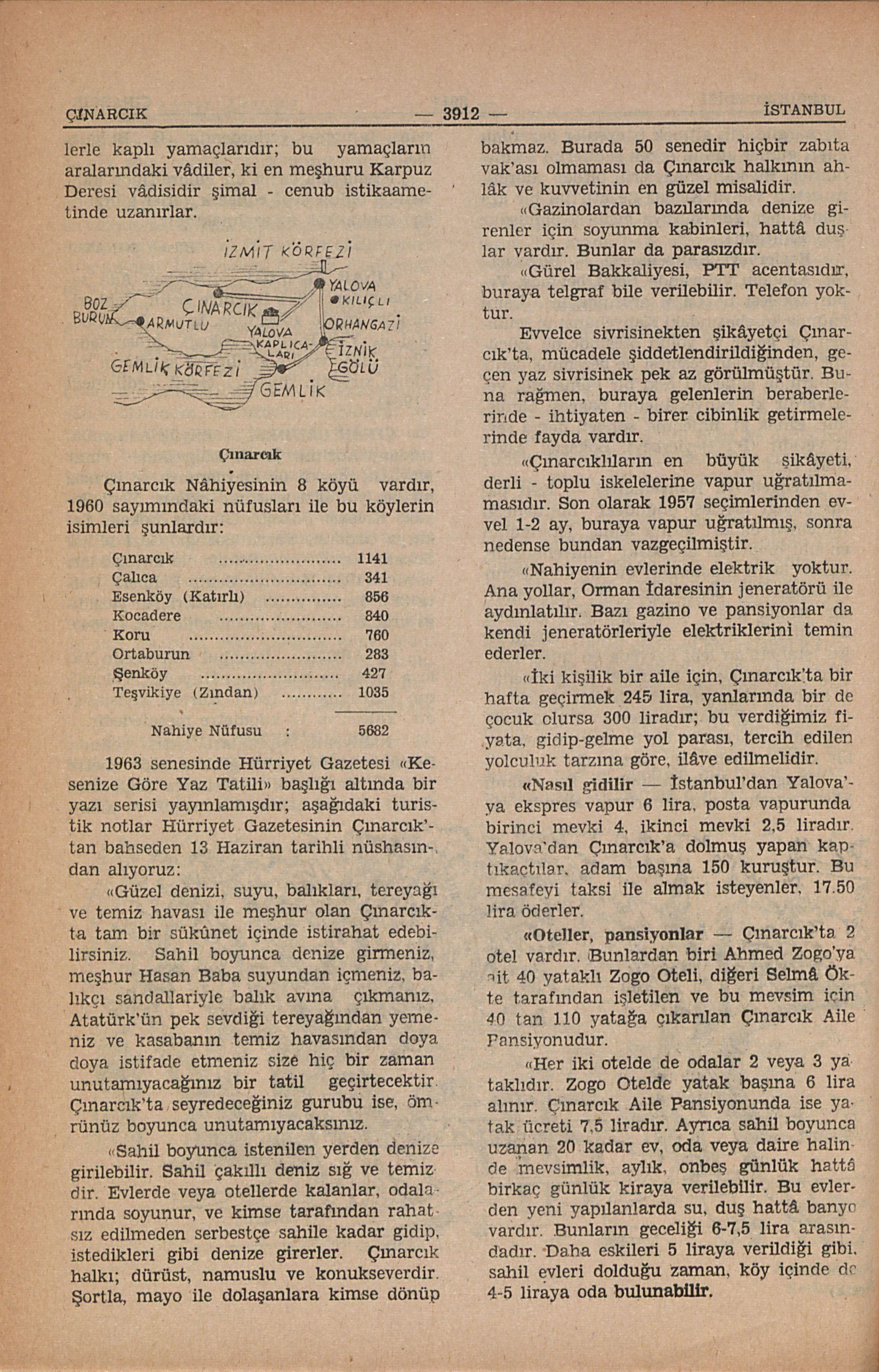 İstanbulVilâyetinin Yalova kazâsına bağlı bir nâhiyedir; Yalova’nın batısında ve İzmit Körfezi kıyısındadır, Yalova’ya 18 kilometre mesafededir. Nâhiyenin toprakları, batı ucunda Bozburun’u meydana getiren 805 metre yükseklikde Karlı ve Delmece dağlarının şimal– batıya bakan dik meyilli ve makilerle kaplı yamaçlarıdır; bu yamaçların aralarındaki vâdiler, ki en meşhuru Karpuz Deresi vâdisidir şimal– cenub istikaametinde uzanırlar. Çınarcık Nâhiyesinin 8 köyü vardır, 1960 sayımındaki nüfusları ile bu köylerin isimleri şunlardır: Çınarcık 1141 Çalıca 341 Esenköy (Katırlı) 856 Kocadere 840 Koru 760 Ortaburun 283 Şenköy 427 Teşvikiye (Zından) 1035 Nahiye Nüfusu : 5682 1963 senesinde Hürriyet Gazetesi “Kesenize Göre Yaz Tatili” başlığı altında bir yazı serisi yayınlanmışdır; aşağıdaki turistik notlar Hürriyet Gazetesinin Çınarcık’tan bahseden 13 Haziran tarihli nüshasından alıyoruz: “Güzel denizi, suyu, balıkları, tereyağı ve temiz havası ile meşhur olan Çınarcıkta tam bir sükûnet içinde istirahat edebilirsiniz. Sahil boyunca denize girmeniz, meşhur Hasan Baba suyundan içmeniz, balıkçı sandallariyle balık avına çıkmanız, Atatürk’ün pek sevdiği tereyağından yemeniz ve kasabanın temiz havasından doya doya istifade etmeniz size hiçbir zaman unutamıyacağınız bir tatil geçirtecektir. Çınarcık’ta seyredeceğiniz gurubu ise, ömrünüz boyunca unutmayacaksınız. “Sahil boyunca istenilen yerden denize girilebilir. Sahil çakıllı deniz sığ ve temizdir. Evlerde veya otellerde kalanlar, odalarında soyunur, ve kimse tarafından rahatsız edilmeden serbestçe sahile kadar gidip, istedikleri gibi denize girerler. Çınarcık halkı; dürüst, namuslu ve konukseverdir. Şortla, mayo ile dolaşanlara kimse dönüp bakmaz. Burada 50 senedir hiçbir zabıta vak’ası olmaması da Çınarcık halkının ahlâk ve kuvvetinin en güzel misalidir. “Gazinolardan bazılarında denize girenler için soyunma kabinleri, hattâ duşlar vardır. Bunlar da parasızdır. “Gürel Bakkaliyesi, PTT acentasıdır, buraya telgraf bile verilebilir. Telefon yoktur. Evvelce sivrisinekten şikâyetçi Çınarcık’ta,mücadele şiddetlendirildiğinden, geçen yaz sivrisinek pek az görülmüştür. Buna rağmen, buraya gelenlerin beraberlerinde – ihtiyaten – birer cibinlik getirmelerinde fayda vardır. “Çınarcıklıların en büyük şikâyeti, derli– toplu iskelelerine vapur uğratılmamasıdır. Son olarak 1957 seçimlerinden evvel 1-2 ay, buraya vapur uğratılmış, sonra nedense bundan vazgeçilmiştir. “Nahiyenin evlerinde elektrik yoktur. Ana yollar, Orman İdaresinin jeneratörü ile aydınlatılır. Bazı gazino ve pansiyonlar da kendi jeneratörleriyle elektriklerini temin ederler. “İki kişilik bir aile için, Çınarcık’ta bir hafta geçirmek 245 lira, yanlarında bir de çocuk olursa 300 liradır; bu verdiğimiz fiyata, gidip– gelme yol parası, tercih edilen yolculuk tarzına göre, ilâve edilmelidir. “Nasıl gidilir — İstanbul’dan Yalova’ya ekspres vapur 6 lira, posta vapurunda birinci mevki 4, ikinci mevki 2,5 liradır. Yalova’dan Çınarcık’a dolmuş yapan kaptıkaçtılar, adam başına 150 kuruştur. Bu mesafeyi taksi ile almak isteyenler, 17.50 lira öderler. “Oteller, pansiyonlar — Çınarcık’ta 2 otel vardır. Bunlardan biri Ahmed Sogo’ya ait 40 yataklı Zogo Oteli, diğeri Selmâ Ökte tarafından işletilen ve bu mevsimin 40 tan 110 yatağa çıkarılan Çınarcık Aile Pansiyonudur. “Her iki otelde de odalar 2 veya 3 yataklıdır. Zogo Otelde yatak başına 6 lira alınır. Çınarcık Aile Pansiyonunda ise yatak ücreti 7.5 liradır. Ayrıca sahil boyunca uzanan 20 kadar ev, oda veya daire halinde mevsimlik, aylık, onbeş günlük hattâ birkaç günlük kiraya verilebillir. Bu evlerden yeni yapılanlarda su, duş hattâ banyo vardır. Bunların geceliği 6-7,5 lira arasındadır. Daha eskileri 5 liraya verildiği gibi sahil evleri dolduğu zaman, köy içinde de 4-5 liraya ev bulunabilir. “Sahildeki yeni yapılan evler arasında mobilyalı 3 odası, duşu, mutfağı, alaturka ve alafranga tuvaleti, denize nâzır balkonu ile mevsimliği 4000 liraya kiralanan daireler olduğu gibi, daha az konforluları da mevsimliği 2500 liraya müşteri bulmaktadır. “Lokantalar — Pansiyon olarak kalınan evlerde bizzat yemek pişirilebileceği gibi, sahil boyunca dizilen lokanta, gazinolardan da kahvaltı, öğle ve akşam yemekleri mâkul fiyatlarla temin edilebilir. Adetleri 6-7 yi bulan bu lokantalardan, iskelenin tam karşısına rastlayan Ali Tetik (Ali Baba) ya ait Kanaat Lokantası, kış - yaz açıktır. Diğerleri yazın açılır. Bunlar arasında İstakoz, Çınarlatı, Sadi, Emirgân lokantalarını sayabiliriz. “Lokantaların hepsinde fiyatlar aşağıdaki gibidir: YEMEKLER Çorbalar 50 kuruş Fırında kızartma etler 200 " Kemiksiz et yemekleri 180 " Izgara etler 175 " Tava etler 175 " Şiş 200 " Pirzola (sote) 200 " Ciğer tava (sote) 150 " Bonfile garnitürlü 300 " Biftek garnitürlü 300 " Dolmalar 150 " Zeytinyağlı dolmalar 150 " Etli taze sebzeler 100 " Eti ve zeytinyağlı Kuru sebzeler 75 " Pilâv 75 " Makarna 75 " Sütlü ve tatlılar 75 " Salata– cacık 75 " Meyva % 50 kârla Balık % 50 kârla Yoğurt 50 " Patlıcan– biber Kızartma sade 100 " Komple kahvaltı (tereyağı, günlük yumurta, reçel, zeytin, beyaz peynir, süt) 250 " Kahve 50 " Çay 25 " Gazoz 30 " İÇKİLER Bira 200 " Yeni Rakı (35 lik) 800 " Kulüp Rakısı (35 lik) 900 " Yeni Rakı dublesi 175 " Kulüp Rakısı duble 200 " “Çınarcığın iri levrekleri pek meşhurdur.” (Hürriyet Gazetesi, 1963) Yine aynı gazete 1964 haziranında Çınarcık’a tahsis ettiği bir sayfada yukarıdaki notları tekrar etmiş ve onlara eklediği satırlarda bazı yeni otel, motel ve pansiyonların isimlerini vermişd