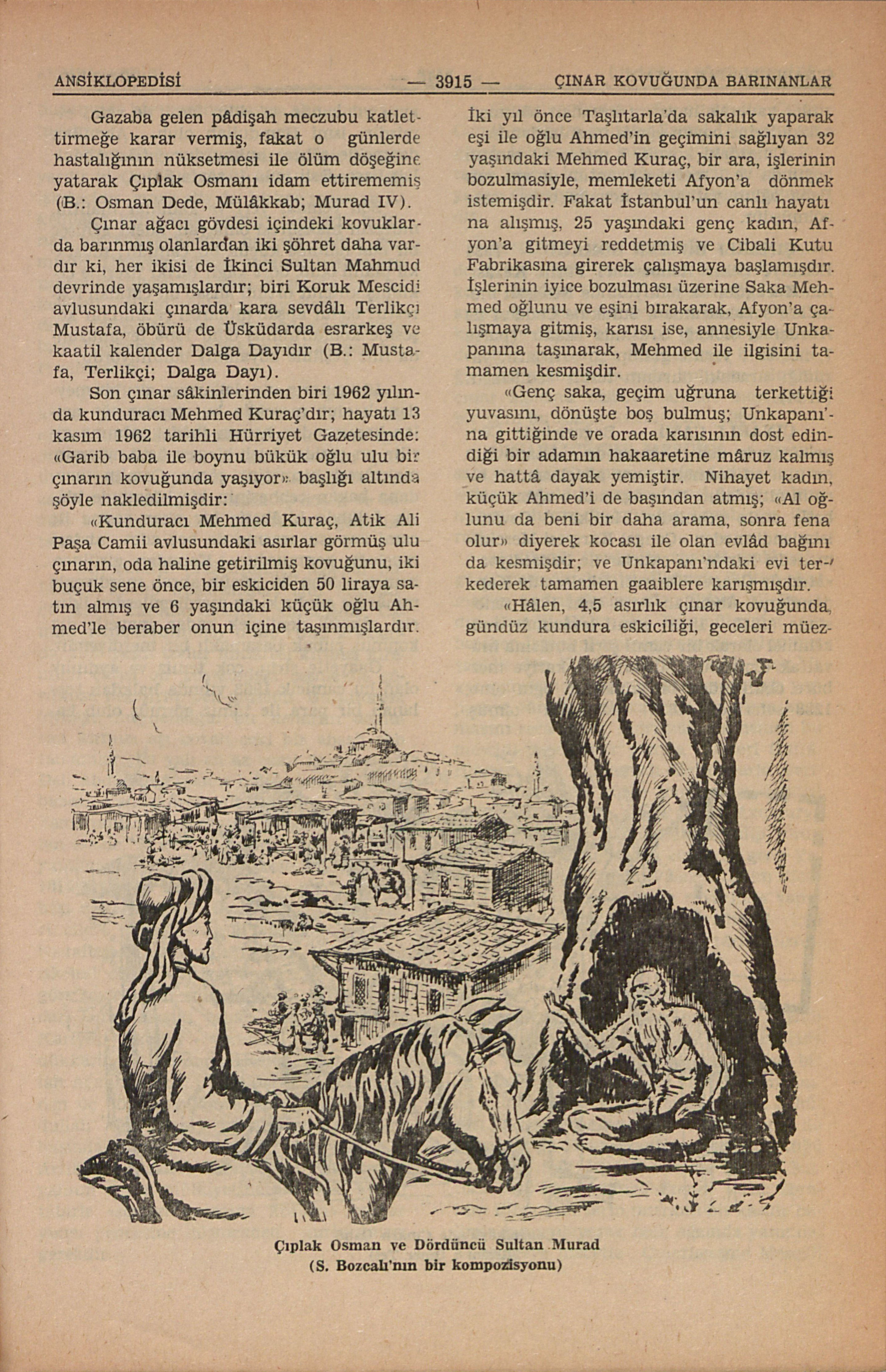 “Kunduracı Mehmed Kuraç, Atik Ali Paşa Camii avlusundaki asırlar görmüş ulu çınarın, oda haline getirilmiş kovuğunu, iki buçuk sene önce, bir eskiciden 50 liraya satın almış ve 6 yaşındaki küçük oğlu Ahmed’le beraber onun içine taşınmışlardır. İki yıl önce Taşlıtarla’da sakalık yaparak eşi ile oğlu Ahmed’in geçimini sağlıyan 32 yaşındaki Mehmed Kuraç, bir ara, işlerinin bozulmasiyle, memleketi Afyon’a dönmek istemişdir. Fakat İstanbul’un canlı hayatına alışmış, 25 yaşındaki genç kadın, Afyon’a gitmeyi reddetmiş ve Cibali Kutu Fabrikasına girerek çalışmaya başlamışdır. İşlerinin iyice bozulması üzerine Saka Mehmed oğlunu ve eşini bırakara, Afyon’a çalışmaya gitmiş, karısı ise, annesiyle Unkapanına taşınarak, Mehmed ile ilgisini tamamen kesmişdir.