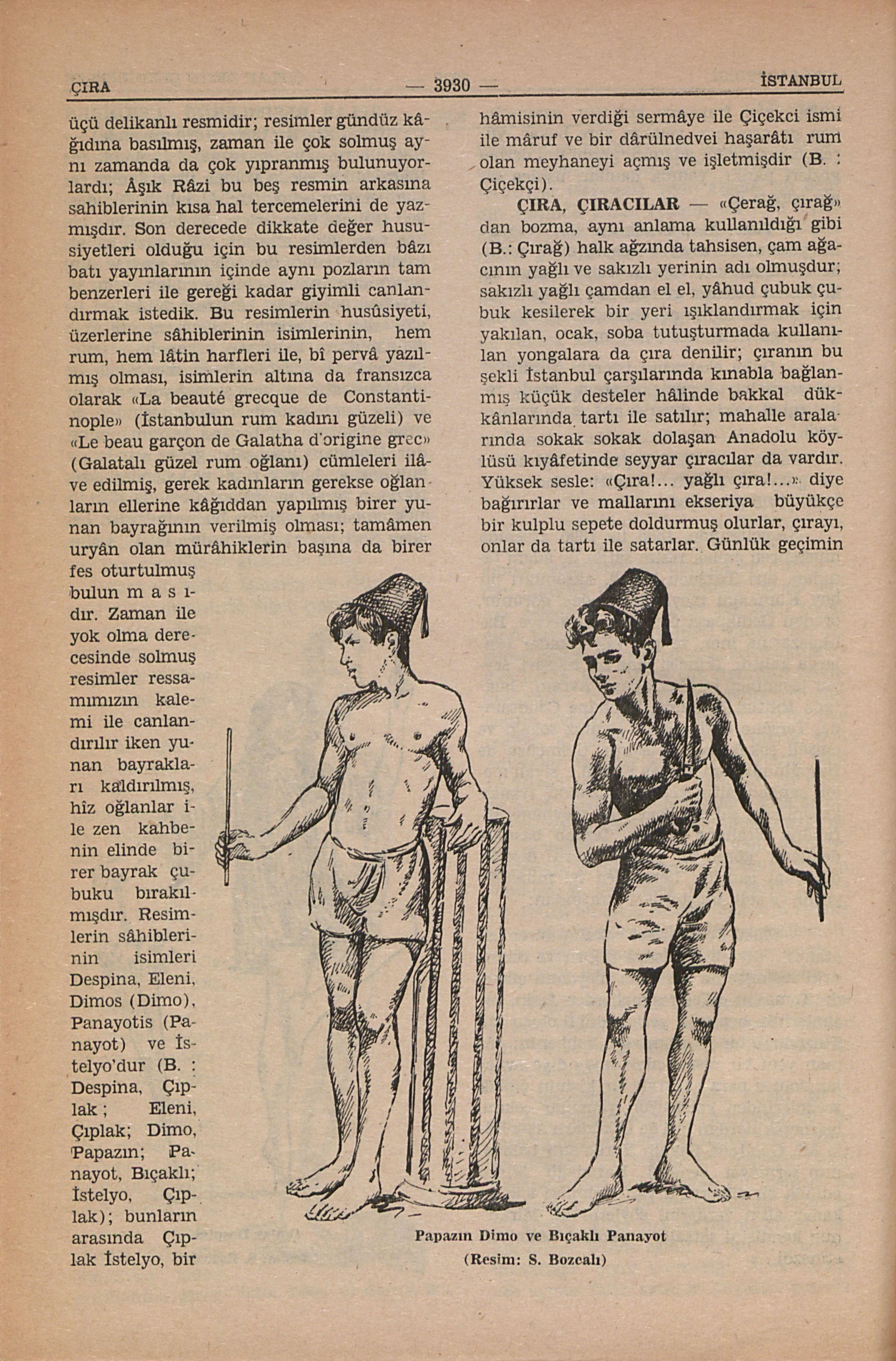 “Çerağ, çırağ” dan bozma, aynı anlama kullanıldığı gibi (B.: Çırağ) halk ağzında tahsisen, çam ağacının yağlı ve sakızlı yerinin adı olmuşdur; sakızlı yağlı çamdan el el, yâhud çubuk çubuk kesilerek bir yeri ışıklandırmak için yakılan, ocak, soba tutuşturmada kullanılan yongalara da çıra denilir; çıranın bu şekli İstanbul çarşılarında kınabla bağlanmış küçük desteler hâlinde bakkal dükkânlarında tartı ile satılır; mahalle aralarında sokak sokak dolaşan Anadolu köylüsü kıyâfetinde seyyar çıracılar da vardır. Yüksek sesle: “Çıra!... yağlı çıra!...” diye bağırırlar ve mallarını ekseriya büyükçe bir kulplu sepete doldurulmuş olurlar, çırayı, onlar da tartı ile satarlar. Günlük geçimin çok güç, 300 gram ekmeğin 75 kuruş olduğu zamanımızda her gün bütün mallarını satsalar kazançları ile nasıl geçinirler bilinmez. “Elkâsibü hâbîlullah” sırrına mazhar olmuş esnafdandır.
