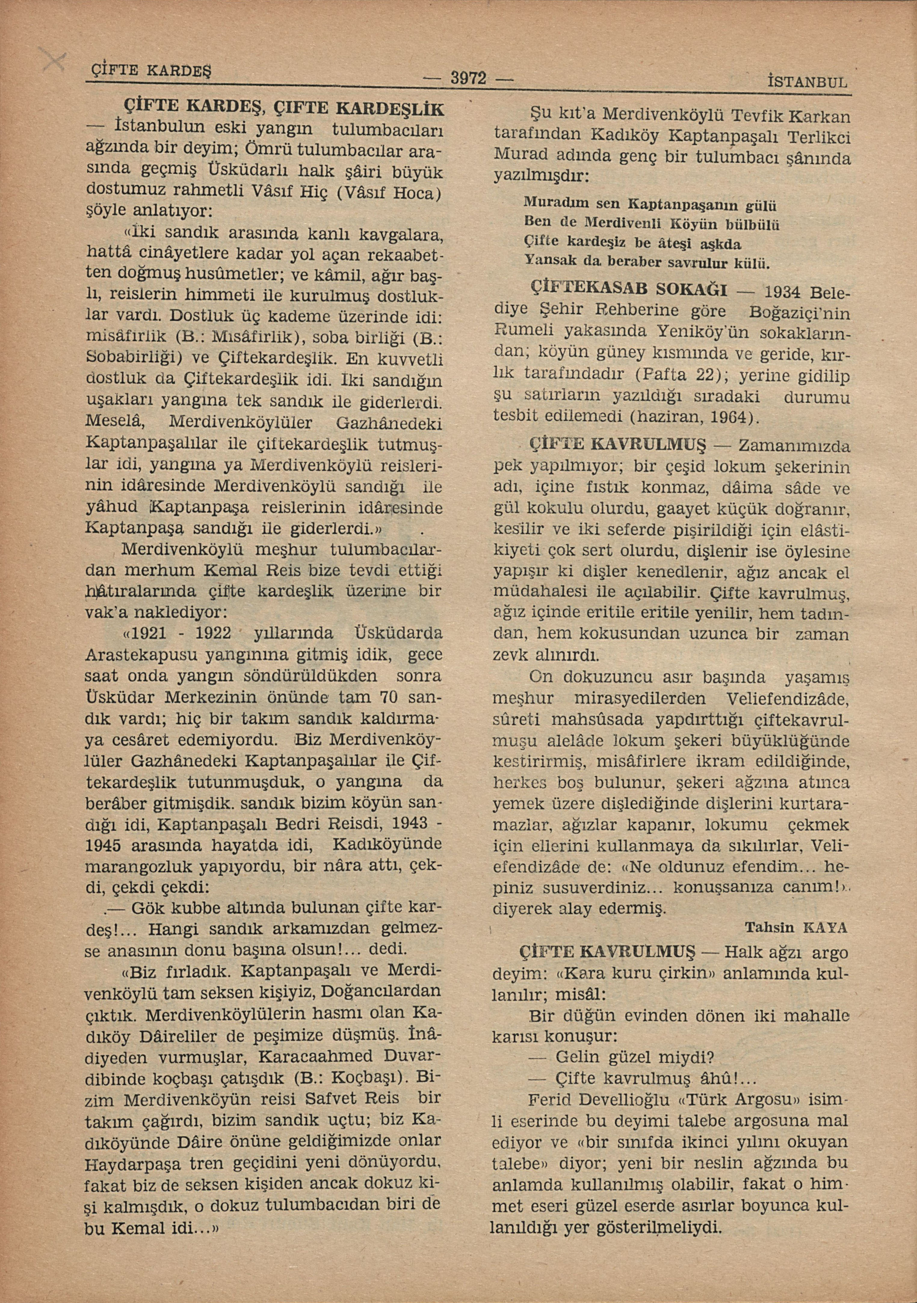 Ahmed Râsim de bu deyimi “iki kavrulmuş” şeklinde tulumbacı argosuna mal ediyor ve “iki defa yangında ölümden kurtulmuş” anlamında lâkab olarak kullanıldığını söylüyor (Şehir Mektubları, III).
