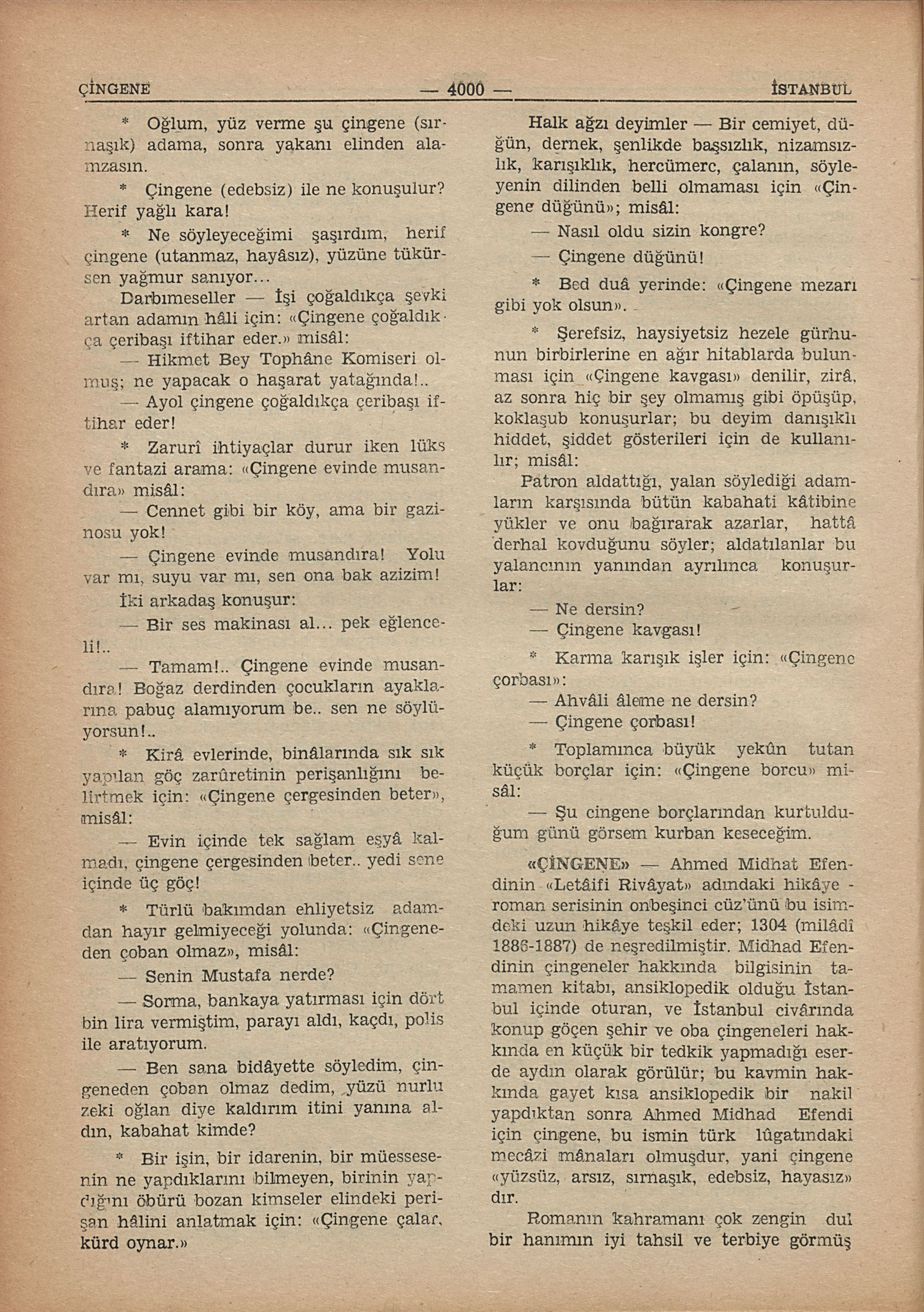 Ahmed Mithat Efendinin “Letâifi Rivâyat” adındaki hikâye - roman serisinin onbeşinci üz’ünü bu isimdeki uzun hikâye teşkil eder; 1304 (milâdî 1886-1887) de neşredilmiştir. Midhat Efendinin çingeneler hakkında bilgisinin tamamen kitabı, ansiklopedik olduğu İstanbul içinde oturan, ve İstanbul civârında konup göçen şehir ve oba çingeneleri hakkında en küçük bir tedkik yapmadığı eserde aydın olarak görülür; bu kavmin hakkında gayet kısa ansiklopedik bir nakil yapdıktan sonra Ahmed Midhad Efendi için çingene, bu ismin türk lûgatındaki mecâzi mânaları olmuşdur, yani çingene “yüzsüz, arsız, sırnaşık, edebsiz, hayasız”dır.