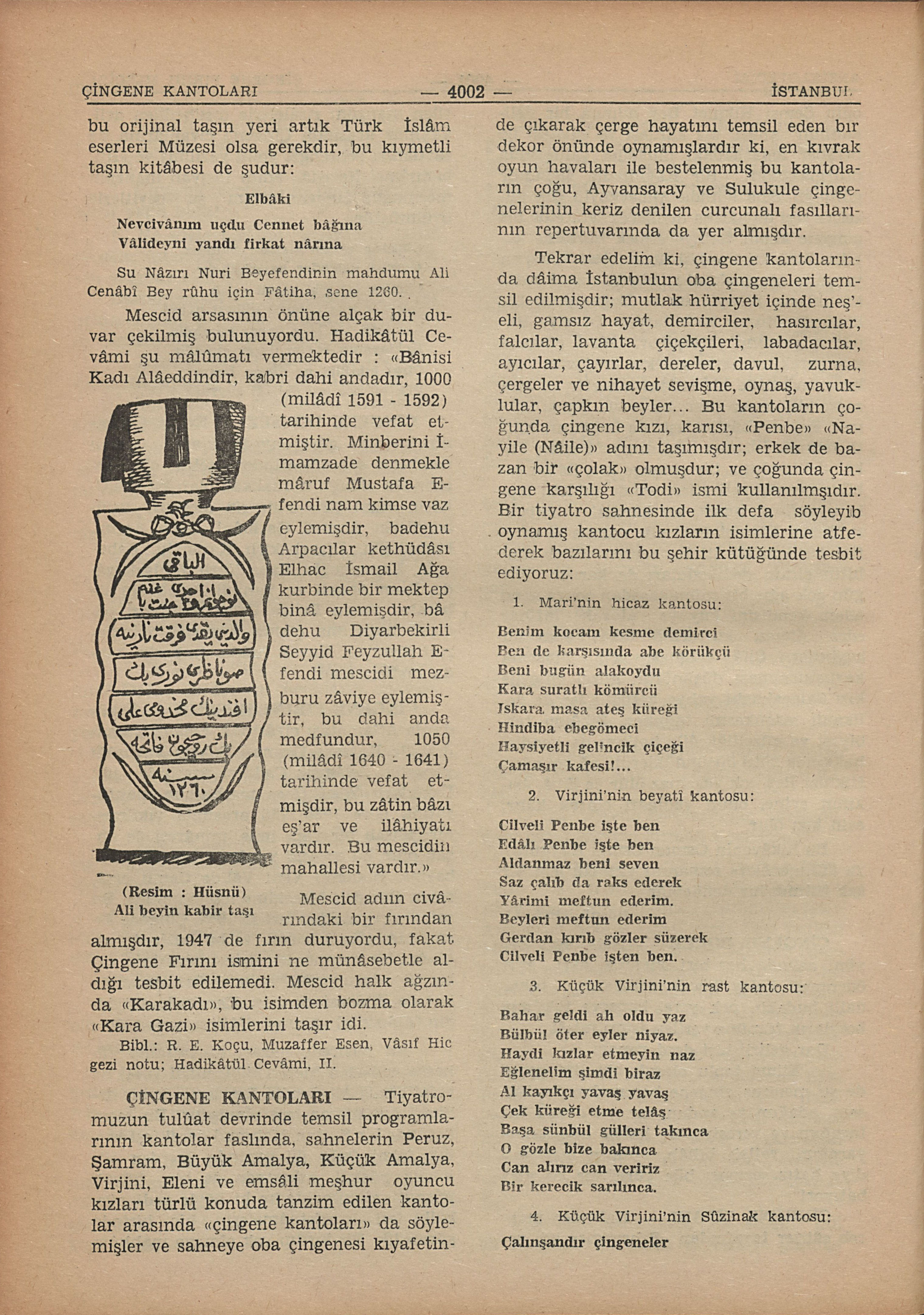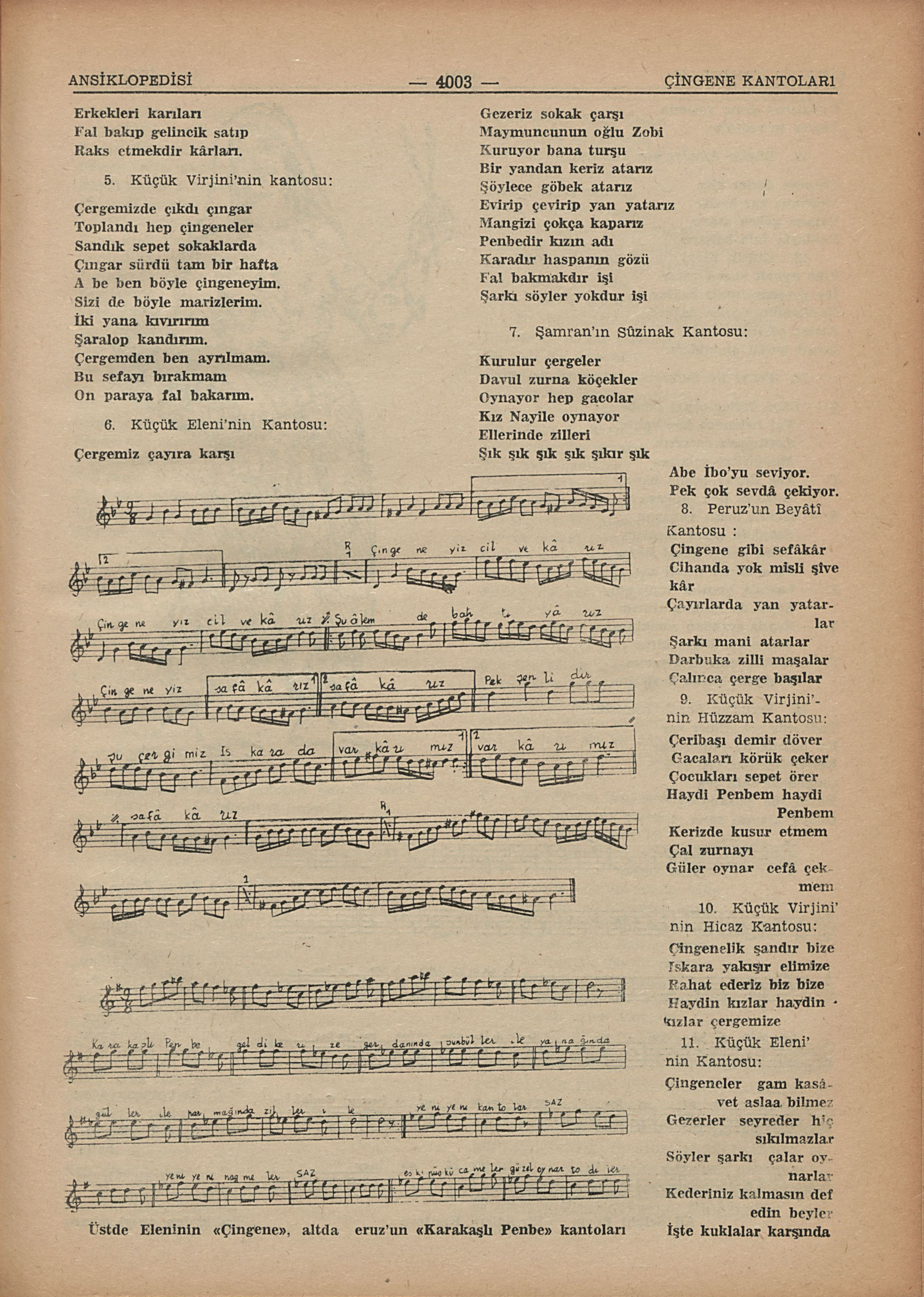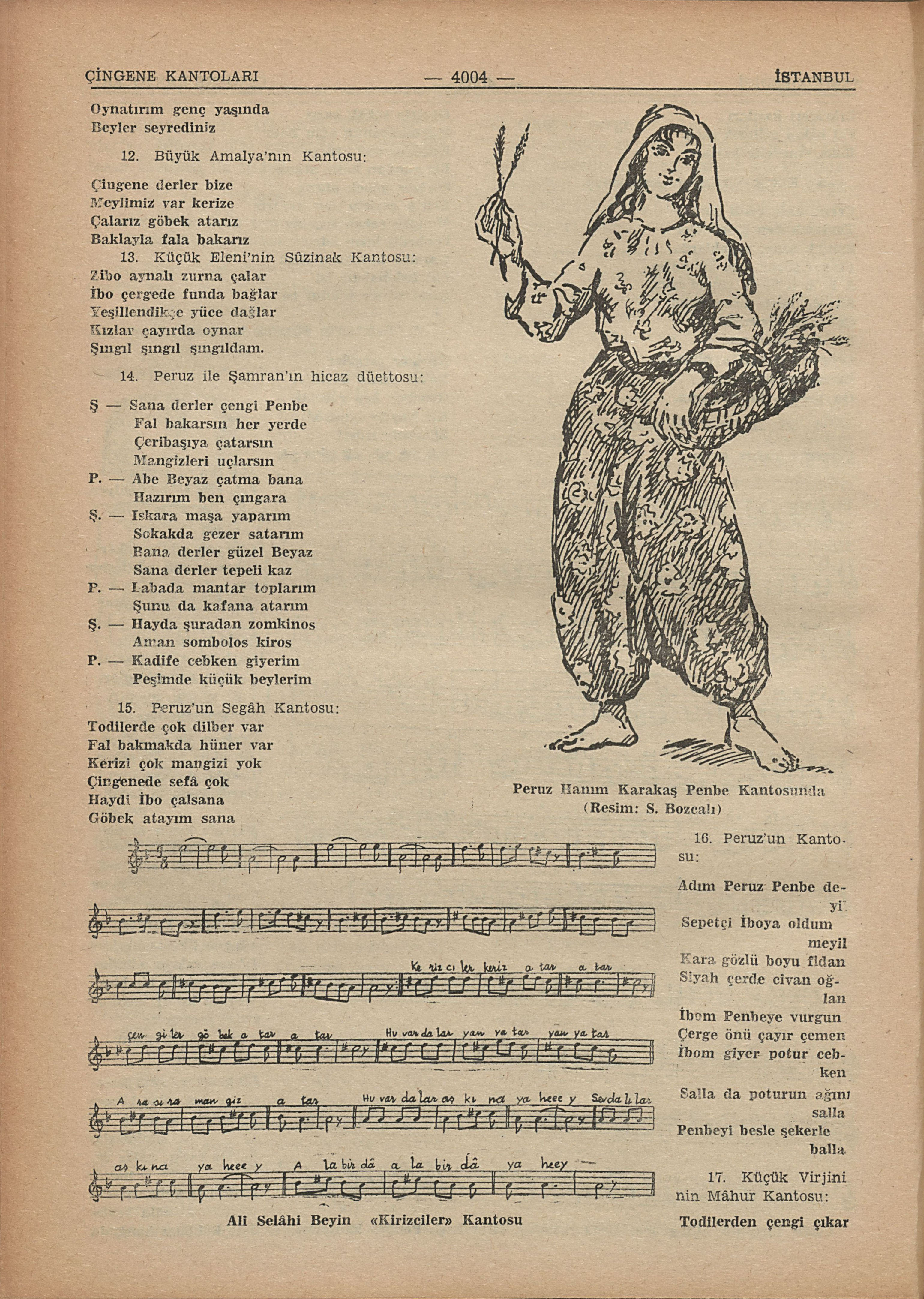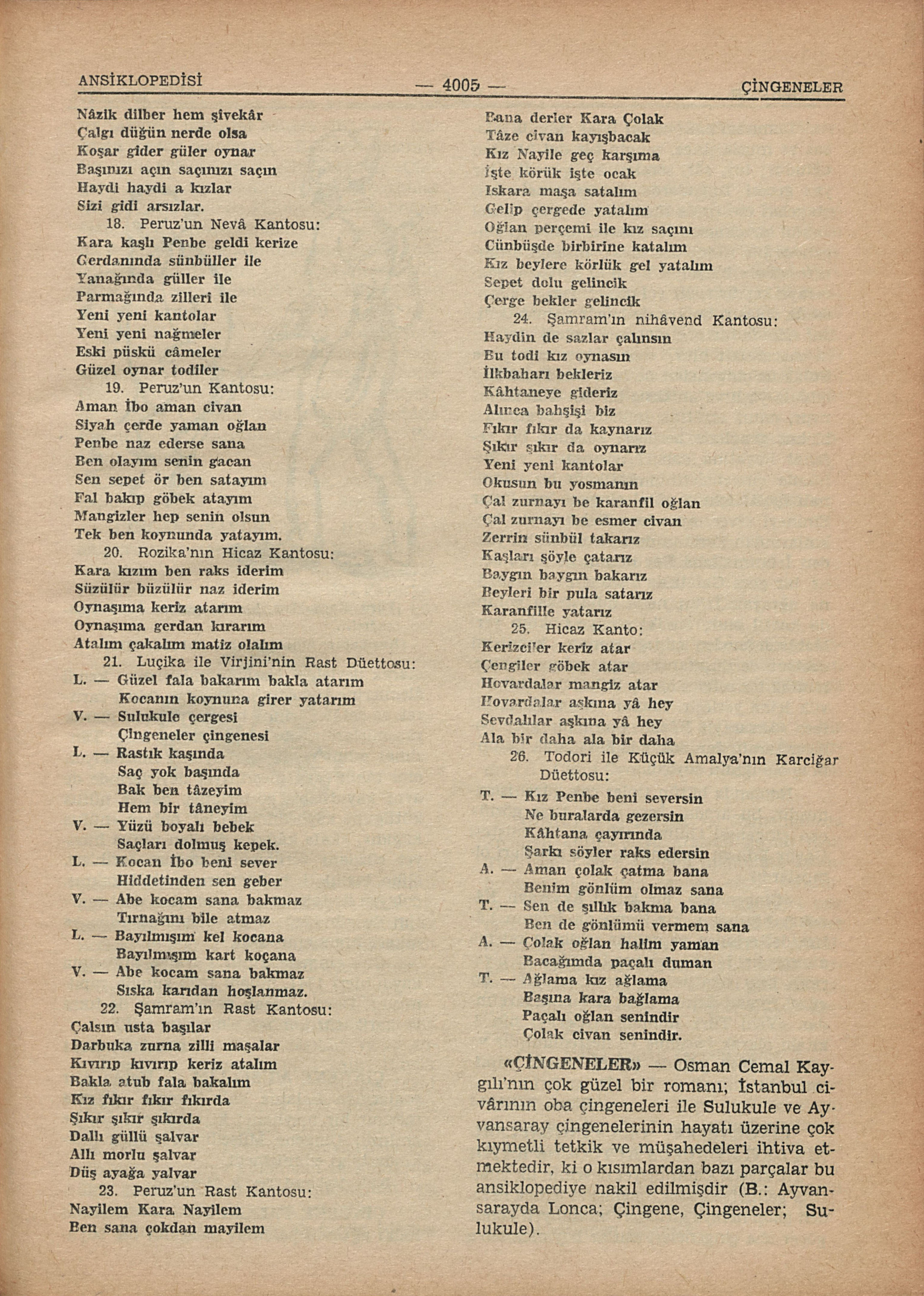 Tekrar edelim ki, çingene kantolarında dâima İstanbulun oba çingeneleri temsil edilmişdir; mutlak hürriyet içinde neş’eli, gamsız hayat, demirciler, hasırcılar, falcılar, havanta çiçekçileri, labadacılar, ayıcılar, çayırlar, dereler, davul, zurna, çergeler ve nihayet sevişme, oynaş, yavuklular, çapkın beyler... Bu kantoların çoğunda çingene kızı, karısı, “Penbe” “Nayile (Nâile)” adını taşımışdır; erkek de bazan bir “çolak” olmuşdur; ve çoğunda çingene karşılığı “Todi” ismi kullanılmışdır. Bir tiyatro sahnesinde ilk defa söyleyib oynamış kantocu kızların isimlerine atfederek bazılarını bu şehir kütüğünde tesbit ediyoruz: