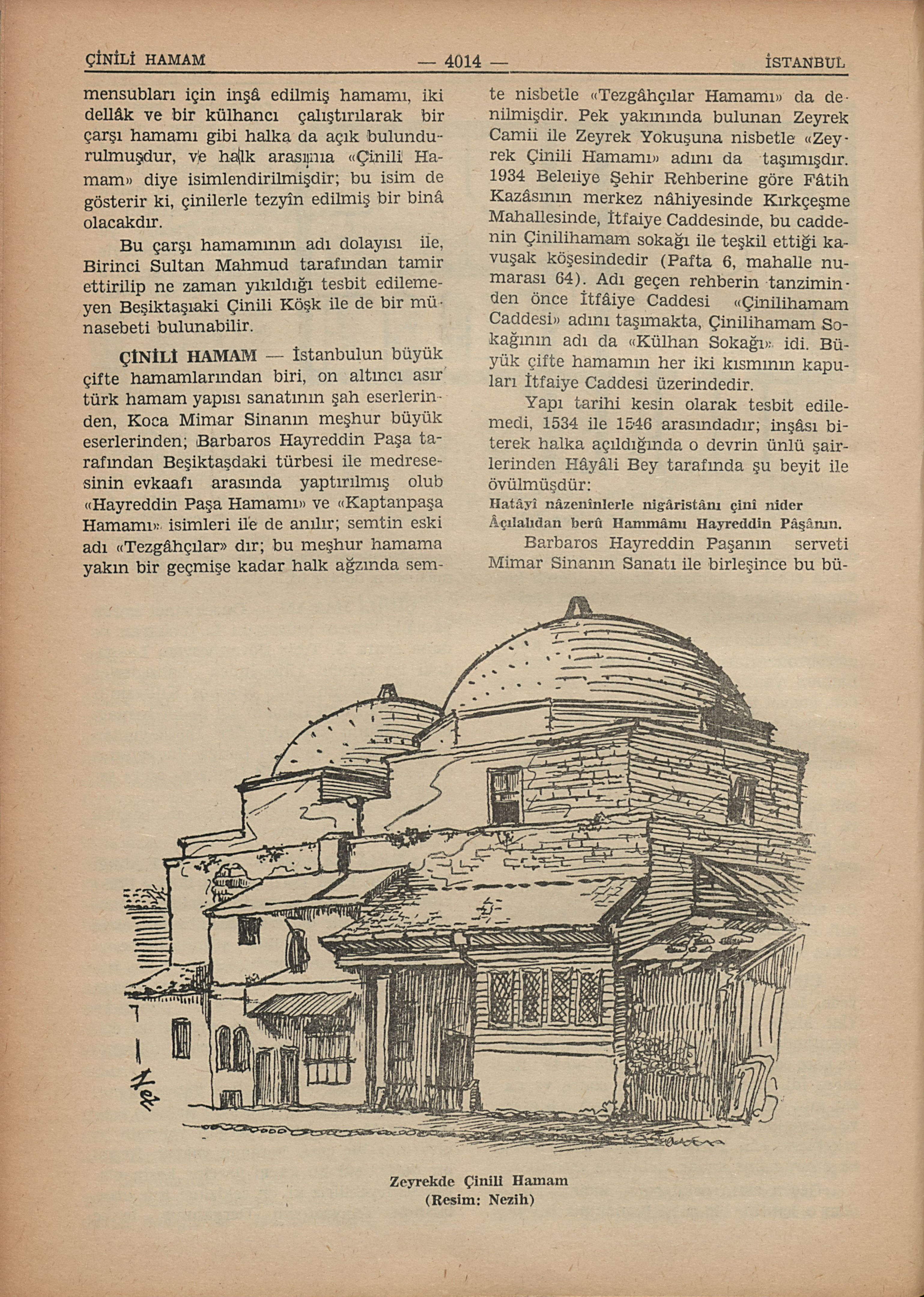 İstanbul Kadılığı tarafından hicrî 1147 (milâdî 1734-1735) yılında hamam uşaklarının tescili için tanzim edilmiş bir defterde Beşiktaşda Yahya Efendi Dergâhı yanında “Çinili Hamam” adı ile bir hamam kaydedilmiş ve bu hamamda Gül Mustafa bin Hüseyin adında Yeniceli çârebrû bir genç ile sarı bıyıklı İstanbullu Mehterî Hüseyin adında iki dellâk, Boğos adında da bir ermeni külhancı bulunduğu kaydedilmişdir. Beşiktaşda, dolayısı ile Yahya Efendi Dergâhı yanında bu isimde bir hamam yokdur, hattâ adı geçen dergâh yanında ve civarında bir çarşı hamamı yoktur. Resmî bir defterdeki bu kayıd üzerine kesin olarak söyleyebiliriz ki, on sekizinci asır ortalarında Yahyaefendi Dergâhının tekke mensubları için inşâ edilmiş hamamı, iki dellâk ve bir külhancı çalıştırılarak bir çarşı hamamı gibi halka da açık bulundurulmuşdur, ve halk arasında “Çinili Hamam” diye isimlendirilmişdir; bu isim de gösterir ki, çinilerle tezyîn edilmiş bir binâ olacakdır. Bu çarşı hamamının adı dolayısı ile, Birinci Sultan Mahmud tarafından tamir ettirilip ne zaman yıkıldığı tesbit edilemeyen Beşiktaşıaki Çinili Köşk ile de bir münasebeti bulunabilir.
