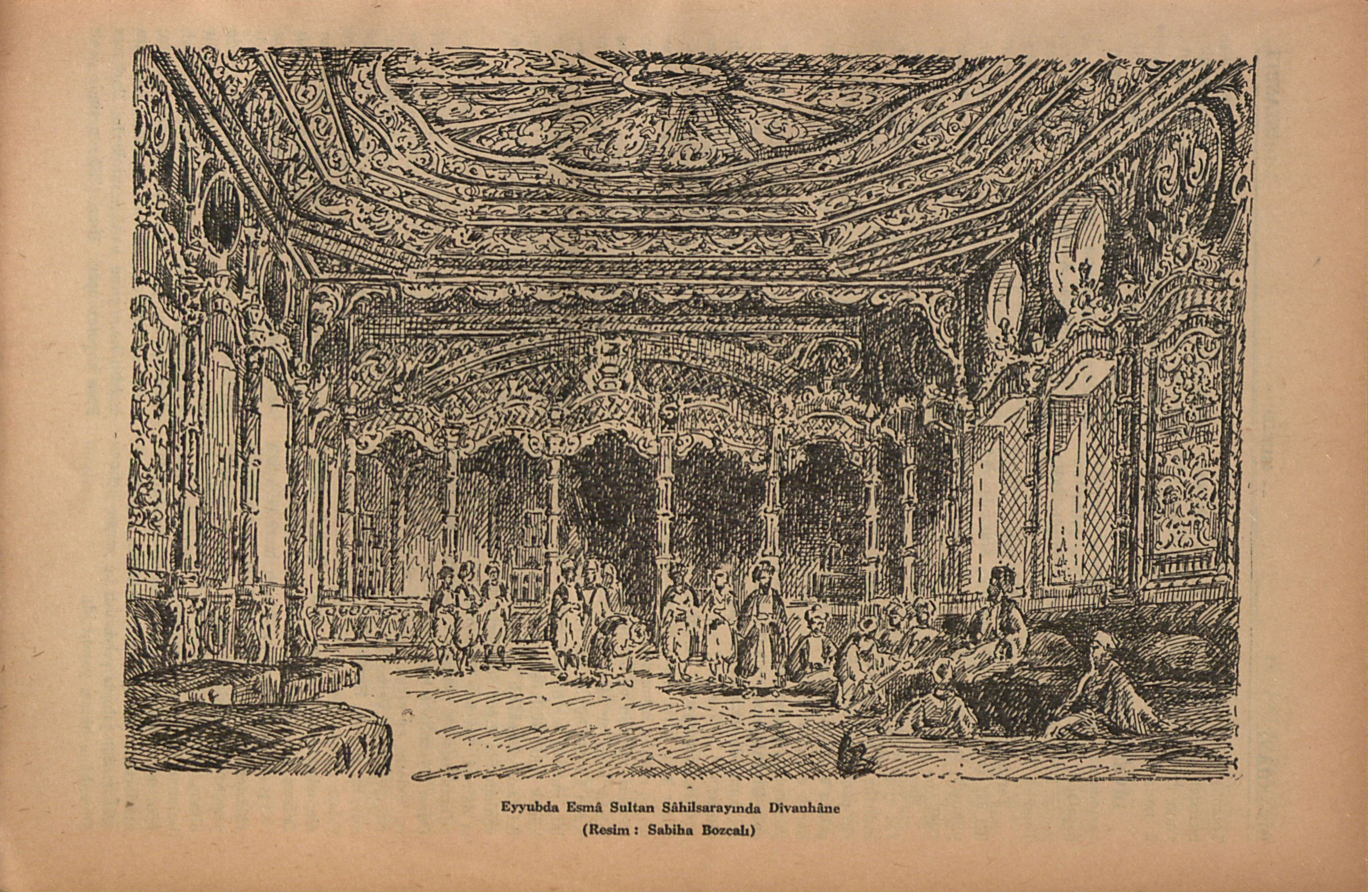 Dîvânhâneler, İstanbulun eski büyük muhteşem yapılarının en mükellef, en süslü yerleri olurdu, duvar ve tavan tezyinâtı, pencere ve dolap çerçeve ve kapakları tahta oymacılığının hârikaları ile bezenir, ağaç ve alçı kabartma çiçeklerle donatılır, ve bütün bu süsler en tatlı renklerle ve altın yaldızla boyanırdı. Geçen asır ortalarında İstanbula gelmiş ingiliz ressamı Thomas Allom’un çok meşhur İstanbul gravürlerinden biri Eyyubda Esmâ Sultan Sâhilsarayının dîvanhânesidir (B.: Allom, Thomas, cild 2; sayfa 725).