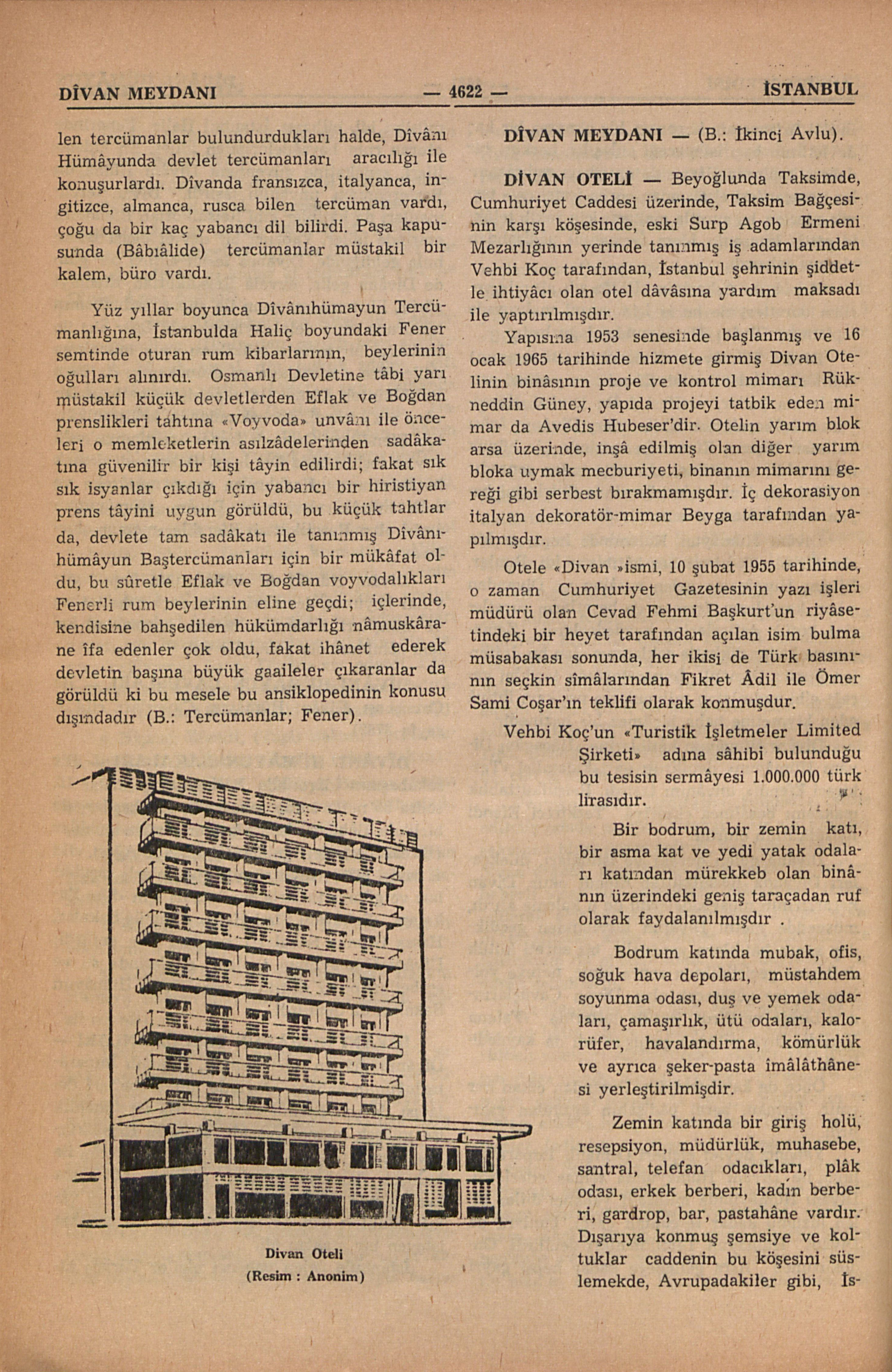 Beyoğlunda Taksimde, Cumhuriyet Caddesi üzerinde, Taksim Bağçesinin karşı köşesinde, eski Surp Agob Ermeni Mezarlığının yerinde tanınmış iş adamlarından Vehbi Koç tarafından, İstanbul şehrinin şiddetle ihtiyâcı olan otel dâvâsına yardım maksadı ile yaptırılmışdır. Yapısına 1953 senesinde başlanmış ve 16 ocak 1965 tarihinde hizmete girmiş Divan Otelinin binâsının proje ve kontrol mimarı Rükneddin Güney, yapıda projeyi tatbik eden mimar da Avedis Hubeser’dir. Otelin yarım blok arsa üzerinde, inşâ edilmiş olan diğer yarım bloka uymak mecburiyeti, binanın mimarını gereği gibi serbest bırakmamışdır. İç dekorasiyon italyan dekoratör-mimar Beyga tarafından yapılmışdır. Otele “Divan” ismi, 10 şubat 1955 tarihinde, o zaman Cumhuriyet Gazetesinin yazı işleri müdürü olan Cevad Fehmi Başkurt’un riyâsetindeki bir heyet tarafından açılan isim bulma müsabakası sonunda, her ikisi de Türk basınının seçkin sîmâlarından Fikret Âdil ile Ömer Sami Coşar’ın teklifi olarak konmuşdur. Vehbi Koç’un “Turistik İşletmeler Limited Şirketi” adına sâhibi bulunduğu bu tesisin sermâyesi 1.000.000 türk lirasıdır. Bir bodrum, bir zemin katı, bir asma kat ve yedi yatak odaları katından mürekkeb olan binânın üzerindeki geniş taraçadan ruf olarak faydalanılmışdır . Bodrum katında mubak, ofis, soğuk hava depoları, m...