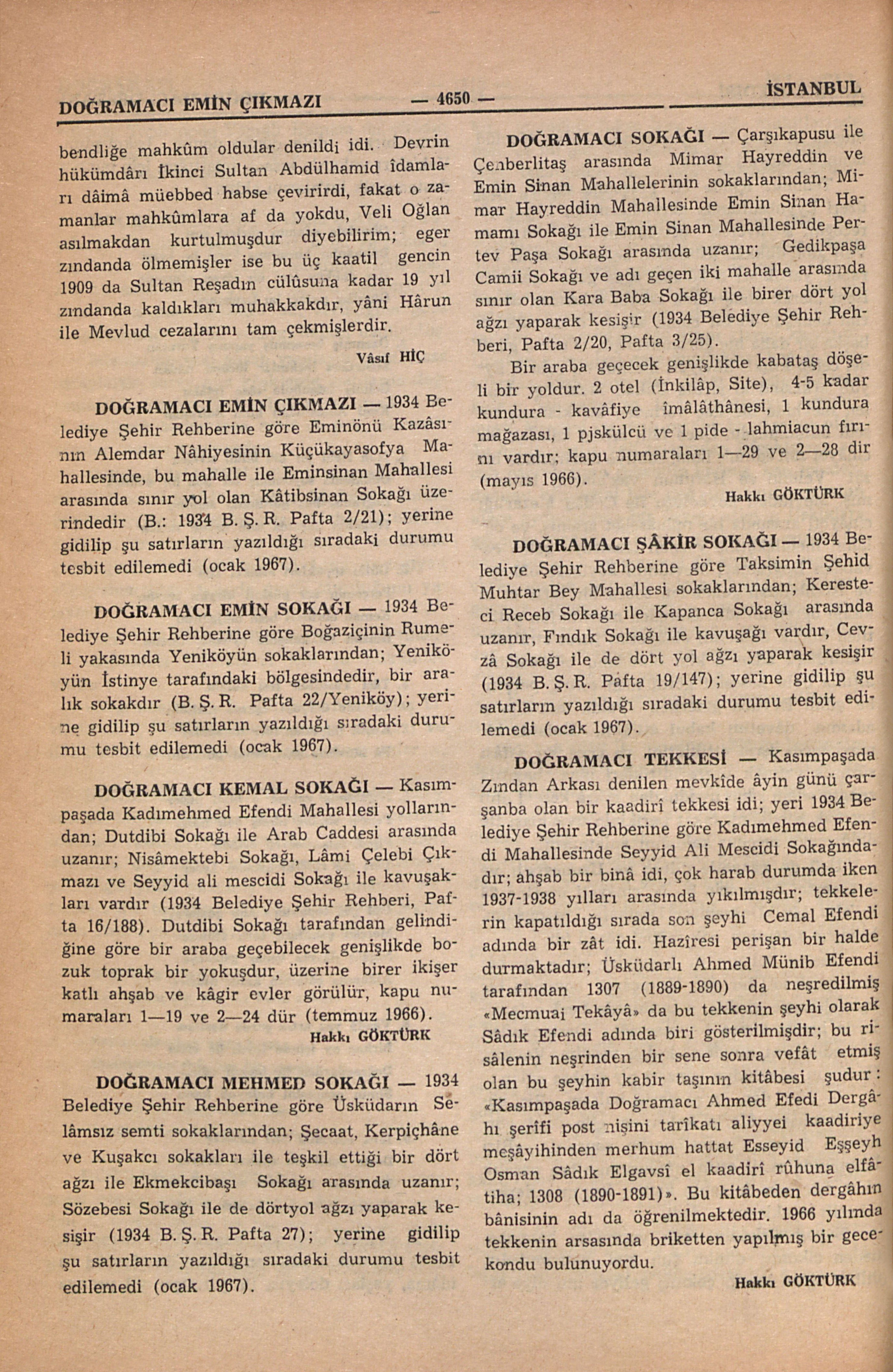 1934 Belediye Şehir Rehberine göre Boğaziçinin Rumeli yakasında Yeniköyün sokaklarından; Yeniköyün İstinye tarafındaki bölgesindedir, bir aralık sokakdır (B.Ş.R. Pafta 22/Yeniköy); yerine gidilip şu satırların yazıldığı sıradaki durumu tesbit edilemedi (ocak 1967).