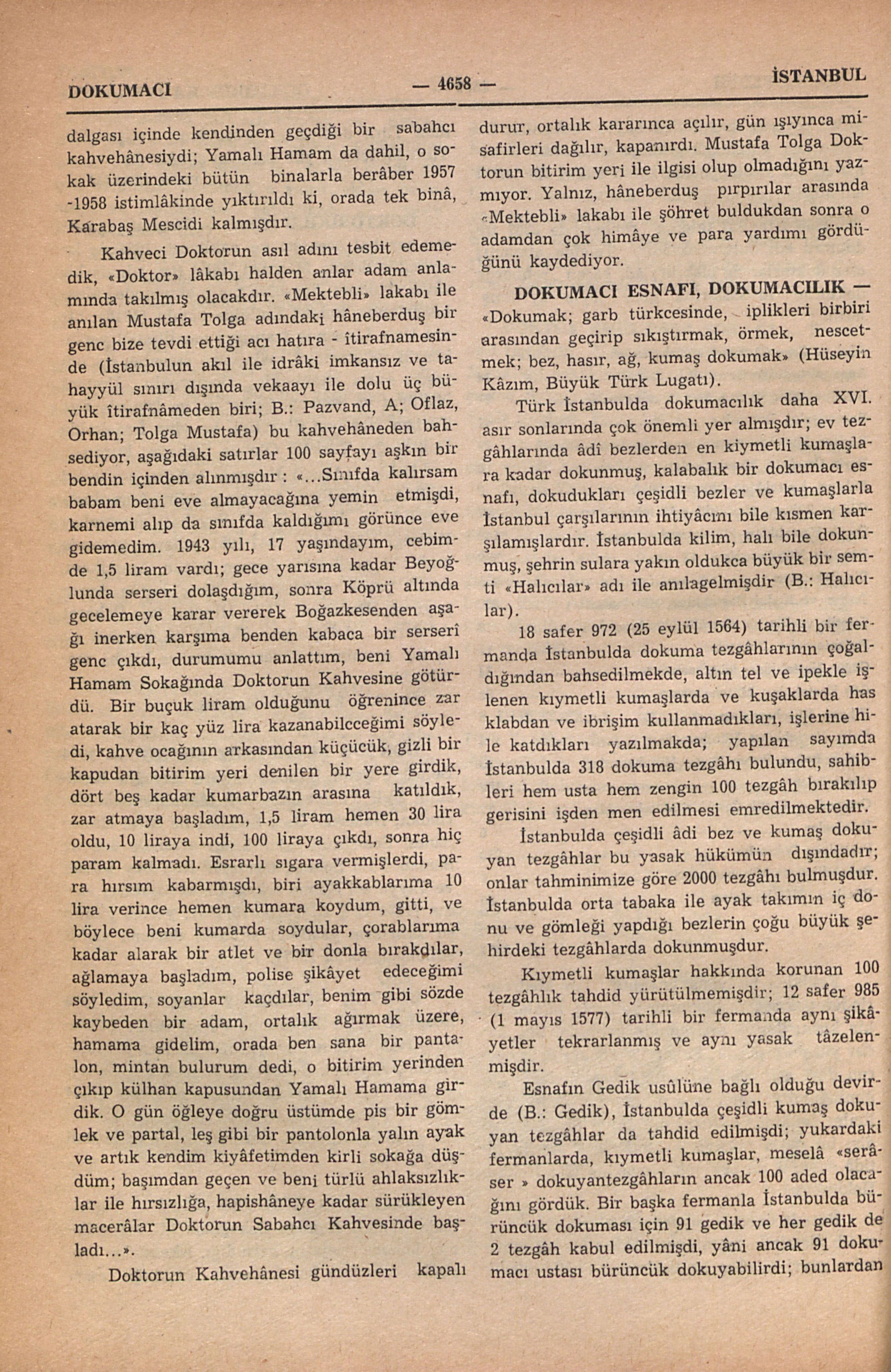 Tophânede Yamalı Hamam Sokağında idi, serserilerin, hâneberduşların barındığı, iskemleler üzerinde, masalara baş koyarak uyuduğu, esrar dalgası içinde kendinden geçdiği bir sabahcı kahvehânesiydi; Yamalı Hamam da dahil, o sokak üzerindeki bütün binalarla berâber 1957-1958 istimlâkinde yıktırıldı ki, orada tek binâ, Karabaş Mescidi kalmışdır. Kahveci Doktorun asıl adını tesbit edemedik, “Doktor” lâkabı halden anlar adam anlamında takılmış olacakdır. “Mektebli” lakabı ile anılan Mustafa Tolga adındaki hâneberduş bir genc bize tevdi ettiği acı hatıra - itirafnamesinde (İstanbulun akıl ile idrâki imkansız ve tahayyül sınırı dışında vekaayı ile dolu üç büyük îtirafnâmeden biri; B.: Pazvand, A; Oflaz, Orhan; Tolga Mustafa) bu kahvehâneden bahsediyor, aşağıdaki satırlar 100 sayfayı aşkın bir bendin içinden alınmışdır : “...Sınıfda kalırsam babam beni eve almayacağına yemin etmişdi, karnemi alıp da sınıfda kaldığımı görünce eve gidemedim. 1943 yılı, 17 yaşındayım, cebimde 1,5 liram vardı; gece yarısına kadar Beyoğlunda serseri dolaşdığım, sonra Köprü altında gecelemeye karar vererek Boğazkesenden aşağı inerken karşıma benden kabaca bir serserî genc çıkdı, durumumu anlattım, beni Yamalı Hamam Sokağında Doktorun Kahvesine götürdü. Bir buçuk liram olduğunu öğrenince zar atarak bir kaç yüz lira kazanabileceğimi söyledi, kahve ocağının arkasından küçücük, gizli bir kapudan bitirim yeri denilen bir yere girdik, dört beş kadar kumarbazın arasına katıldık, zar atmaya başladım, 1,5 liram hemen 30 lira oldu, 10 liraya indi, 100 liraya çıkdı, sonra hiç param kalmadı. Esrarlı sıgara vermişlerdi, para hırsım kabarmışdı, biri ayakkabılarıma 10 lira verince hemen kumara koydum, gitti, ve böylece beni kumarda soydular, çorablarıma kadar alarak bir atlet ve bir donla bırakdılar, ağlamaya başladım, polise şikâyet edeceğimi söyledim, soyanlar kaçdılar, benim gibi sözde kaybeden bir adam, ortalık ağırmak üzere, hamama gidelim, orada ben sana bir pantalon, mintan bulurum dedi, o bitirim yerinden çıkıp külhan kapusundan Yamalı Hamama girdik. O gün öğleye doğru üstümde pis bir gömlek ve partal, leş gibi bir pantolonla yalın ayak ve artık kendim kiyâfetimden kirli sokağa düşdüm; başımdan geçen ve beni türlü ahlaksızlıklar ile hırsızlığa, hapishâneye kadar sürükleyen macerâlar Doktorun Sabahcı Kahvesinde başladı...”. Doktorun Kahvehânesi gündüzleri kapalı durur, ortalık kararınca açılır, gün ışıyınca misafirleri dağılır, kapanırdı. Mustafa Tolga Doktorun bitirim yeri ile ilgisi olup olmadığını yazmıyor. Yalnız, hâneberduş pırpırılar arasında “Mektebli” lakabı ile şöhret buldukdan sonra o adamdan çok himâye ve para yardımı gördüğünü kaydediyor.