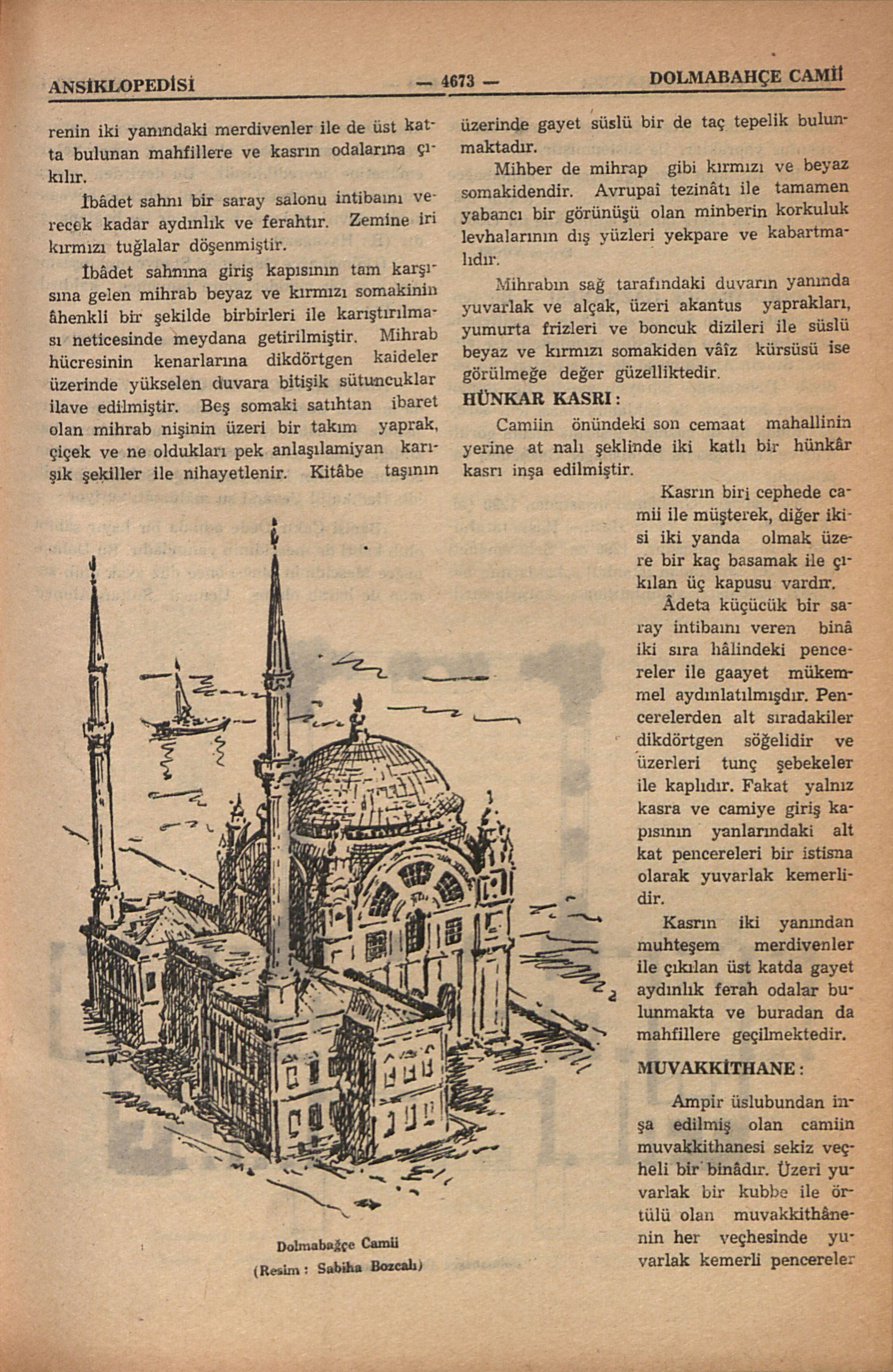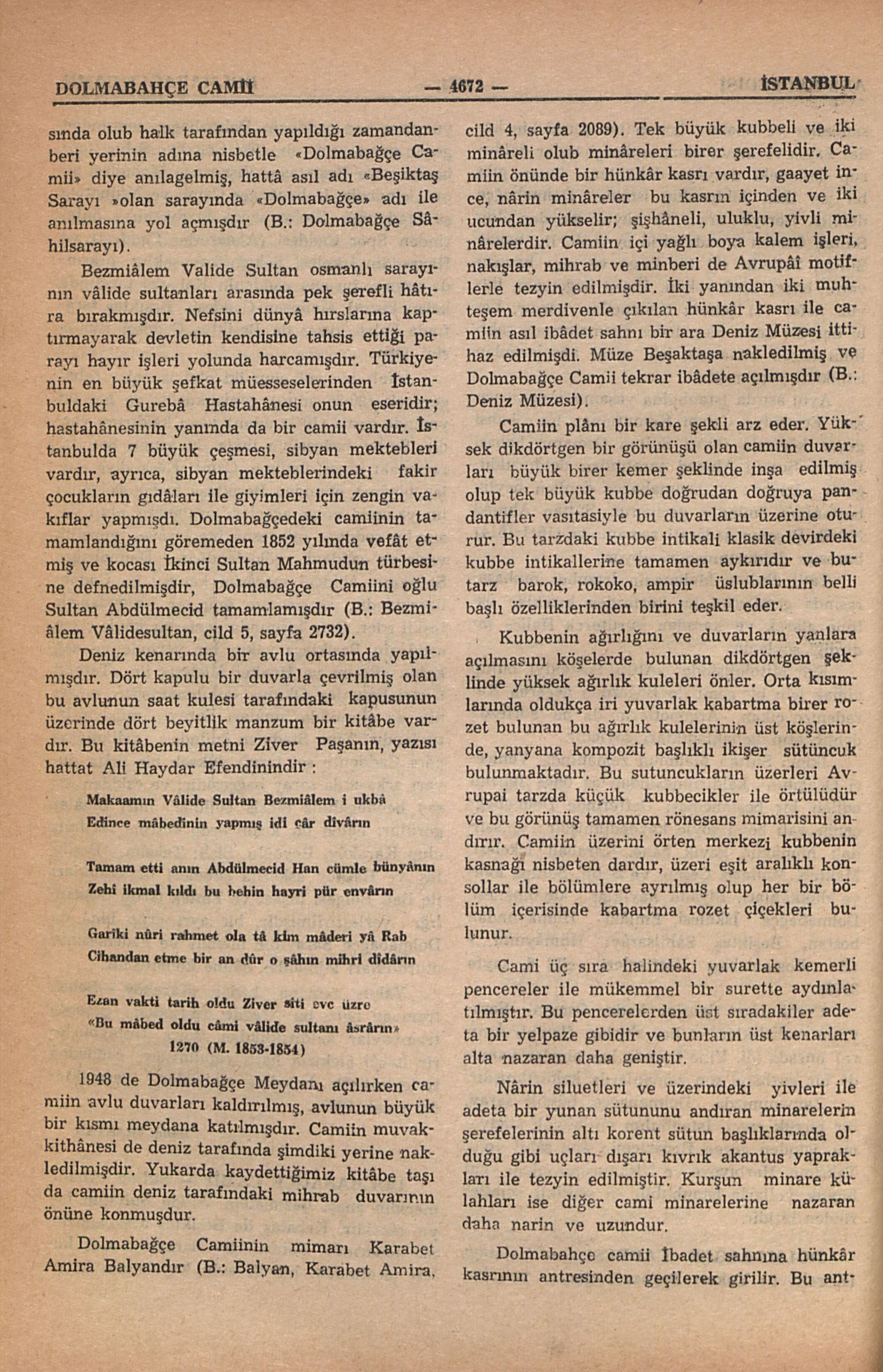 Dolmabağçe Camiinin mimarı Karabet Amira Balyandır (B.: Balyan, Karabet Amira, cild 4, sayfa 2089). Tek büyük kubbeli ve iki minâreli olup minâreleri birer şerefelidir. Camiin önünde bir hünkâr kasrı vardır, gaayet ince, nârin minâreler bu kasrın içinden ve iki ucundan yükselir; şişhâneli, uluklu, yivli minârelerdir. Camiin içi yağlı boya kalem işleri, nakışlar, mihrab ve minberi de Avrupâî motiflerle tezyin edilmişdir. İki yanından iki muhteşem merdivenle çıkılan hünkâr kasrı ile camiin asıl ibâdet sahnı bir ara Deniz Müzesi ittihaz edilmişdi. Müze Beşiktaşa nakledilmiş ve Dolmabağçe Camii tekrar ibâdete açılmışdır (B.: Deniz Müzesi).