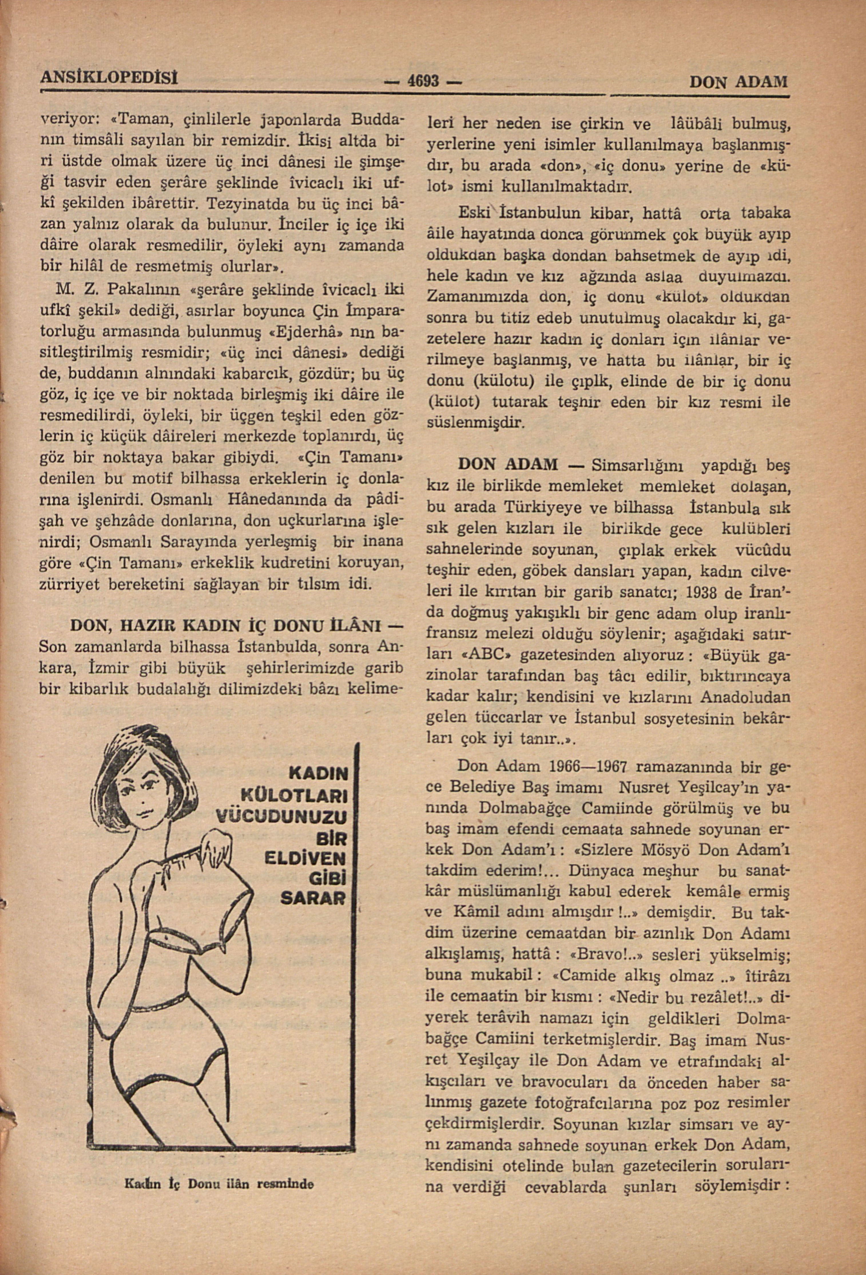 Son zamanlarda bilhassa İstanbulda, sonra Ankara, İzmir gibi büyük şehirlerimizde garib bir kibarlık budalalığı dilimizdeki bâzı kelimeleri her neden ise çirkin ve lâübâli bulmuş, yerlerine yeni isimler kullanılmaya başlanmışdır, bu arada “don”, “iç donu” yerine de “külot” ismi kullanılmaktadır. Eski İstanbulun kibar, hattâ orta tabaka âile hayatında donca görünmek çok büyük ayıp oldukdan başka dondan bahsetmek de ayıp idi, hele kadın ve kız ağzında aslaa duyulmazdı. Zamanımızda don, iç donu “külot” oldukdan sonra bu titiz edeb unutulmuş olacakdır ki, gazetelere hazır kadın iç donları için ilânlar verilmeye başlanmış, ve hatta bu ilânlar, bir iç donu (külotu) ile çıplak, elinde de bir iç donu (külot) tutarak teşhir eden bir kız resmi ile süslenmişdir. Kadın İç Donu ilân resminde
