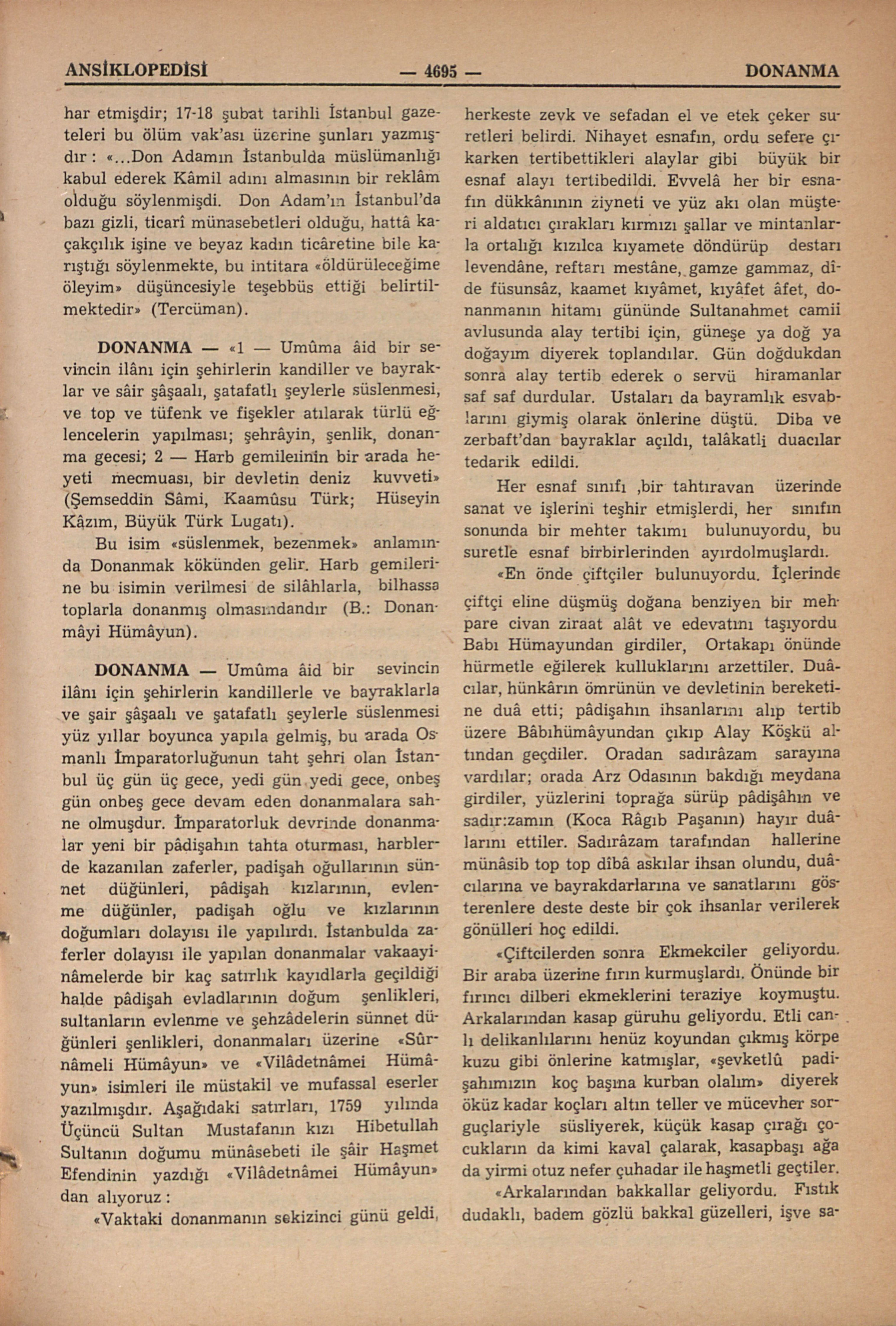 “1 — Umûma âid bir sevincin ilânı için şehirlerin kandiller ve bayraklar ve sâir şâşaalı, satafatlı şeylerle süslenmesi, ve top ve tüfenk ve fişekler atılarak türlü eğlencelerin yapılması; şehrâyin, şenlik, donanma gecesi; 2 — Harb gemilerinin bir arada heyeti mecmusı, bir devletin deniz kuvveti” (Şemseddin Sâmi, Kaamûsu Türk; Hüseyin Kâzım, Büyük Türk Lugatı). Bu isim “süslenmek, bezenmek” anlamında Donanmak kökünden gelir. Harb gemilerine bu isimin verilmesi de silâhlarla, bilhassa toplarla donanmış olmasındandır (B.: Donanmâyi Hümâyun).