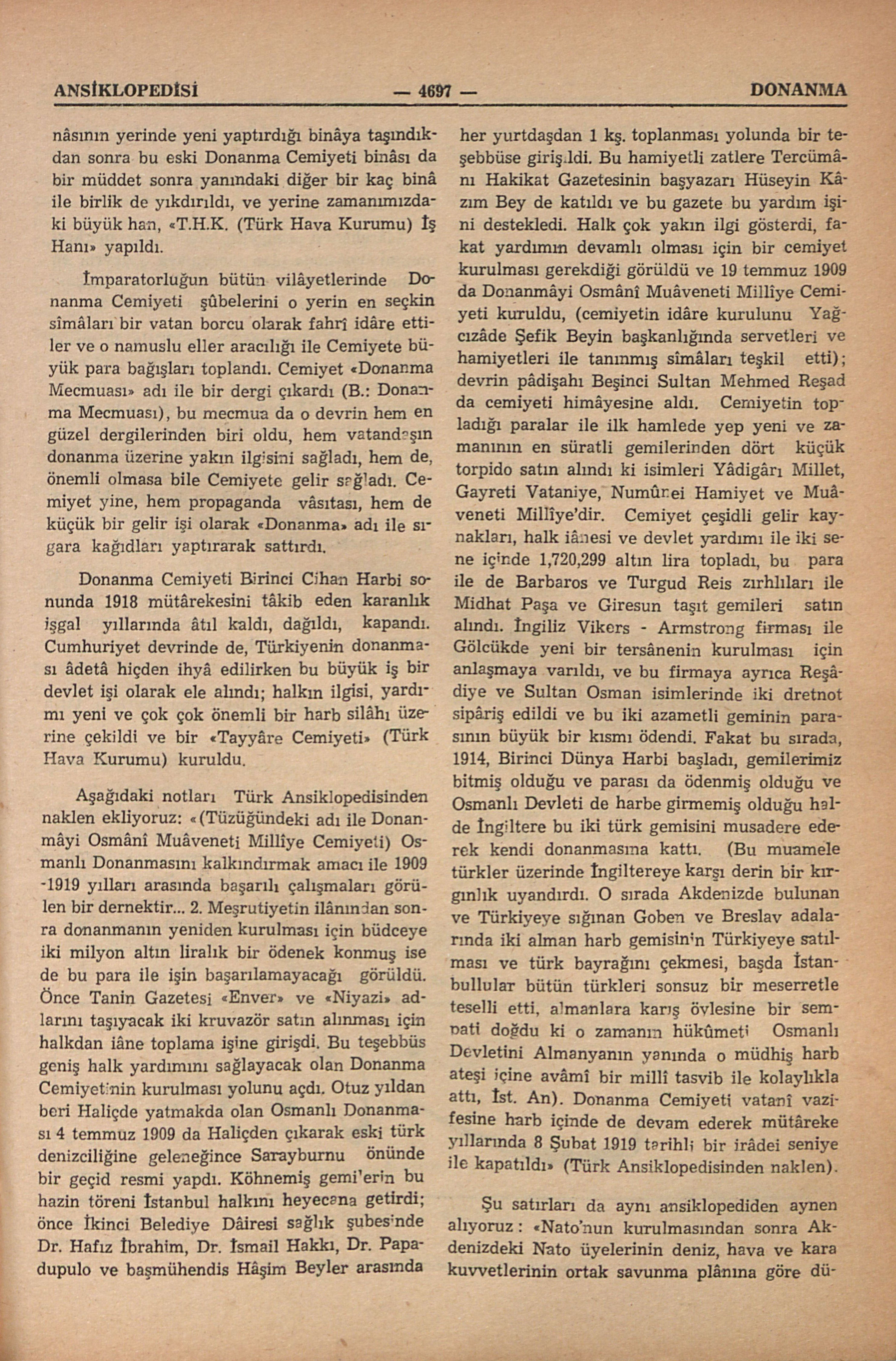 Aşağıdaki notları Türk Ansiklopedisinden naklen ekliyoruz: “(Tüzüğündeki adı ile Donanmâyi Osmânî Muâveneti Millîye Cemiyeti) Osmanlı Donanmasını kalkındırmak amacı ile 1909-1919 yılları arasında başarılı çalışmaları görülen bir dernektir... 2. Meşrutiyetin ilânından sonra donanmanın yeniden kurulması için büdceye iki milyon altın liralık bir ödenek konmuş ise de bu para ile işin başarılamayacağı görüldü. Önce Tanin Gazetesi “Enver” ve “Niyazi” adlarını taşıyacak iki kruvazör satın alınması için halkdan iâne toplama işine girişdi. Bu teşebbüs geniş halk yardımını sağlayacak olan Donanma Cemiyetinin kurulması yolunu açdı. Otuz yıldan beri Haliçde yatmakda olan Osmanlı Donanması 4 temmuz 1909 da Haliçden çıkarak eski türk denizciliğine geleneğince Sarayburnu önünde bir geçid resmi yapdı. Köhnemiş gemilerin bu hazin töreni İstanbul halkını heyecana getirdi; önce İkinci Belediye Dâiresi sağlık şubesinde Dr. Hafız İbrahim, Dr. İsmail Hakkı, Dr. Papadupulo ve başmühendis Hâşim Beyler arasında her yurtdaşdan 1 kş. toplanması yolunda bir teşebbüse giriş idi. Bu hamiyetli zatlere Tercümânı Hakikat Gazetesinin başyazarı Hüseyin Kâzım Bey de katıldı ve bu gazete bu yardım işini destekledi. Halk çok yakın ilgi gösterdi, fakat yardımın devamlı olması için bir cemiyet kurulması gerekdiği görüldü ve 19 temmuz 1909 da Donanmâyi Osmânî Muâveneti Millîye Cemiyeti kuruldu, (cemiyetin idâre kurulunu Yağcızâde Şefik Beyin başkanlığında servetleri ve hamiyetleri ile tanınmış sîmâları teşkil etti); devrin pâdişahı Beşinci Sultan Mehmed Reşad da cemiyeti himâyesine aldı. Cemiyetin topladığı paralar ile ilk hamlede yep yeni ve zamanının en süratli gemilerinden dört küçük torpido satın alındı ki isimleri Yâdigârı Millet, Gayreti Vataniye, Numûnei Hamiyet ve Muâveneti Millîye’dir. Cemiyet çeşidli gelir kaynakları, halk iânesi ve devlet yardımı ile iki sene içinde 1,720,299 altın lira topladı, bu para ile da Barbaros ve Turgud Reis zırhlıları ile Midhat Paşa ve Giresun taşıt gemileri satın alındı. İngiliz Vikers - Armstrong firması ile Gölcükde yenri bir tersânenin kurulması için anlaşmaya varıldı, ve bu firmaya ayrıca Reşâdiye ve Sultan Osman isimlerinde iki dretnot sipâriş edildi ve bu iki azametli geminin parasının büyük bir kısmı ödendi. Fakat bu sırada 1914, Birinci Dünya Harbi başladı, gemilerimiz bitmiş olduğu ve parası da ödenmiş olduğu ve Osmanlı Devleti de harbe girmemiş olduğu halde İngiltere bu iki türk gemisini musadere ederek kendi donanmasına kattı. (Bu muamele türkler üzerinde İngiltereye karşı derin bir kırgınlık uyandırdı. O sırada Akdenizde bulunan ve Türkiyeye sığınan Goben ve Breslav adalarında iki alman harb gemisinin Türkiyeye satılması ve türk bayrağını çekmesi, başda İstanbullular bütün türkleri sonsuz bir meserretle teselli etti, almanlara karış öylesine bir sempati doğdu ki o zamanın hükûmeti Osmanlı Devletini Almanyanın yanında o müdhiş harb ateşi içine avâmî bir millî tasvib ile kolaylıkla attı, İst. An). Donanma Cemiyeti vatanî vazifesine harb içinde de devam ederek mütâreke yıllarında 8 Şubat 1919 tarihli bir irâdei senîye ile kapatıldı” (Türk Ansiklopedisinden naklen).