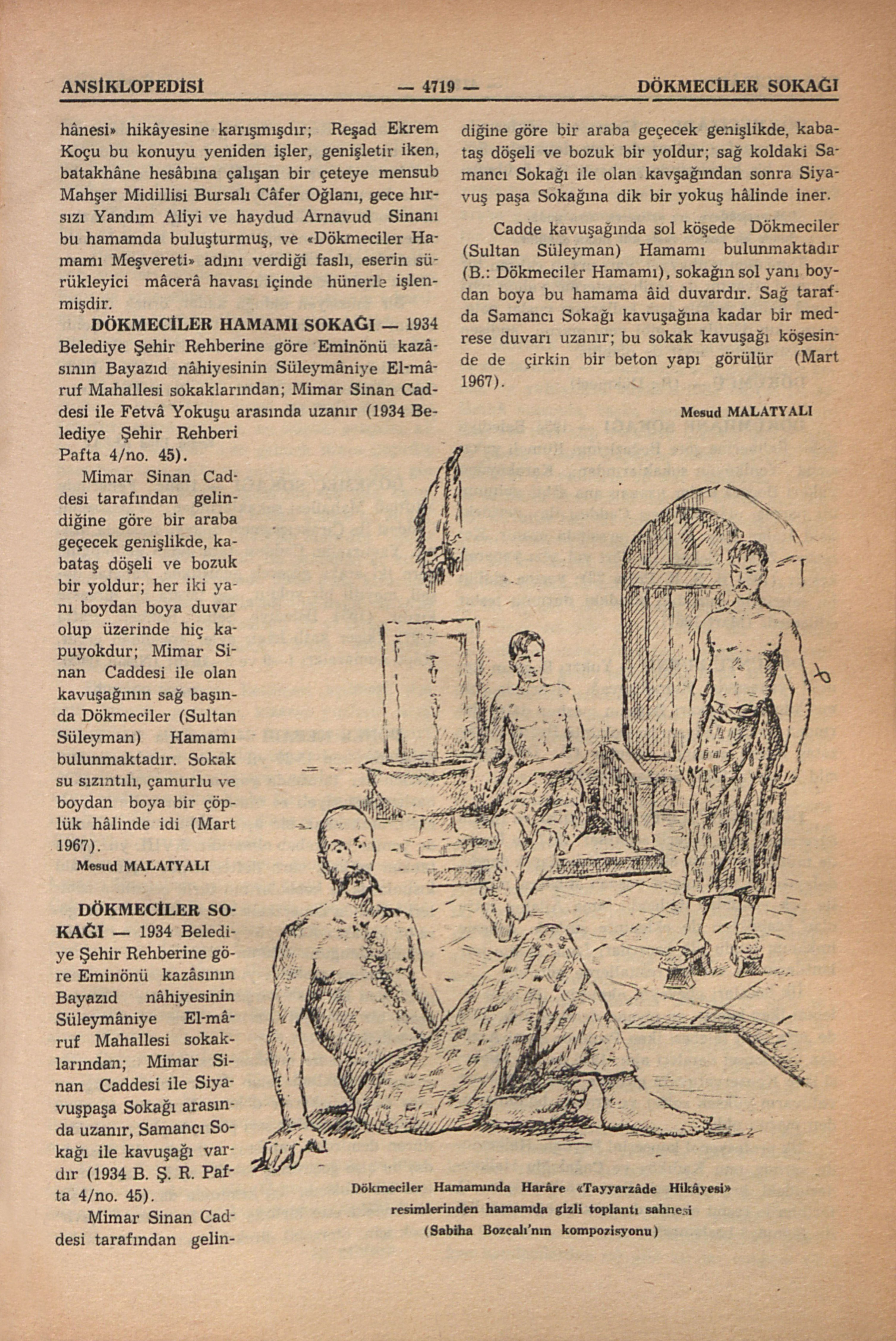 Mimar Sinan Caddesi tarafından gelindiğine göre bir araba geçecek genişlikde, kabataş döşeli ve bozuk bir yoldur; her iki yanı boydan boya duvar olup üzerinde hiç kapuyokdur; Mimar Sinan Caddesi ile olan kavuşağının sağ başında Dökmeciler (Sultan Süleyman) Hamamı bulunmaktadır. Sokak su sızıntılı, çamurlu ve boydan boya bir çöplük hâlinde idi (Mart 1967).