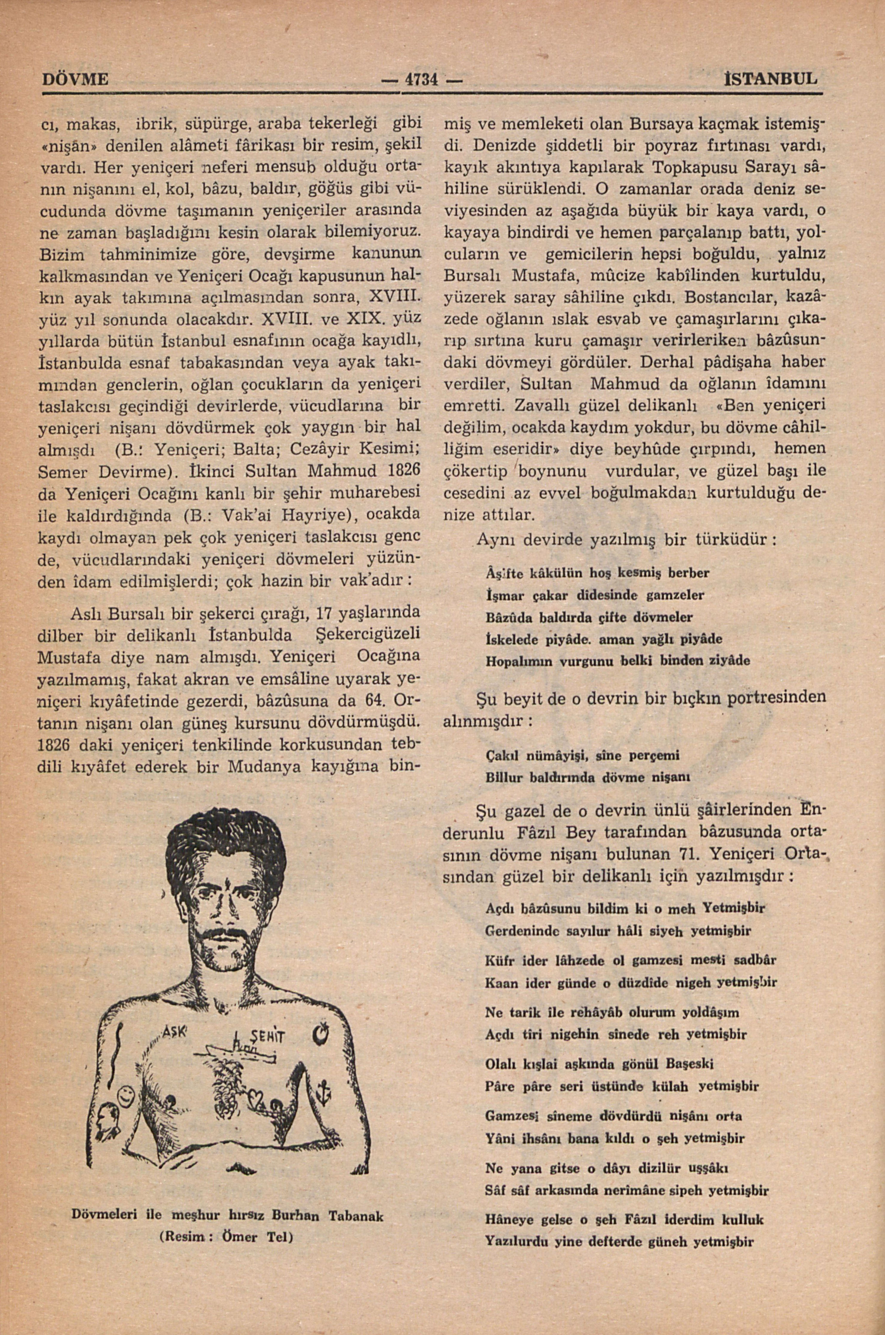 Bizde Tersânelilerden başka yeniçeriler arasında da dövme, ocaklarına karşı taassubla bağlılıklarının en parlak nümâyişi, gösteri bilinmişdi. 196 ortadan (taburdan) mürekkeb olarak kurulmuş Yeniçeri Ocağında her ortanın, meselâ çatal uçlu kılıç (Hz. Alinin Zülfikârı), ok, yay, tüfek, top, gülle, mızrak ucu, tuğ, çadır, bayrak, balta, cami, minâre, minâre alemi, cami merdiveni, adi merdiven, arslan, fil, deve, kurt, köpek, kartal, şâhin, balıkcıl kuşu, kadırga, gemi çapası, el-pençe, güneş kursu, hilâl, hurma ağacı, servi ağacı, makas, ibrik, süpürge, araba tekerleği gibi “nişan” denilen alâmeti fârikası bir resim, şekil vardı. Her yeniçeri nef...