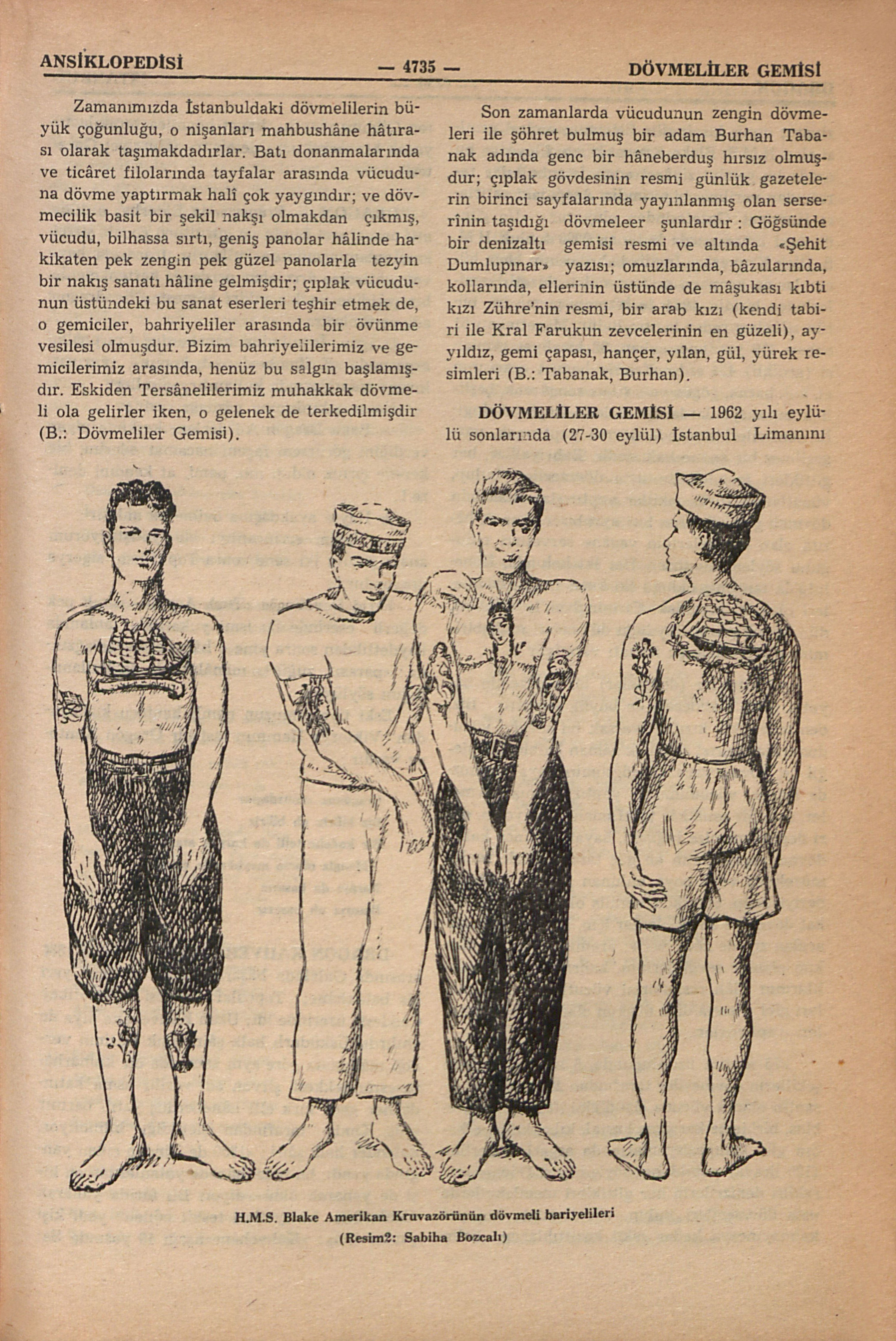 Son zamanlarda vücudunun zengin dövmeleri ile şöhret bulmuş bir adam Burhan Tabanak adında genç bir hâneberduş hırsız olmuşdur; çıplak gövdesini resmi günlük gazetelerin birinci sayfalarında yayınlanmış olan serserînin taşıdığı dövmeler şunlardır : Göğsünde bir denizaltı gemisi resmi ve altında “Şehit Dumlupınar” yazısı; omuzlarında, bâzularında, kollarında, ellerinin üstünde de mâşukası kıbti kızı Zühre’nin resmi, bir arab kızı (kendi tabiri ile Kral Farukun zevcelerinden en güzeli), ayyıldız, gemi çapası, hançer, yılan, gül, yürek resimleri (B.: Tabanak, Burhan).