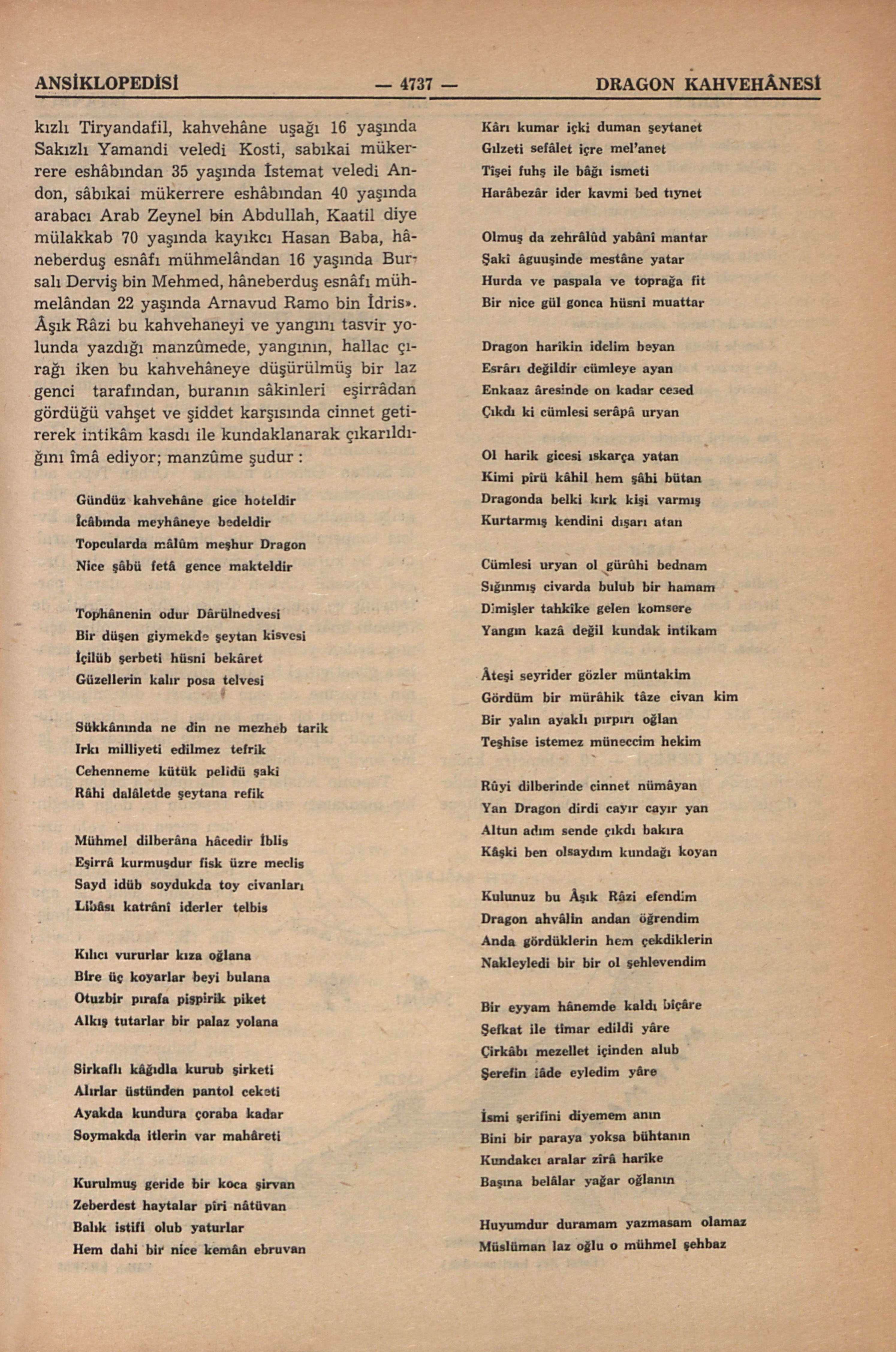 1870 ile 1881 arasında Galatada haşarat yatağı bitirim yeri bir batakhâne; Topcular Caddesi (Necâtibey Caddesi) üzerinde idi; Uzun Kahvehâne diye de anılırdı; Üsküdarlı halk şâiri Âşık Râzinin verdiği mâlûmata göre aynı zamanda bir kumarhâne-esrar tekkesi, şirvan adı verilir asma katında her gece kırk elli hâneberduş yatıb barınır imiş. Kimin tarafından işletildiği bilinmiyor, kalender halk şâiri : “1300 de içinden çıkan yangında yandı; bu batakhânede yatanlardan on kişi de yanarak öldü” diyor. Bu fâciada yanarak ölenlerden hüviyetleri tesbit edilen yedi kişi şunlar imiş : “Kahvehâne uşağı 19 yaşında Sakızlı Tiryandafil, kahvehâne uşağı 16 yaşında Sakızlı Yamandi veledi Kosti, sabıkai mükerrere eshâbından 35 yaşında İstemat veledi Andon, sâbıkai mükerrere eshâbından 40 yaşında arabacı Arab Zeynel bin Abdullah, Kaatil diye mülakkab 70 yaşında kayıkcı Hasan Baba, hâneberduş esnâfı mühmelândan 16 yaşında Bursalı Derviş bin Mehmed, hâneberduş esnâfı mühmelândan 22 yaşında Arnavud Ramo bin İdris”. Âşık Râzi bu kahvehaneyi ve yangını tavir yolunda yazdığı manzûmede, yangının, hallac çırağı iken bu kahvehâneye düşürülmüş bir laz genci tarafından, buranın sâkinleri eşirrâdan gördüğü vahşet ve şiddet karşısında cinnet getirerek intikâm kasdı ile kundaklanarak çıkarıldığını îmâ ediyor; man...