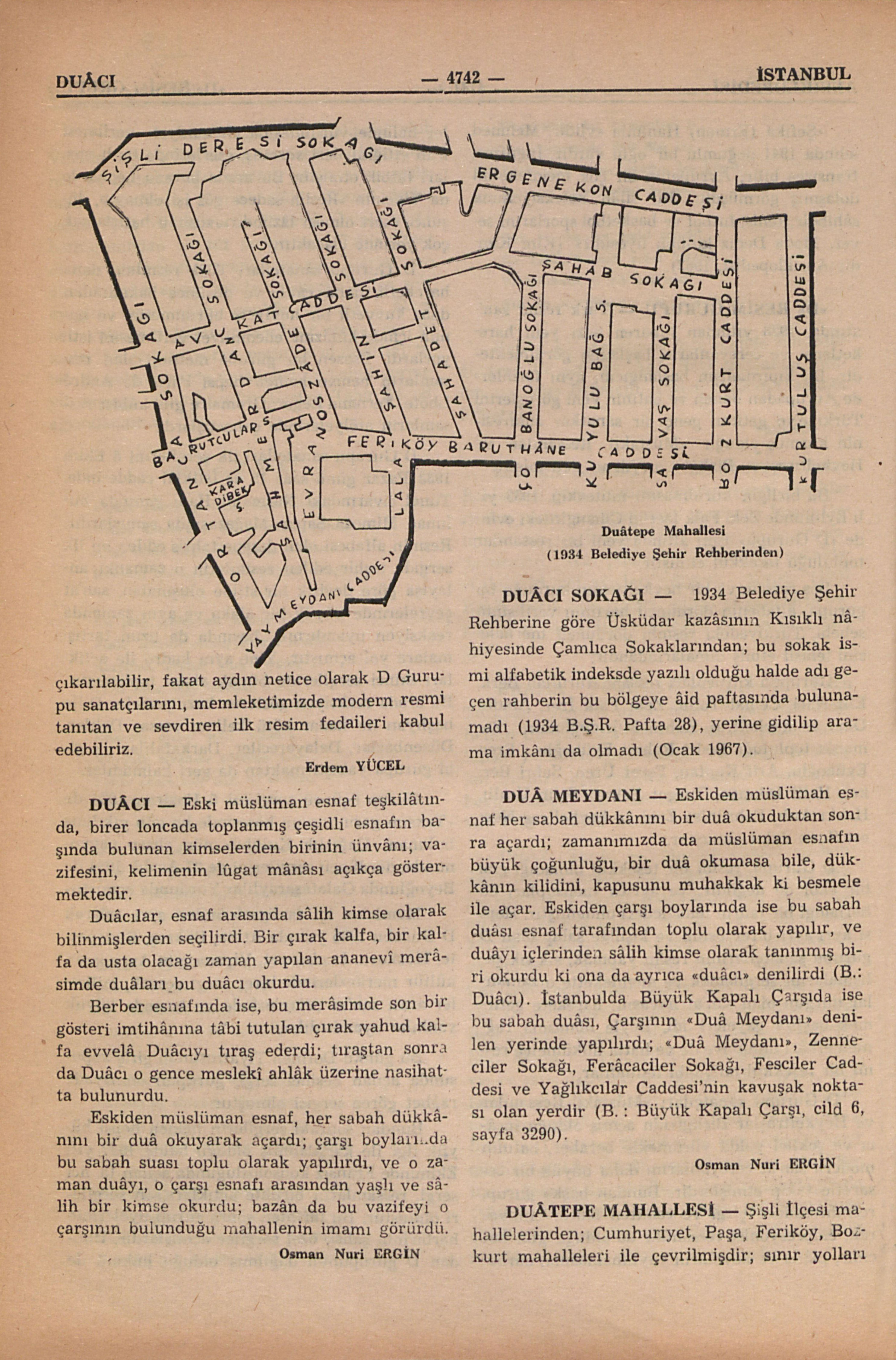 Şişli İlçesi mahallelerinden; Cumhuriyet, Paşa, Feriköy, Bozkurt mahalleleri ile çevrilmişdir; sınır yolları şunlardır : Şişli Deresi Sokağı, Ergenekon Caddesi (Cumhuriyet mahallesi ile), Ortanca Sokağı (Paşa Mahallesi ile), Yay Meydanı Caddesinin bir kısmı, Lala Şahin Sokağı, Feriköy Baruthane Caddesinin bir kısmı (Feriköy Mahallesi ile), Kurtuluş Caddesinin bir kısmı (Bozkurt Mahallesi ile); İç sokaklar şunlardır : Şahmerdan Sokağı, Karabiber Sokağı, Barutçular Sokağının bir kısmı, Keşfî Efendi Sokağı, Avukat Caddesi, Evranoszâde Sokağı, Lala Şahin Sokağının bir kısmı, Şahadet Sokağı, Çobanoğlu Sokağının bir kısmı, Yemişli bağçe Sokağı, Şahab Sokağı, Kuyu Sokağının bir kısmı, Savaş Sokağının bir kısmı Bozkurt Caddesinin bir kısmı (1934 Belediye Şehir Rehberi, pafta 18/156). Bu mahallede 1 Rum ortodoks kilisesi (Ayii Apostoli Kilisesi), 1 ermeni kilisesi, 1 ermeni okulu, 1 dispanser, 1 polis karakolu, 295 ev, 197 apartıman, 181 dükkân vardır. 1960 sayımına göre nüfûsu 2656 erkek ve 2431 kadın olmak üzere 5087 kişidir. Bu satırların yazıldığı sırada mahalle muhtarlığında emekli polis Bay Nuri Atay bulunuyordu (ekim 1964). Duâtepe Mahallesi (1934 Belediye Şehir Rehberinden)