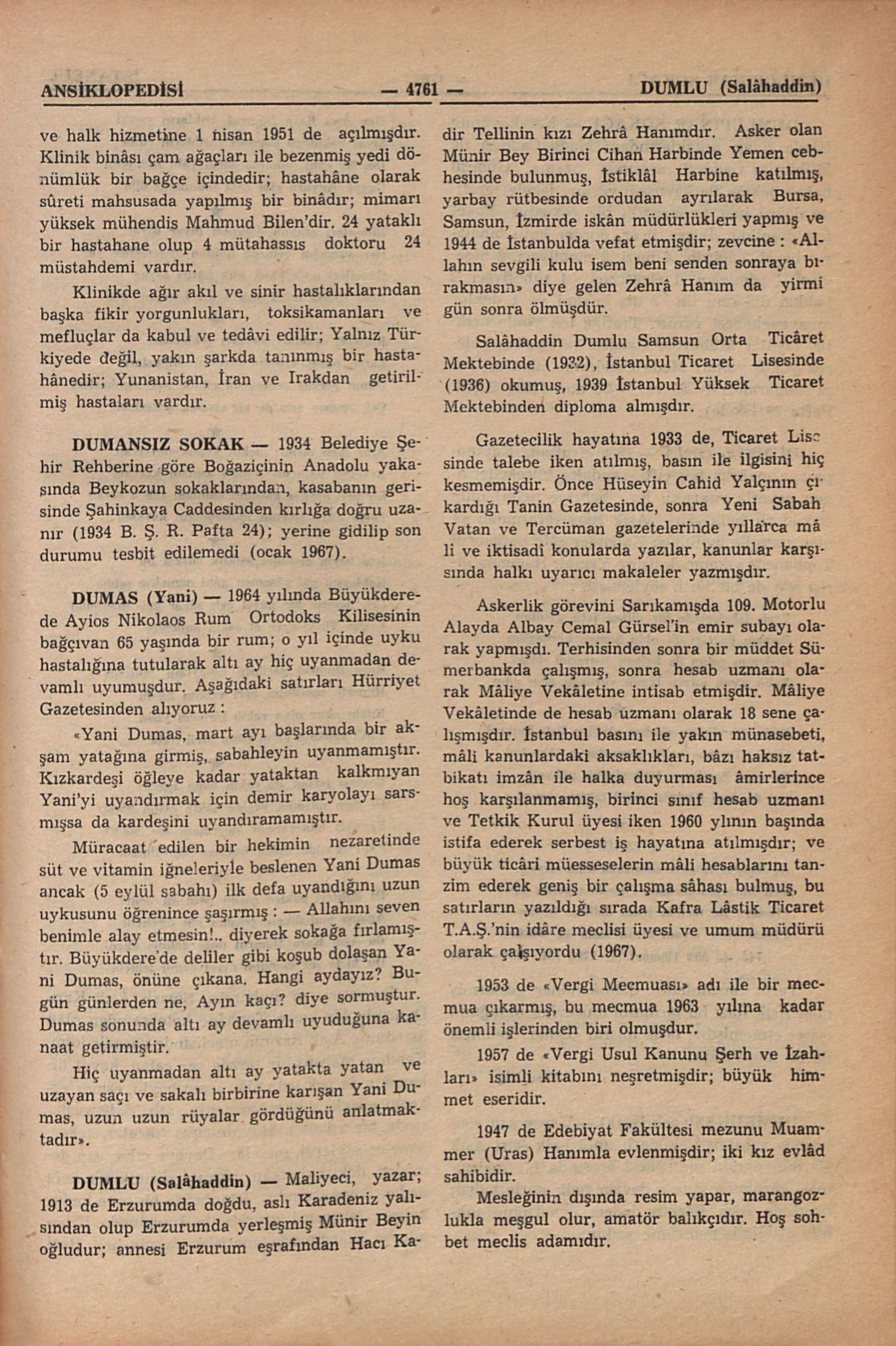 Bakırköyünde İncirli asfaltı üzerindedir; akıl ve sinir hastalıkları mütahassısı Dr. Rahmi Duman tarafndan kurulmuş ve halk hizmetine 1 nisan 1951 de açılmışdır. Klinik binâsı çam ağaçları ile bezenmiş yedi dönümlük bir bağçe içindedir; hastahâne olarak sûreti mahsusada yapılmış bir binâdır; mimarı yüksek mühendis Mahmud Bilen’dir. 24 yataklı bir hastahane olup 4 mütahassıs doktoru 24 müstahdemi vardır.