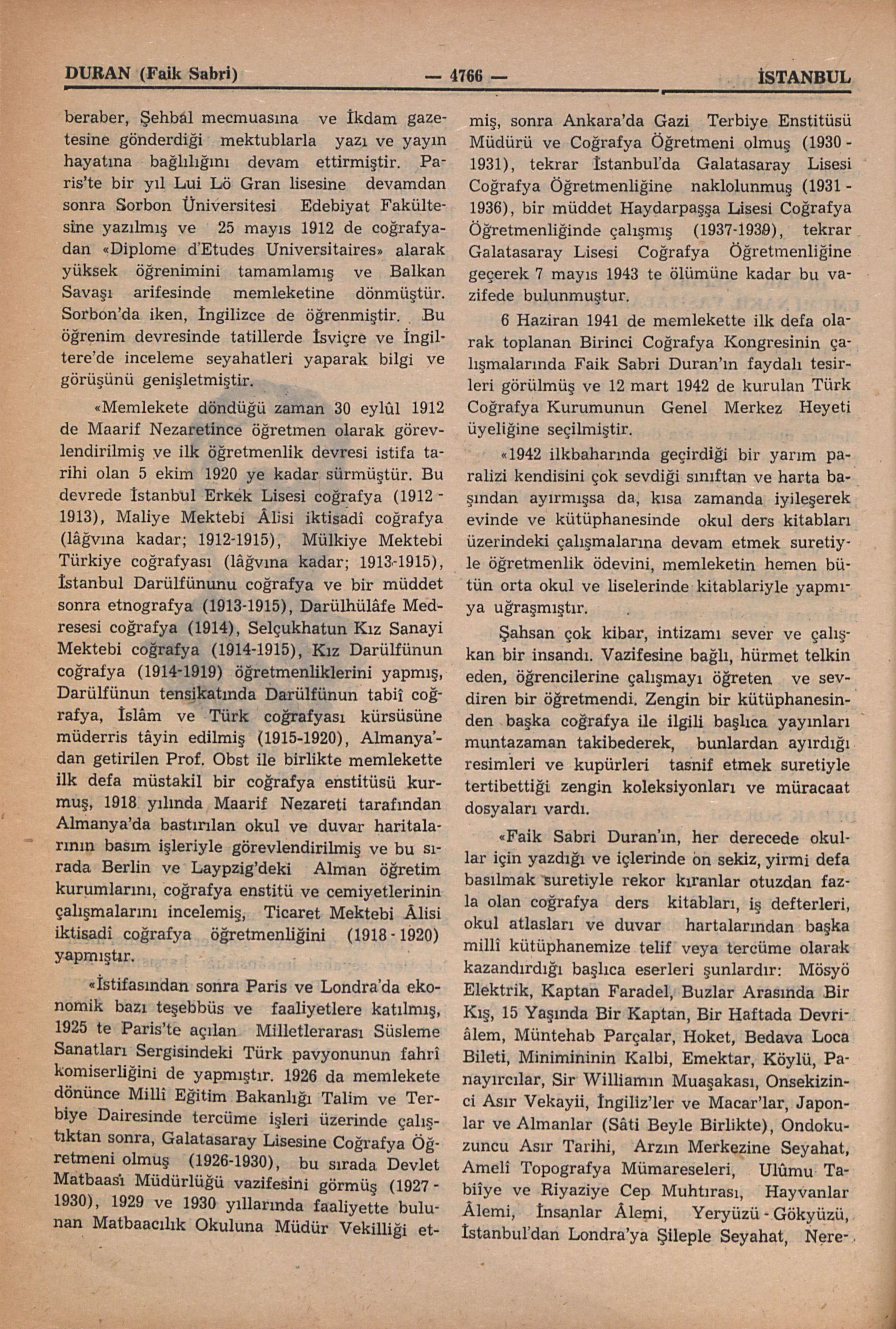 “Faik Sabri Duran, 1908 de İstanbul’a döner dönmez Resimli Kitab, Musavver Muhit ve Resimli Roman gibi dergileri çıkarmağa başlamışsa da öğrenmek ve yükselmek aşkı kendisini tekrar okul hayatına sürüklemiş, 1909 da Maarif Nezaretinin açtığı müsabakayı kazanmış ve Fransa’ya gönderilmiştir. Bununla beraber, Şehbal mecmuasına ve İkdam gazetesine gönderdiği mektublarla yazı ve yayın hayatına bağlılığını devam ettirmiştir. Paris’te bir yıl Lui Lö Gran lisesine devamdan sonra Sorbon Üniversitesi Edebiyat Fakültesine yazılmış ve 25 mayıs 1912 de coğrafyadan “Diplome d’Etudes Universitaires” alarak yüksek öğrenimini tamamlamış ve Balkan Savaşı arifesinde memleketine dönmüştür. Sorbon’da iken, İngilizce de öğrenmiştir. Bu öğrenim devresinde tatillerde İsviçre ve İngiltere’de inceleme seyahatleri yaparak bilgi ve görüşünü genişletmiştir.