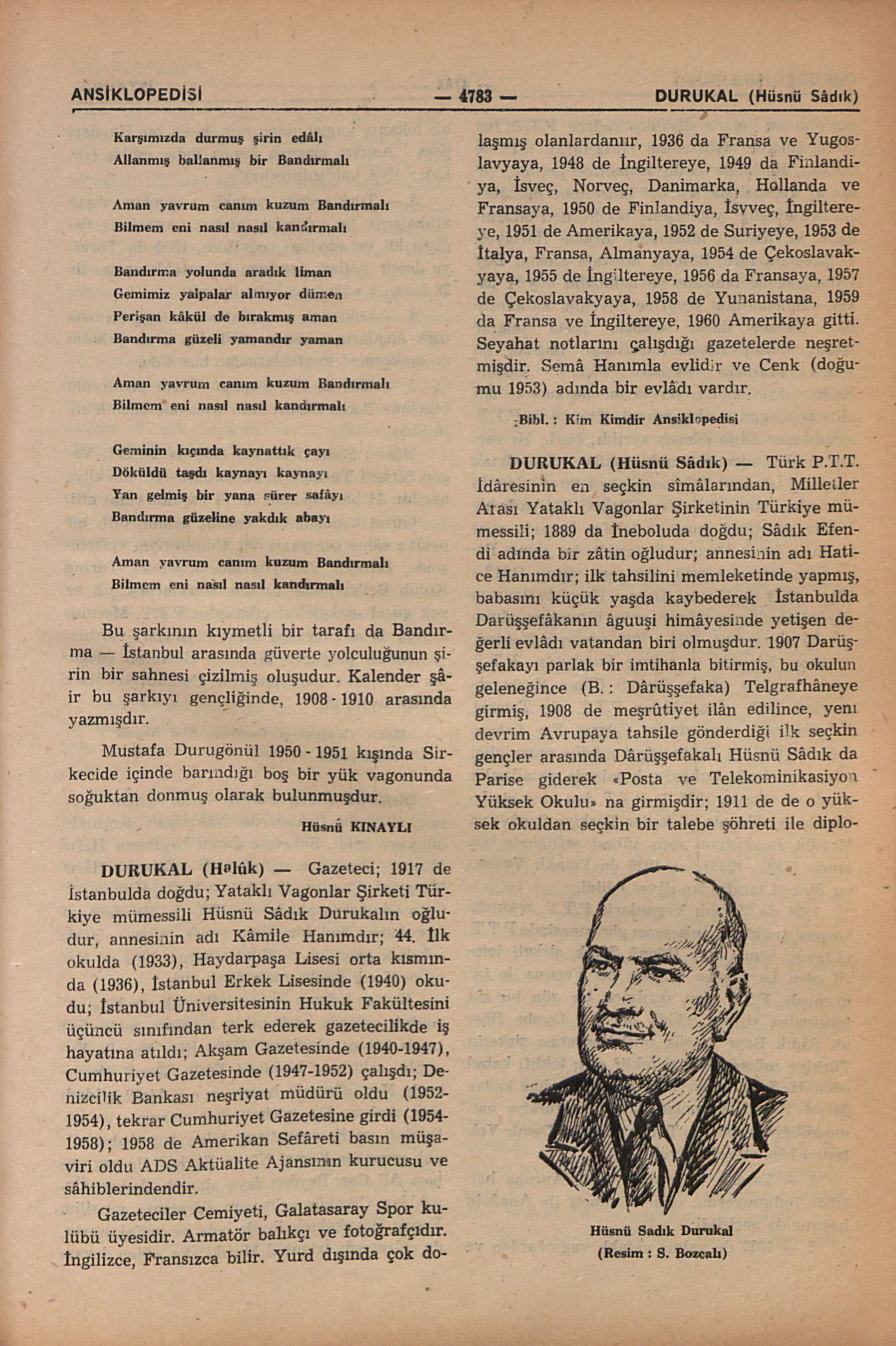 Gazeteci; 1917 de İstanbulda doğdu; Yataklı Vagonlar Şirketi Türkiye mümessili Hüsnü Sâdık Durukalın oğludur, annesinin adı Kâmile Hanımdır; 44. İlk okulda (1933), Haydarpaşa Lisesi orta kısmında (1936), İstanbul Erkek Lisesinde (1940) okudu; İstanbul Üniversitesinin Hukuk Fakültesini üçüncü sınıfından terk ederek gazetecilikde iş hayatına atıldı; Akşam Gazetesinde (1940-1947), Cumhuriyet Gazetesinde (1947-1952) çalışdı; Denizcilik Bankası neşriyat müdürü oldu (1952-1954), tekrar Cumhuriyet Gazetesine girdi (1954-1958); 1958 de Amerikan Sefâreti basın müşaviri oldu ADS Aktüalite Ajansının kurucusu ve sâhiblerindendir.
