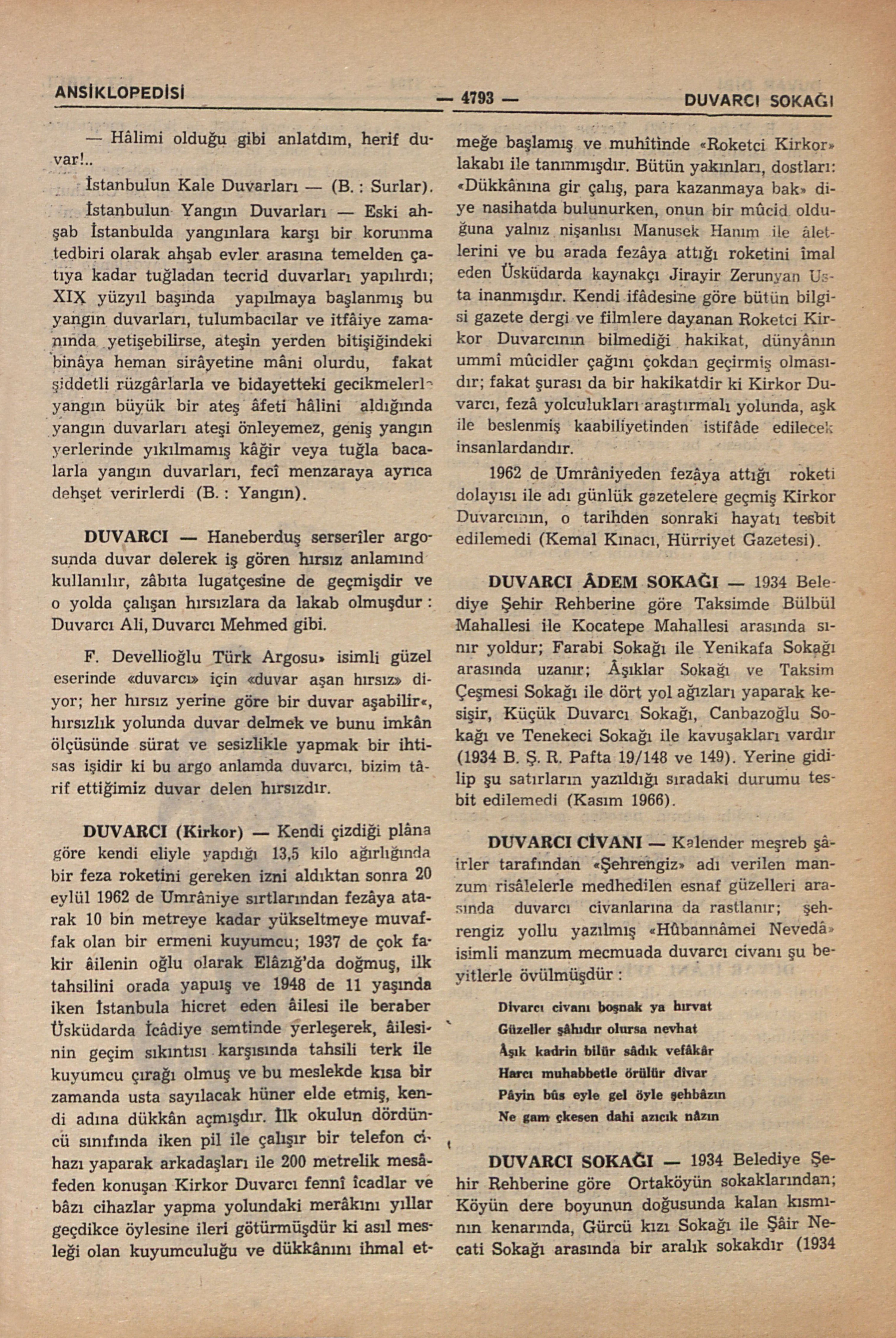 F. Devellioğlu Türk Argosu” isimli güzel eserinde “duvarcı” için “duvar aşan hırsız” diyor; her hırsız yerine göre bir duvar aşabilir“, hırsızlık yolunda duvar delmek ve bunu imkân ölçüsünde sürat ve sesizlikle yapmak bir ihtisas işidir ki bu argo anlamda duvarcı, bizim târif ettiğimiz duvar delen hırsızdır.