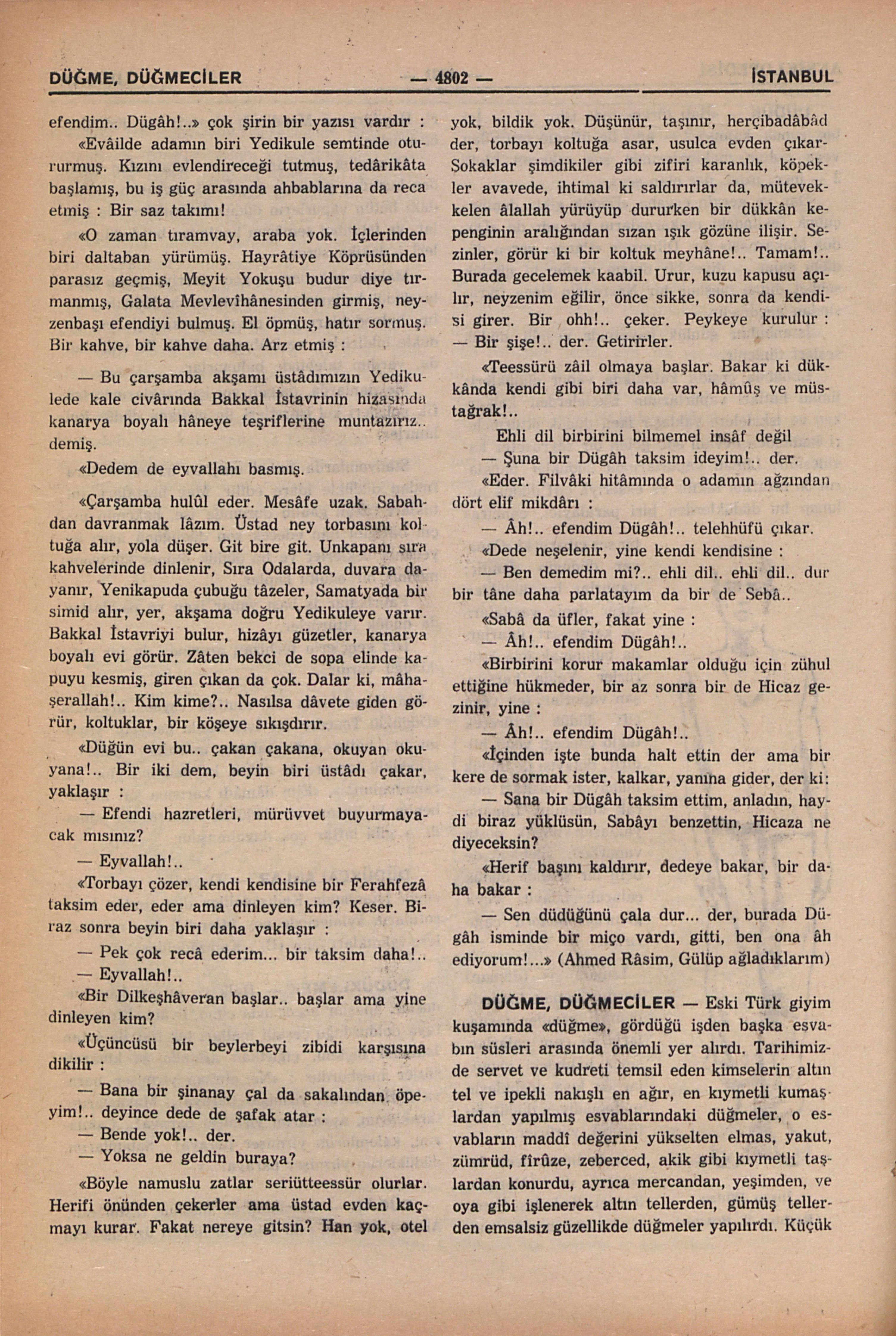 — Sen düdüğünü çala dur... der, burada Dügâh isminde bir miço vardı, gitti, ben ona âh ediyorum!...” (Ahmed Râsim, Gülüp ağladıklarım)