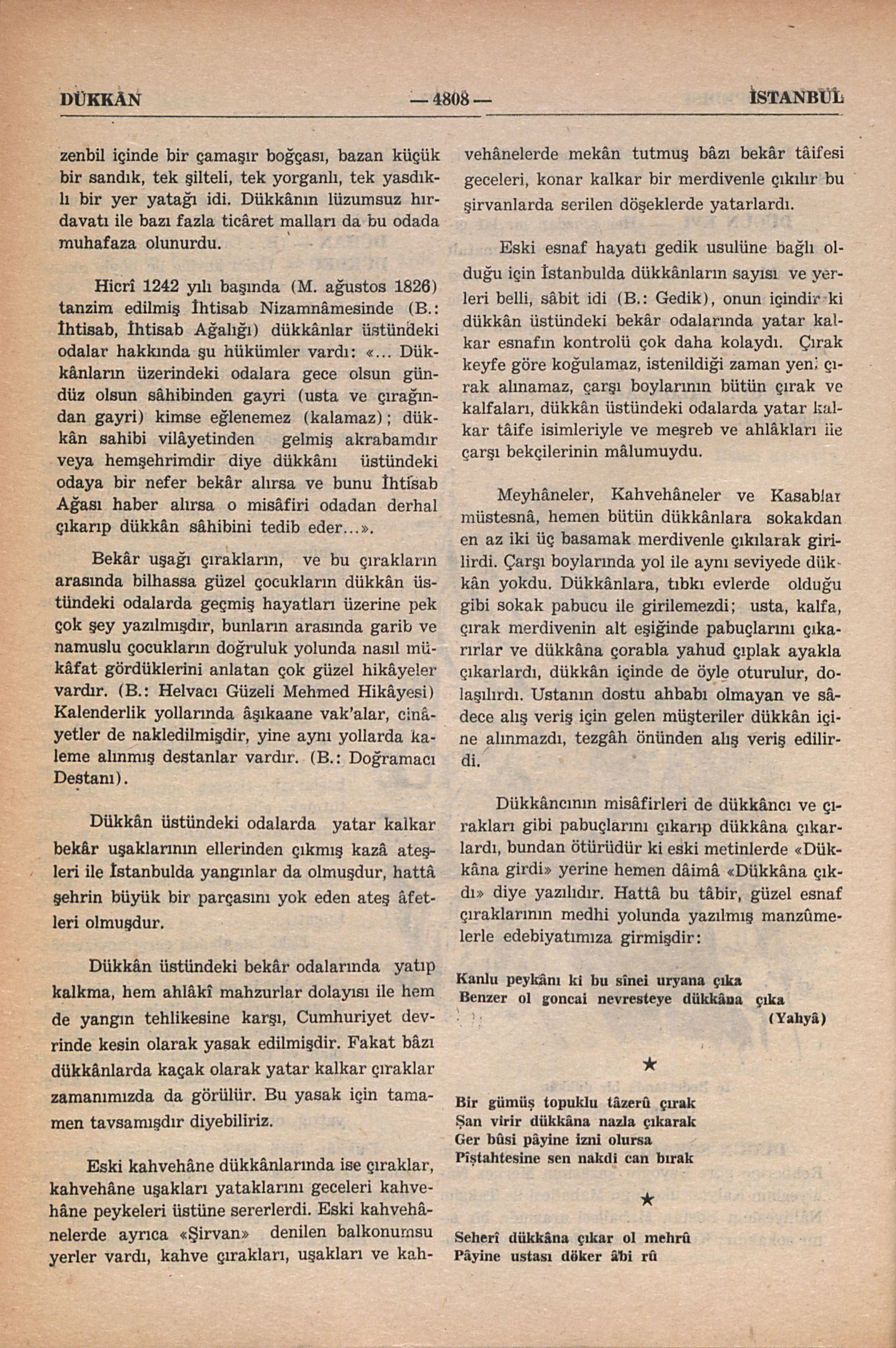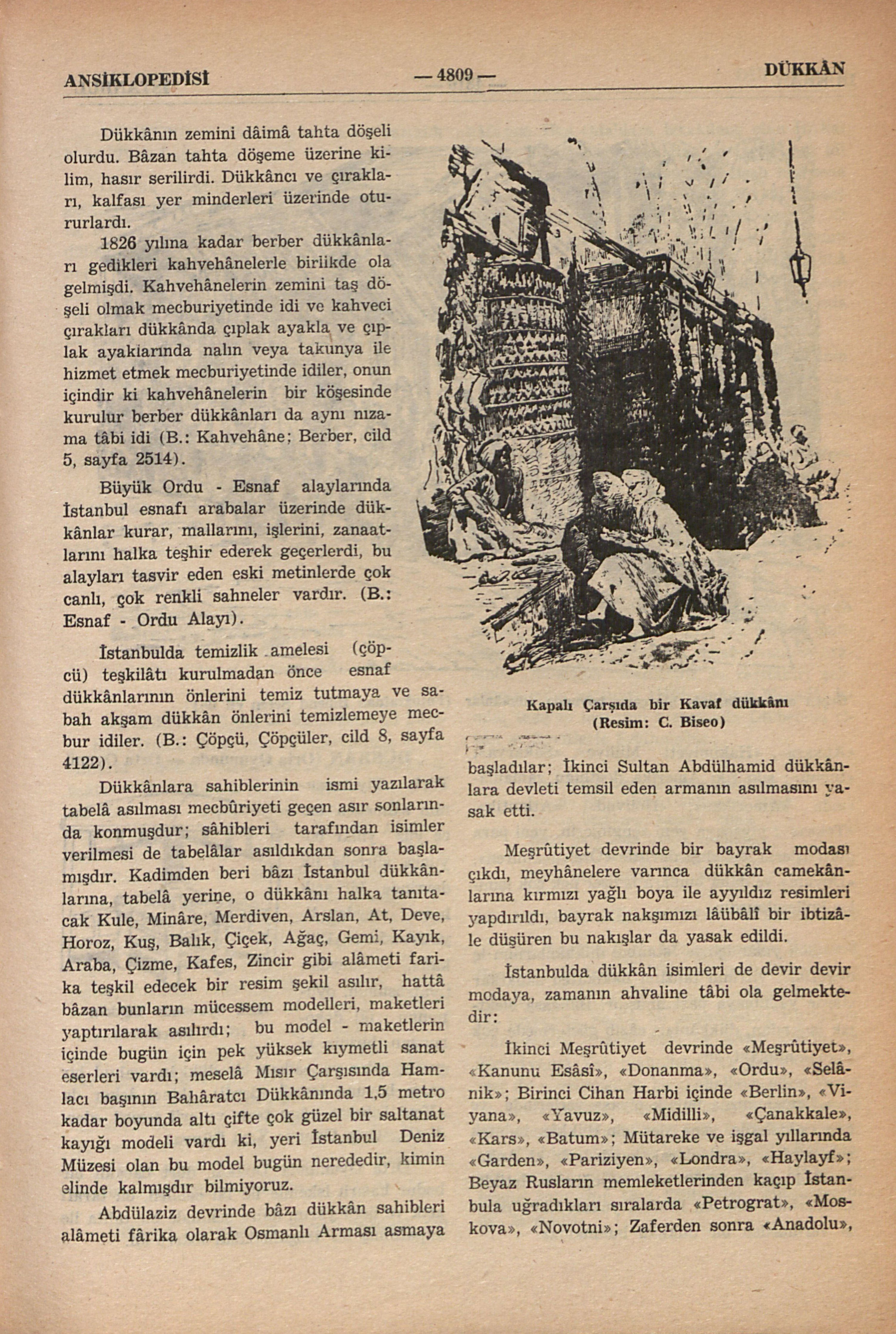 B.: İhtisab, İhtisab Ağalığı; B.: Helvacı Güzeli Mehmed Hikâyesi; B.: Doğramacı Destanı; B.: Gedik; B.: Kahvehâne; Berber, cild 5, sayfa 2514; B.: Esnaf - Ordu Alayı; B.: Çöpçü, Çöpçüler, cild 8, sayfa 4122