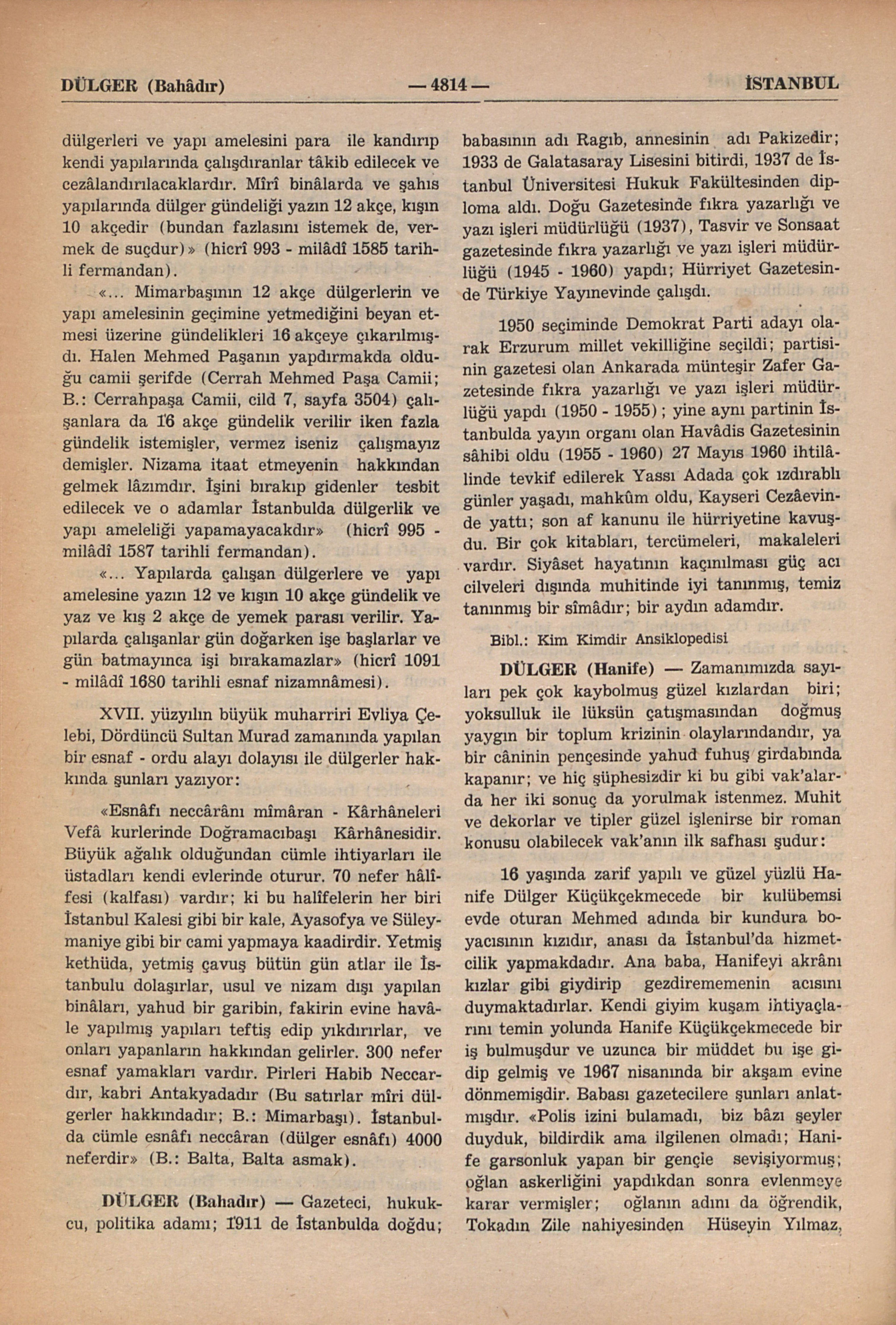 “... (mîrî binâlarda ve büyük kapularında çalışan) dülgerlere ücretleri muntazaman verilir iken bâzı kimseler kendi yapılarında çalışdırmak için fazla gündelik vermeye başlamışlar, dülgerler ile yapı amelesi mîrî binâları bırakıp o gibi yerlerde çalışmaya başlamışlardır, ve mîrî binalar muattal kalmışdır. Bunun sür’atle ve şiddetle önüne geçilecekdir. Mîrî yapıları bırakıp ve paraya tamah edip hâricde çalışanlar, dülgerleri ve yapı amelesini para ile kandırıp kendi yapılarında çalışdıranlar tâkib edilecek ve cezâlandırılacaklardır. Mîrî binâlarda ve şahıs yapılarında dülger gündeliği yazın 12 akçe, kışın 10 akçedir (bundan fazlasını istemek de, vermek de suçdur) (hicrî 993 - milâdî 1585 tarihli fermandan).