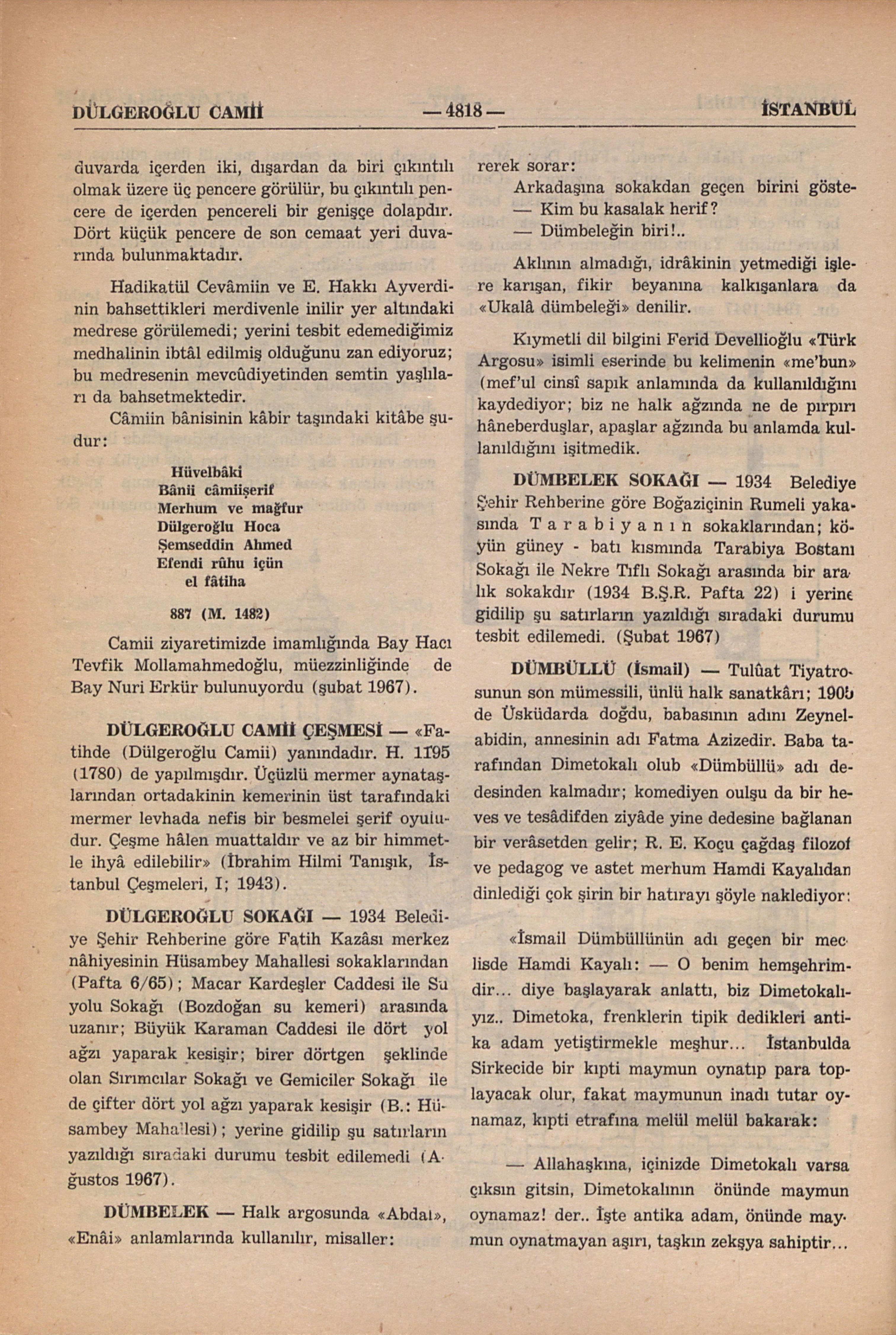 “Fatihde (Dülgeroğlu Camii) yanındadır. H. 1195 (1780) de yapılmışdır. Üçüzlü mermer aynataşlarından ortadakinin kemerinin üst tarafındaki mermer levhada nefis bir besmelei şerif oyuludur. Çeşme hâlen muattaldır ve az bir himmetle ihyâ edilebilir” (İbrahim Hilmi Tanışık, İstanbul Çeşmeleri, I; 1943).