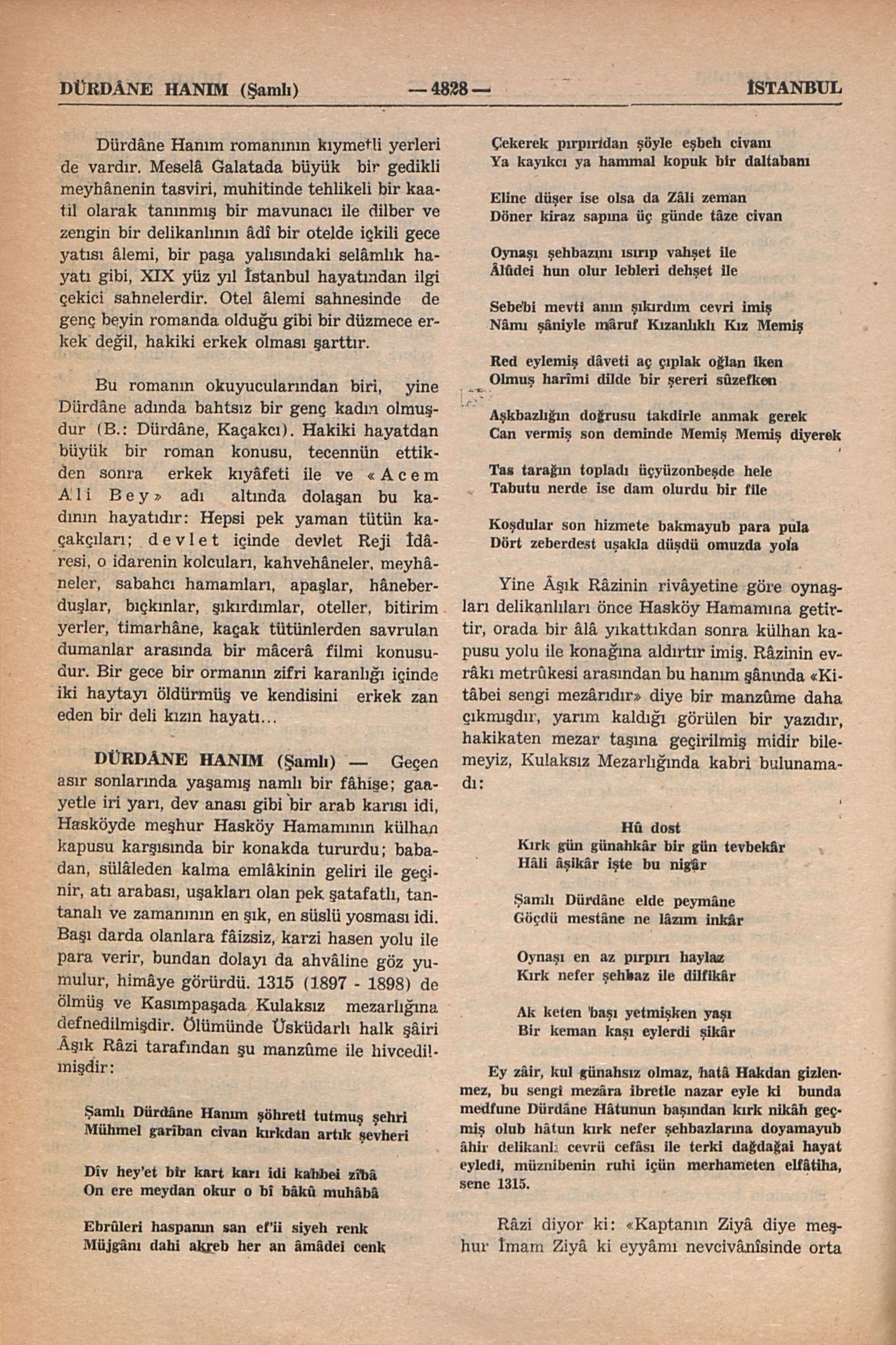 Ey zâir, kul günahsız olmaz, hatâ Hakdan gizlenmez, bu sengi mezâra ibretle nazar eyle ki bunda medfune Dürdâne Hâtunun başından kırk nikâh geçmiş olub hâtun kırk nefer şehbazlarına doyamayub âhir delikanlı cevrü cefâsı ile terki dağdağai hayat eyledi, müznibenin ruhi içün merhameten elfâtiha, sene 1315.