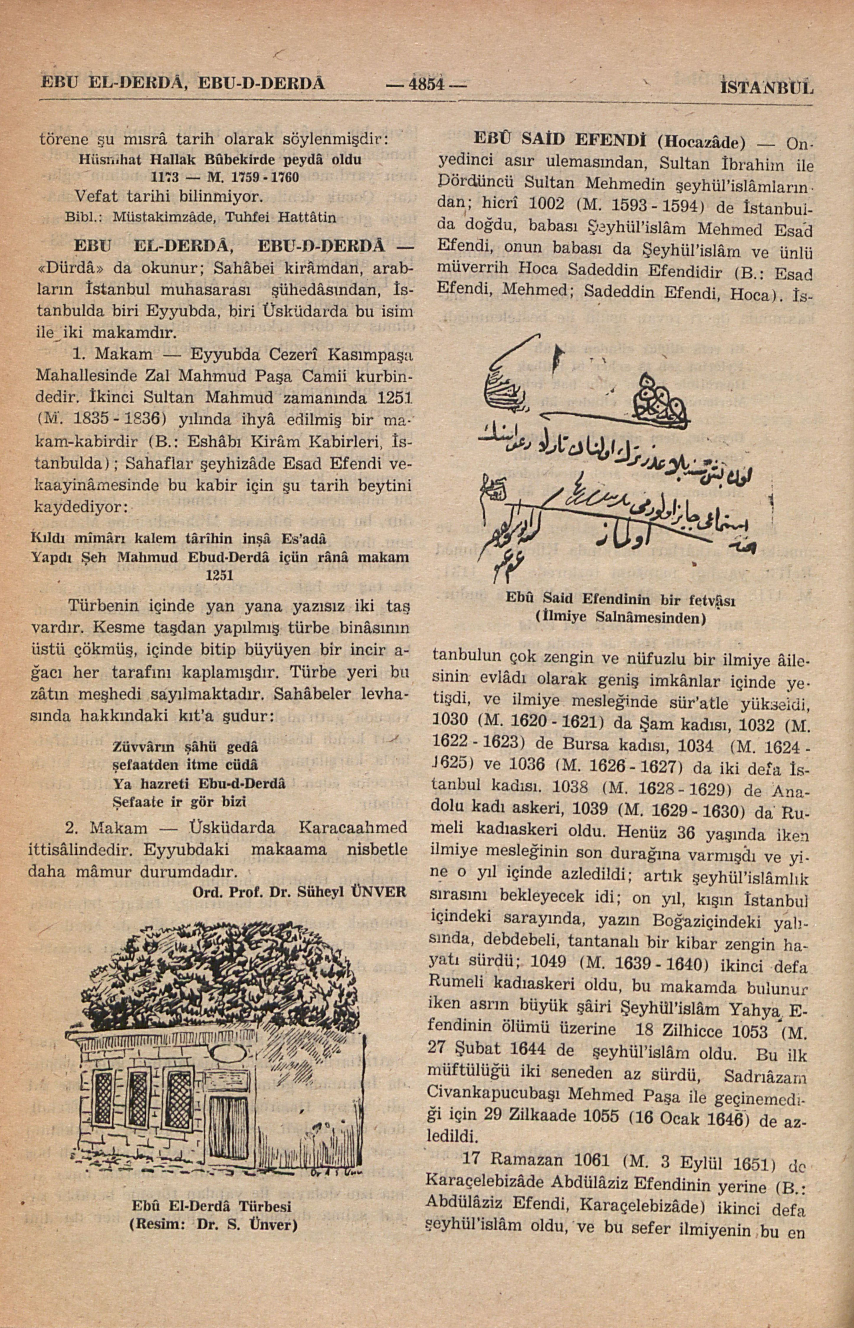 “Dürdâ” da okunur; Sahâbei kirâmdan, arabların İstanbul muhasarası şühedâsından, İstanbulda biri Eyyubda, biri Üsküdarda bu isim ile iki makamdır. 1. Makam — Eyyubda Cezerî Kasımpaşa Mahallesinde Zal Mahmud Paşa Camii kurbindedir. İkinci Sultan Mahmud zamanında 1251 (M. 1835 - 1836) yılında ihyâ edilmiş bir makam-kabirdir (B.: Eshâbı Kirâm Kabirleri, İstanbulda); Sahaflar şeyhizâde Esad Efendi vekaayinâmesinde bu kabir için şu tarih beytini kaydediyor: Kıldı mîmarı kalem târihin inşâ Es’adâ Yapdı Şeh Mahmud Ebud-Derdâ içün rânâ makam 1251 Türbenin içinde yan yana yazısız iki taş vardır. Kesme taşdan yapılmış türbe binâsının üstü çökmüş, içinde bitip büyüyen bir incir ağacı her tarafını kaplamışdır. Türbe yeri bu zâtın meşhedi sayılmaktadır. Sahâbeler levhasında hakkındaki kıt’a şudur: Züvvârın şâhü gedâ şefaatden itme cüdâ Ya hazreti Ebu-d-Derdâ Şefaate ir gör bizi 2. Makam — Üsküdarda Karacaahmed ittisâlindedir. Eyyubdaki makaama nisbetle daha mâmur durumdadır. Ord. Prof. Dr. Süheyl ÜNVER Ebû El-Derdâ Türbesi (Resim: Dr. S. Ünver)