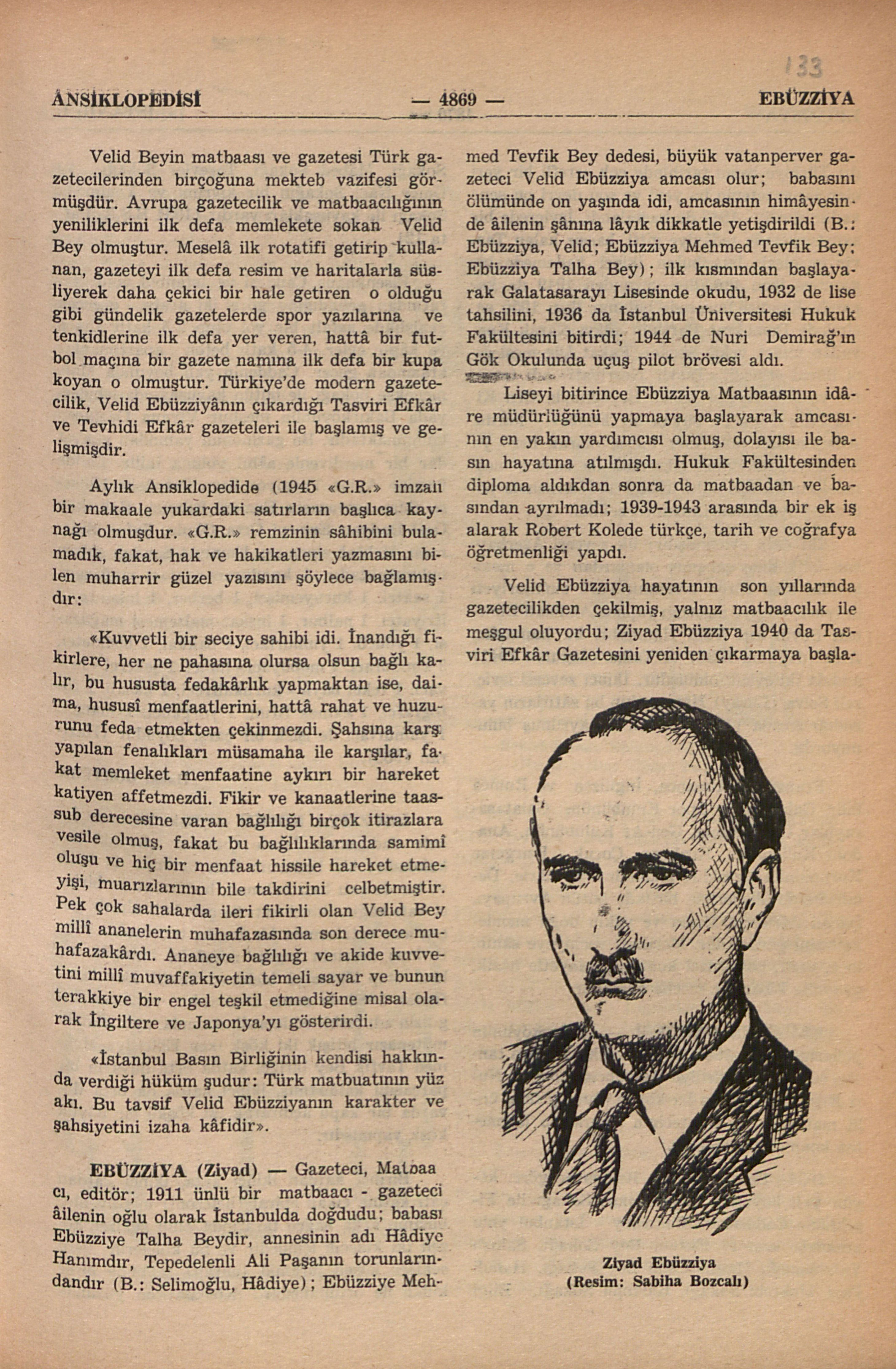 Gazeteci, Matbaacı, editör; 1911 ünlü bir matbaacı - gazeteci âilenin oğlu olarak İstanbulda doğdudu; babası Ebüzziye Talha Beydir, annesinin adı Hâdiye Hanımdır, Tepedelenli Ali Paşanın torunlarındandır (B.: Selimoğlu, Hâdiye); Ebüzziye Mehmed Tevfik Bey dedesi, büyük vatanperver gazeteci Velid Ebüzziya amcası olur; babasını ölümünde on yaşında idi, amcasının himâyesinde âilenin şânına lâyık dikkatle yetişdirildi (B.: Ebüzziya, Velid; Ebüzziya Mehmed Tevfik Bey; Ebüzziya Talha Bey); ilk kısmından başlayarak Galatasarayı Lisesinde okudu, 1932 de lise tahsilini, 1936 da İstanbul Üniversitesi Hukuk Fakültesini bitirdi; 1944 de Nuri Demirağ’ın Gök Okulunda uçuş pilot brövesi aldı.