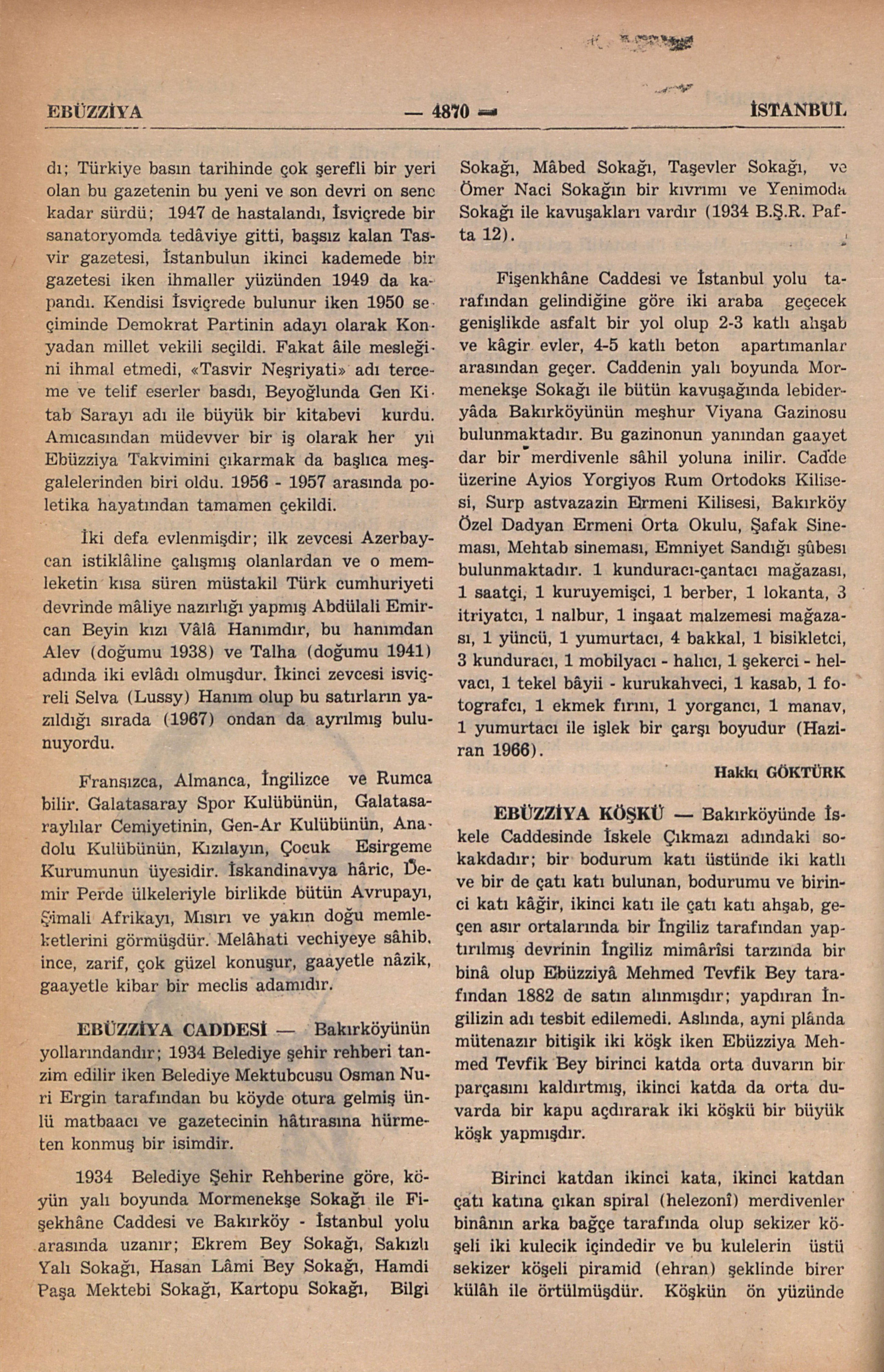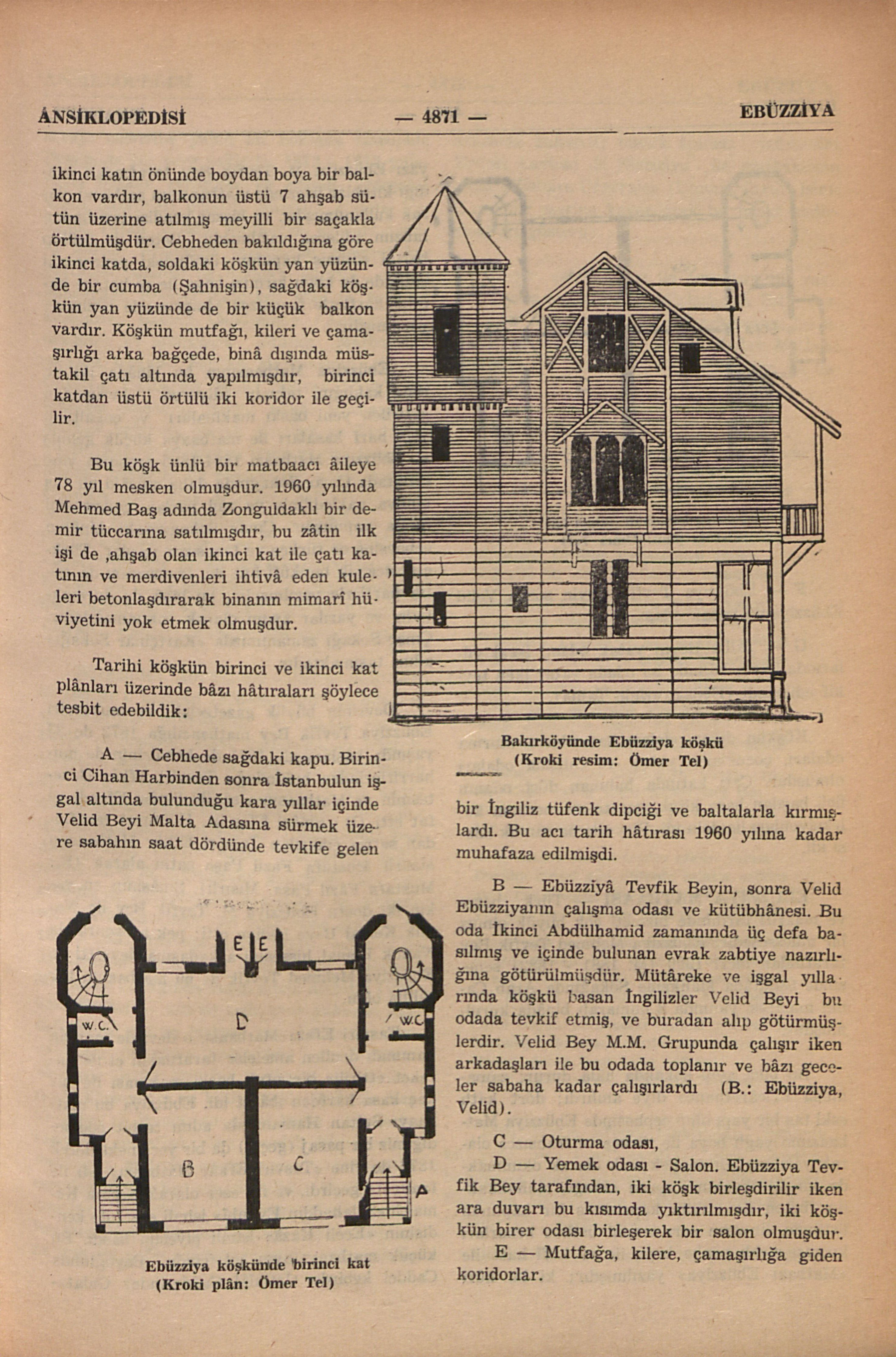 Bakırköyünde İskele Caddesinde İskele Çıkmazı adındaki sokakdadır; bir bodurum katı üstünde iki katlı ve bir de çatı katı bulunan, bodurumu ve birinci katı kâğir, ikinci katı ile çatı katı ahşab, geçen asır ortalarında bir İngiliz tarafından yaptırılmış devrinin İngiliz mimârîsi tarzında bir binâ olup Ebüzziyâ Mehmed Tevfik Bey tarafından 1882 de satın alınmışdır; yapdıran İngilizin adı tesbit edilemedi. Aslında, ayni plânda mütenazır bitişik iki köşk iken Ebüzziya Mehmed Tevfik Bey birinci yatda orta duvarın bir parçasını kaldırtmış, ikinci katda da orta duvarda bir kapu açdırarak iki köşkü bir büyük köşk yapmışdır.