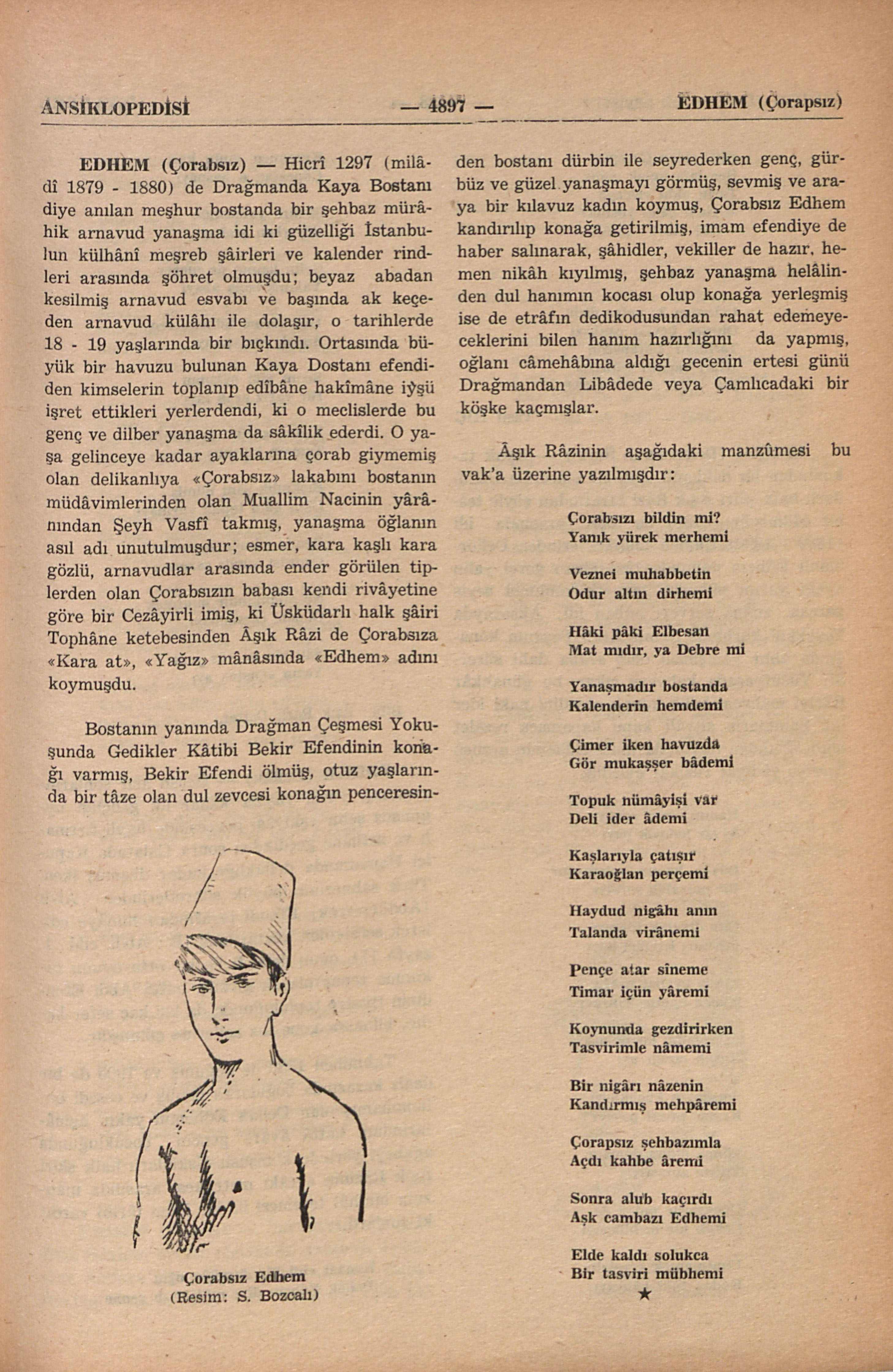 Hicrî 1297 (milâdî 1879 - 1880) de Drağmanda Kaya Bostanı diye anılan meşhur bostanda bir şehbaz mürâhik arnavud yanaşma idi ki güzelliği İstanbulun külhânî meşreb şâirleri ve kalender rindleri arasında şöhret olmuşdu; beyaz abadan kesilmiş arnavud esvabı ve başında ak keçeden arnavud külâhı ile dolaşır, o tarihlerde 18 - 19 yaşlarında bir bıçkındı. Ortasında büyük bir havuzu bulunan Kaya Dostanı efendiden kimselerin toplanıp edîbâne hakîmâne iyşü işret ettikleri yerlerdendi, ki o meclislerde bu genç ve dilber yanaşma da sâkîlik ederdi. O yaşa gelinceye kadar ayaklarına çorab giymemiş olan delikanlıya “Çorabsız” lakabını bostanın müdâvimlerinden olan Muallim Nacinin yârânından Şeyh Vasfî takmış, yanaşma öğlanın asıl adı unutulmuşdur; esmer, kara kaşlı kara gözlü, arnavudlar arasında ender görülen tiplerden olan Çorabsızın babası kendi rivâyetine göre bir Cezâyirli imiş, ki Üsküdarlı halk şâiri Tophâne ketebesinden Âşık Râzi de Çorabsıza “Kara at”, “Yağız” mânâsında “Edhem” adını koymuşdu.