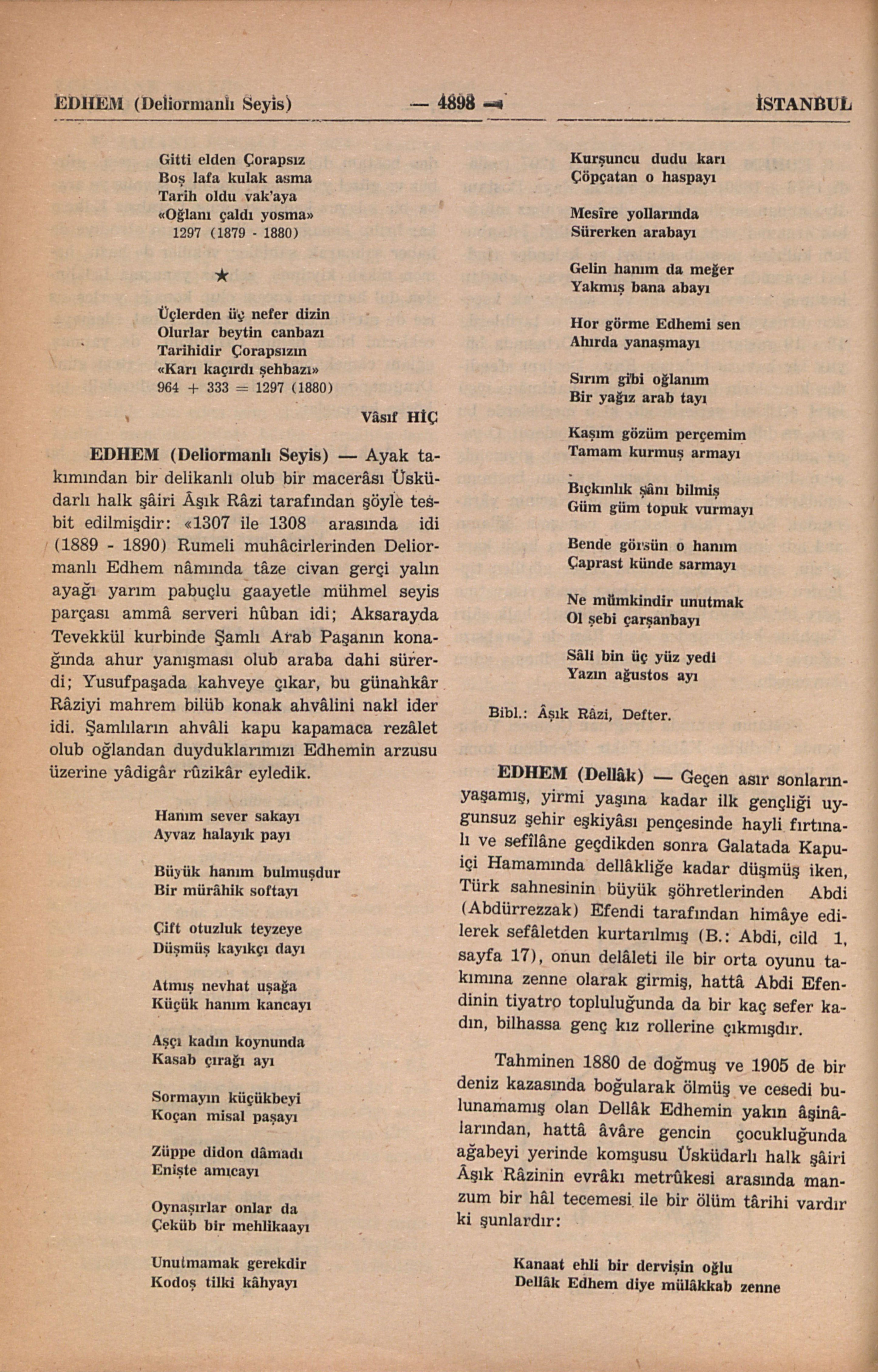Geçen asır sonlarında yaşamış, yirmi yaşına kadar ilk gençliği uygunsuz şehir eşkiyâsı pençesinde hayli fırtınalı ve sefîlâne geçdikden sonra Galatada Kapuiçi Hamamında dellâkliğe kadar düşmüş iken, Türk sahnesinin büyük şöhretlerinden Abdi (Abdürrezzak) Efendi tarafından himâye edilerek sefâletden kurtarılmış (B.: Abdi, cild 1, sayfa 17), onun delâleti ile bir orta oyunu takımına zenne olarak girmiş, hattâ Abdi Efendinin tiyatro topluluğunda da bir kaç sefer kadın, bilhassa genç kız rollerine çıkmışdır. Tahminen 1880 de doğmuş ve 1905 de bir deniz kazasında boğularak ölmüş ve cesedi bulunanamış olan Dellâk Edhemin yakın âşinâlarından, hattâ âvâre gencin çocukluğunda ağabeyi yerinde komşusu Üsküdarlı halk şâiri Âşık Râzinin evrâkı metrûkesi arasında manzum bir hâl tercemesi ile bir ölüm târihi vardır ki şunlardır: Kanaat ehli bir dervişin oğlu Dellâk Edhem diye mülâkkab zenne Şehri Üsküdardan kapu komşumuz Ülfetimiz vardır birâderâne Aman ne de güzel gonca gül misal Muattar ve nâzik bir civan idi Rûhi habis gibi eyledi hulûl Edheme Piç Hasan denilen gidi Atmaca kuzguna kaptırdı yazık Hamâmei hüsnü şebâbı oğlan Bilemeyüb kendi kadrü kiymetin Genci iffetini ittirdi talan Galata Tophâne Salıpazarı Dolaşdı bir eyyam eşirrâ ile Çul çaput içinde hem bürehne pâ Kurşun attırdılar tek meteliğe Âhir câyi halâs germâbe diyüb Varub savunmuşdu Kapuiçinde Târihin yakînen îdemem beyan Ya üçyüz ondört ya on beş içinde Koca Abdürrezzak Efendi bir gün Varub gördükde ol tâze dellâki Öyle bir müstesnâ şehrî dilberin Sukuutun almamış aklü idrâki Nükuuşi hüsnüne zerâfetine Hem yâlü bâline çâlâk çıplağın Değer behâsını biçerek demiş Yürü gel toplayub tasın tarağın Efendim bu Dellâk Edhem üstüne Zenne ne gelmişdir ne de gelecek Gülpenbe ferâce ak yaşmak ile Cihan kasem ider kız deyû gerçek Tarihi Kazâ Zannım cerîdeler yazdı kazâyı Nasıl gaaib ettik o mehlikaayı Yirmidört numara Rüchan Vapuru Bir kayık batırdı ağustos ayı Üç nefer yolcunun hepsi boğuldu Kurtulan can yalnız kayıkçı dayı Dellâk Edhem civan oyuncu zenne Tuttu o kazâda râhi ukbâyı Zenne şöhretiyle mücevher târih “Cây idindi oğlan ka’ri deryâyı” 1266 + 57 = 1323 (1905) Vâsıf HİÇ