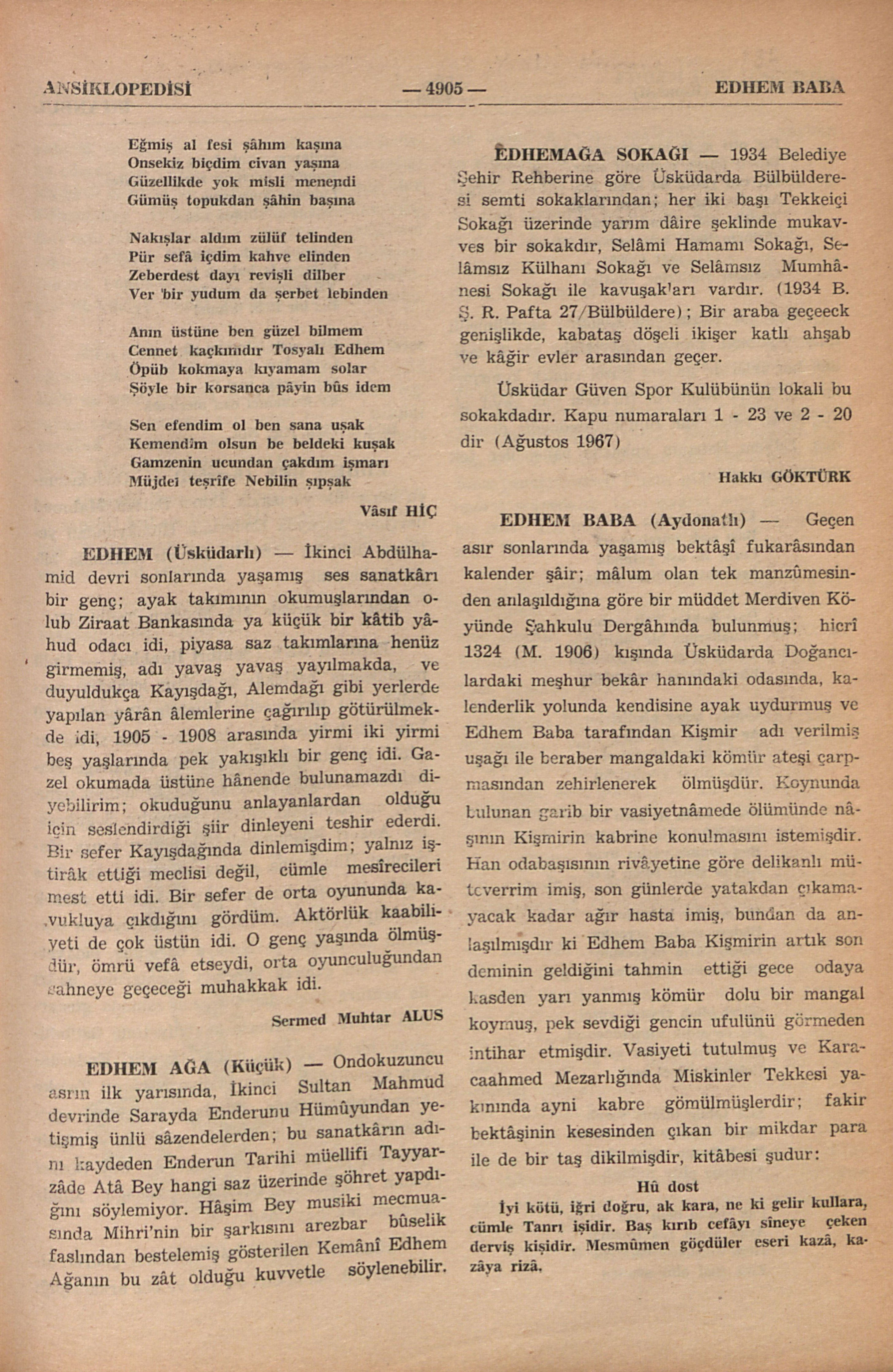 Ondokuzuncu asrın ilk yarısında, İkinci Sultan Mahmud devrinde Sarayda Enderunu Hümâyundan yetişmiş ünlü sâzendelerden; bu sanatkârın adını kaydeden Enderun Tarihi müellifi Tayyarzâde Atâ Bey hangi saz üzerinde şöhret yapdığını söylemiyor. Hâşim Bey musiki mecmuasında Mihri’nin bir şarkısını arezbar bûselik faslından bestelemiş gösterilen Kemânî Edhem Ağanın bu zât olduğu kuvvetle söylenebilir.