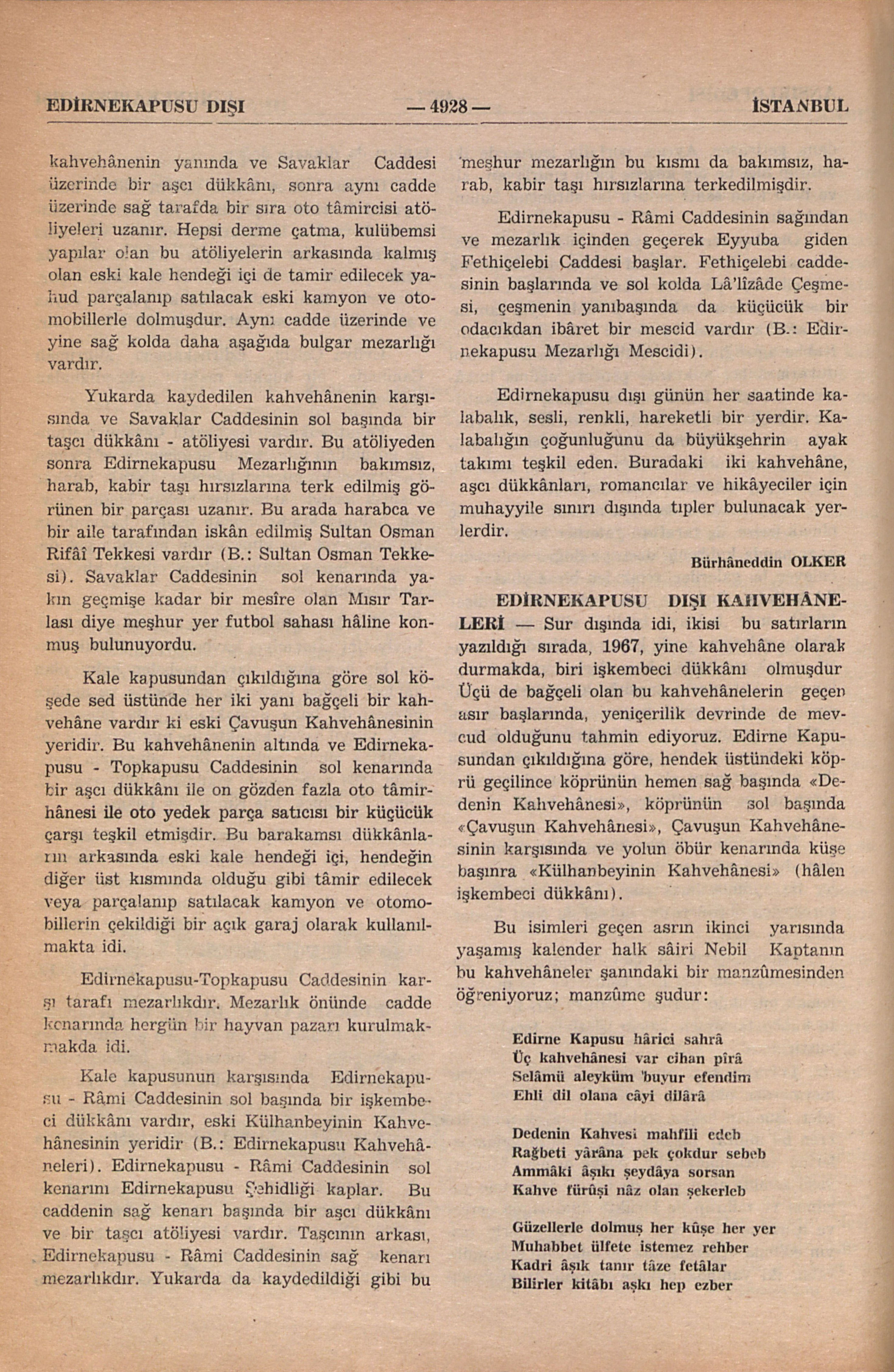 Edirnekapusunun dışı İstanbulun en eski ve en büyük bir mezarlığıdır, ve bu mezarlığın başlangıcında, kale kapusu önünde küçük bir çarşı boyu vardır. Aşağıdaki notlar 1967 yılı kasım ayında tesbit edilmişdir: Kapudan çıkınca hemen sağ tarafda iki harakada bir manav ve bir büfe, tekel bâyii vardır. Onnu yanında bağçeli büyük bir kahvehâne vardır ki Dedenin Kahvehânesi diye meşhur eski bir kahvehânenin yerindedir. Bu kahvehânenin yanında ve Savaklar Caddesi üzerinde bir aşcı dükkânı, sonra aynı cadde üzerinde sağ tarafda bir sıra oto tâmircisi atöliyeleri uzanır. Hepsi derme çatma kulübemsi yapılar olan bu atöliyelerin arkasında kalmış olan eski kale hendeği içi de tamir edilecek yahud parçalanıp satılacak eski kamyon ve otomobillerle dolmuşdur. Aynı cadde üzerinde ve yine sağ kolda daha aşağıda bulgar mezarlığı vardır. Yukarda kaydedilen kahvehânenin karşısında ve Savaklar Caddesinin sol başında bir taşcı dükkânı - atöliyesi vardır. Bu atöliyeden sonra Edirnekapusu Mezarlığının bakımsız, harab, kabir taşı hırsızlarına terk edilmiş görünen bir parçası uzanır. Bu arada harabca ve bir aile tarafından iskân edilmiş Sultan Osman Rifâî Tekkesi vardır (B.: Sultan Osman Tekkesi). Savaklar Caddesinin sol kenarında yakın geçmişe kadar bir mesîre olan Mısır Tarlası diye meşhur yer futbol sah...