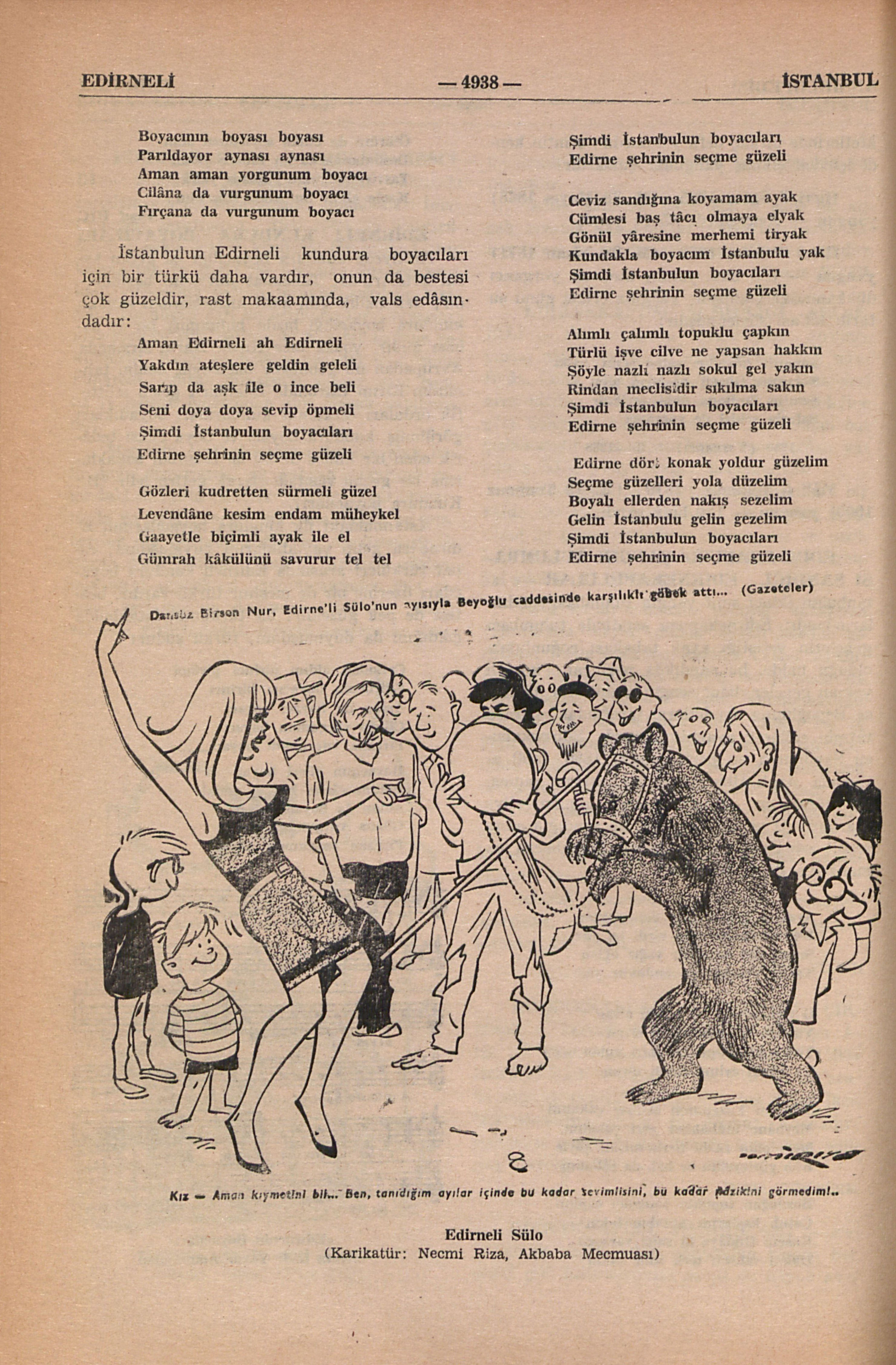 İstanbuldaki ilk kundura boyacılarının Edirneden gelip yayıldıklarını duymuşdum; esnaf türküleri arasında Edirneli kundura boyacıları üzerine bir de meşhur türkü vardır, bestesi de pek güzeldir; bu türkünün İstanbulda çıkdığını da duymuşdum; türkü şudur:
